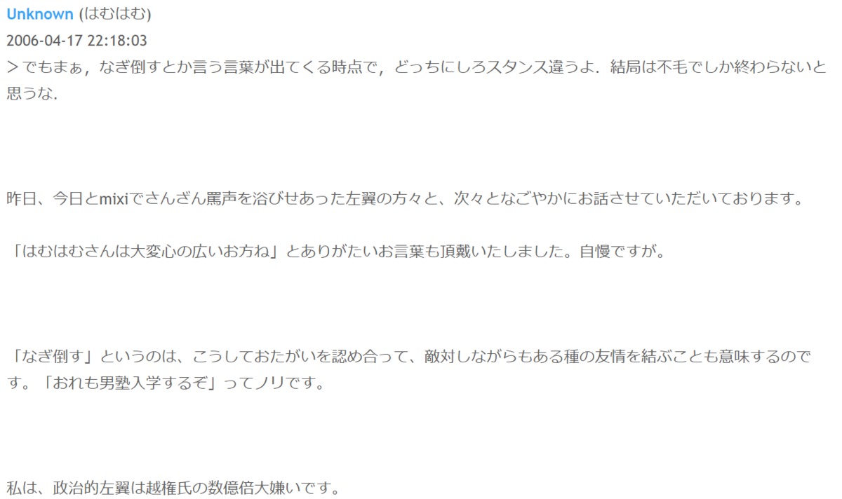 ううむ……ここでもHN【はむはむ】はmixiで激しい論戦を交わしていたという華々しい戦果を、一々訊かれた訳でも無いのに披露しておられます。当時、亀田センセイとの議論にお付き合いした左派の論敵の方々にも、わざわざ謝意を表していました。その殊勝な態度も賞賛を集めたようです。もとより、亀田センセイの自慢話を、鵜吞みにするのは危険な側面もありますが。