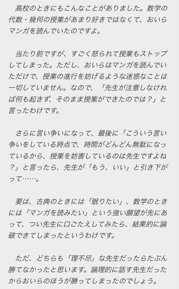 青識亜論もまるっきり同じ〝武勇伝〟を自慢気に語っていて、やっぱり子供の頃にいったんそこは大人が責任持って丁寧に折っておかないと無意味に全能感だけ肥大化させたモンスターを生み出してしまうので結果的に社会にとっては良くないんじゃないかなと思いました。 https://t.co/HvCxmB2JEE