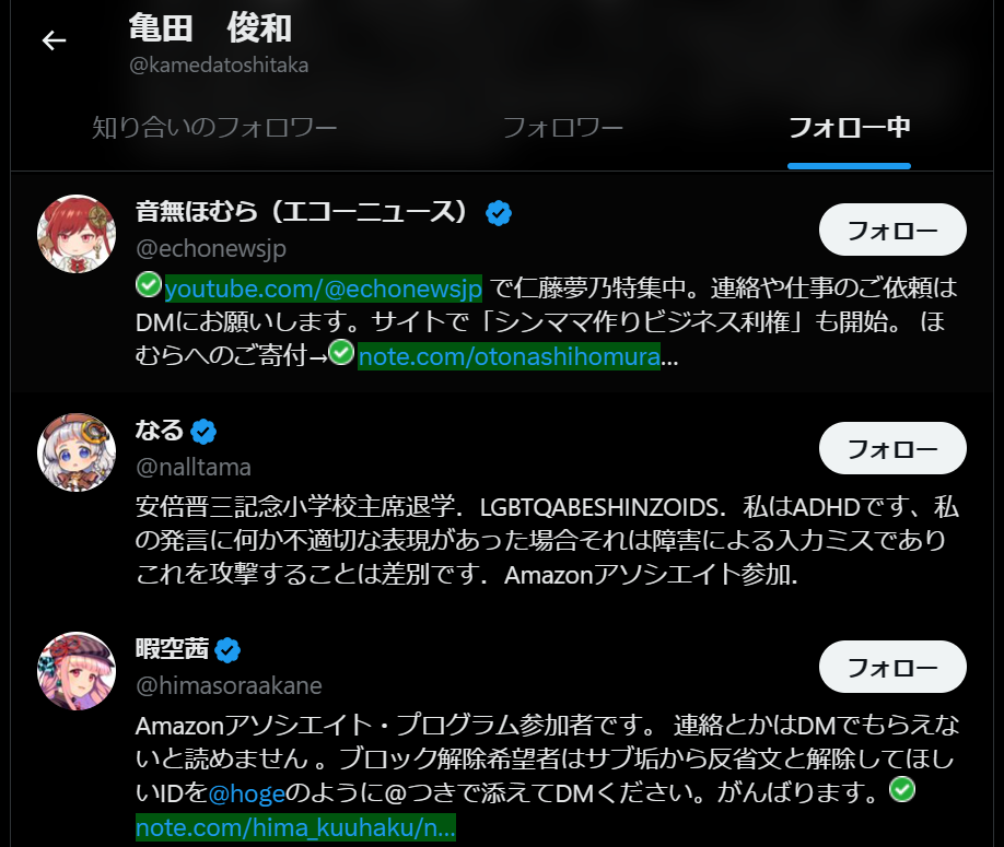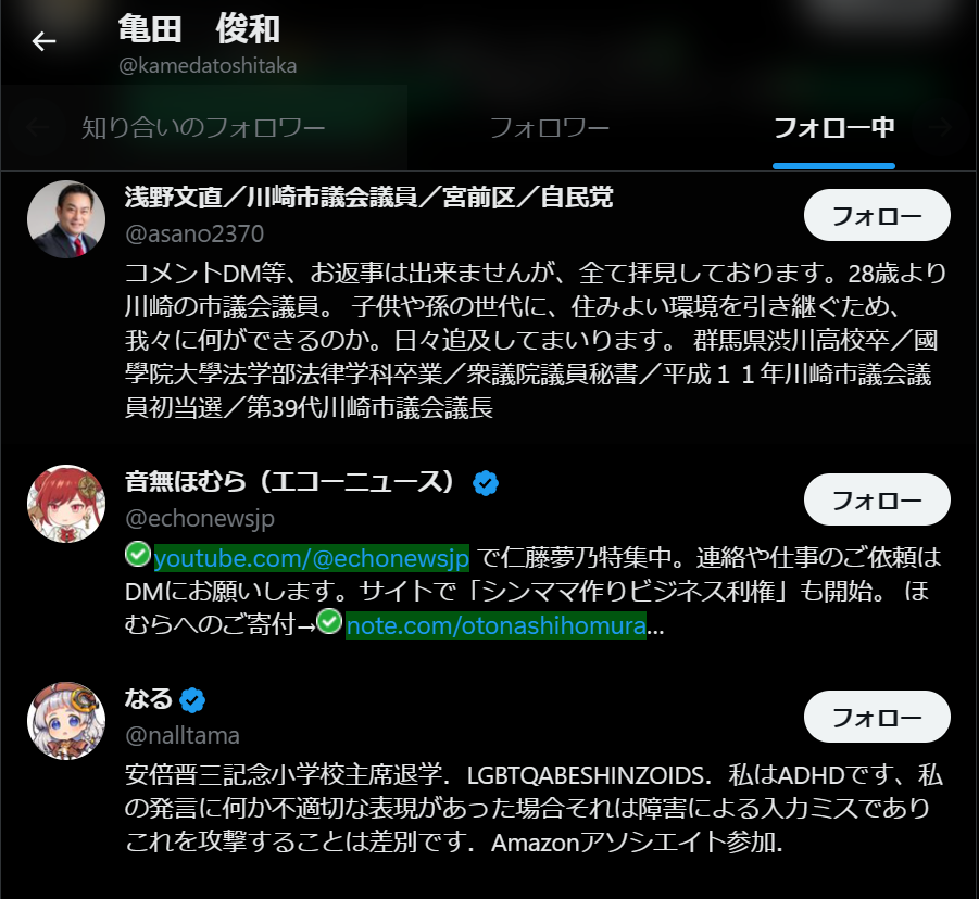 ・後付けで恐縮ながら……亀田センセイは、な、な、何とあの暇アノン事件の中心人物というか、中核らしい一味のことも、ツイッターでフォローしておられました。対照的に、Colabo関係者などは殆どフォローしていない模様です。