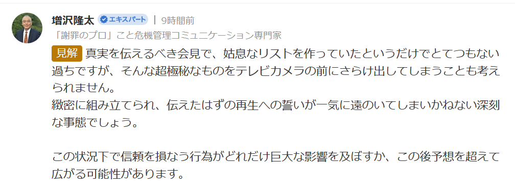 たとえば、広島サミットのあと岸田首相が記者会見を切り上げたときに「逃げるのか!」って言ってた記者はキチガイでしかない。あの時の岸田首相はスケジュールも詰まってて質問を制限したり記者会見を切り上げる理由があった。でも、今回のジャニーズ会見にそういう、質問制限を正当化できる理由はない
