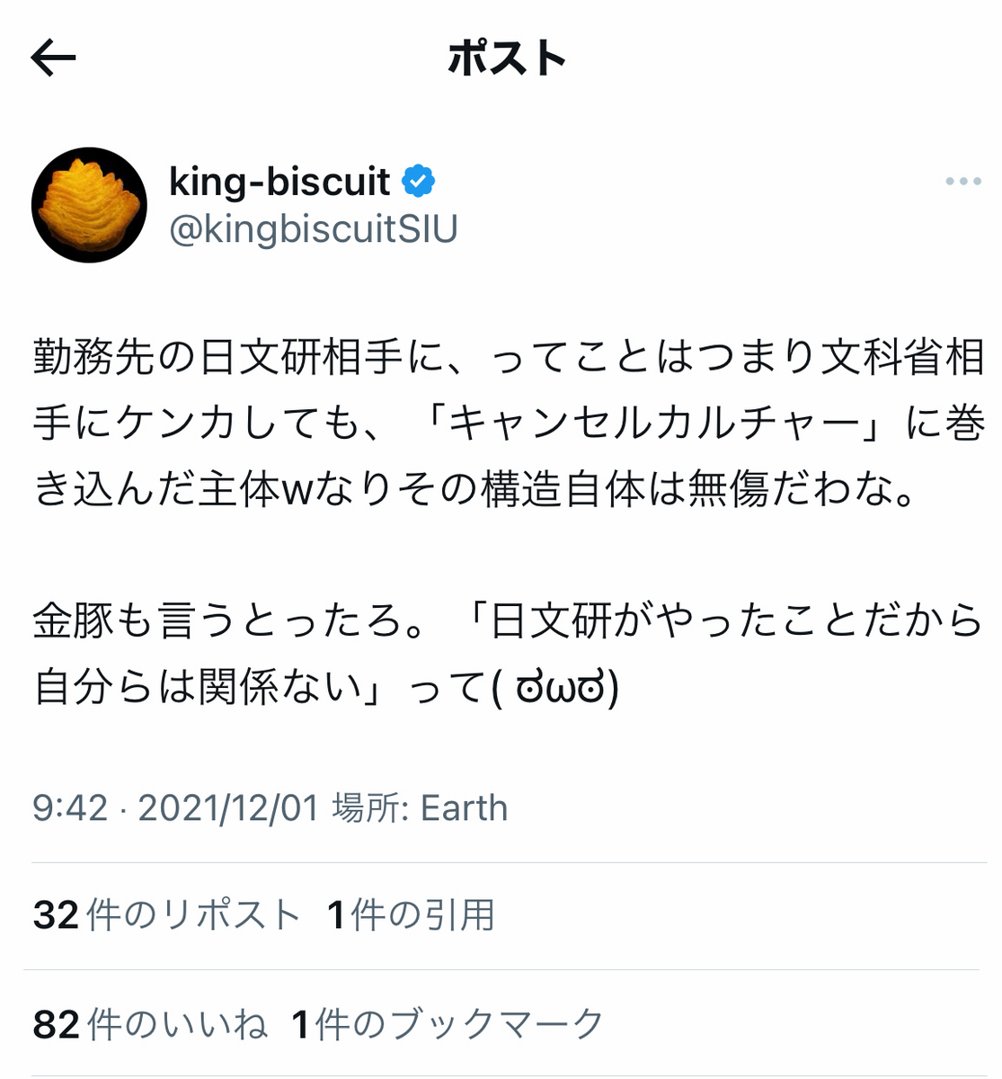 言うまでもなく、呉座氏が日文研から処分を喰らったのは……結果論であれ、フォロワー5000人規模の鍵垢に身を潜めて、長年に渡って全方位に石を投げまくってしまったツイッター(現X)の投稿が問題視されたからであり、オープンレター云々のせいではありませんでした。