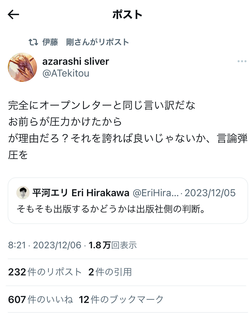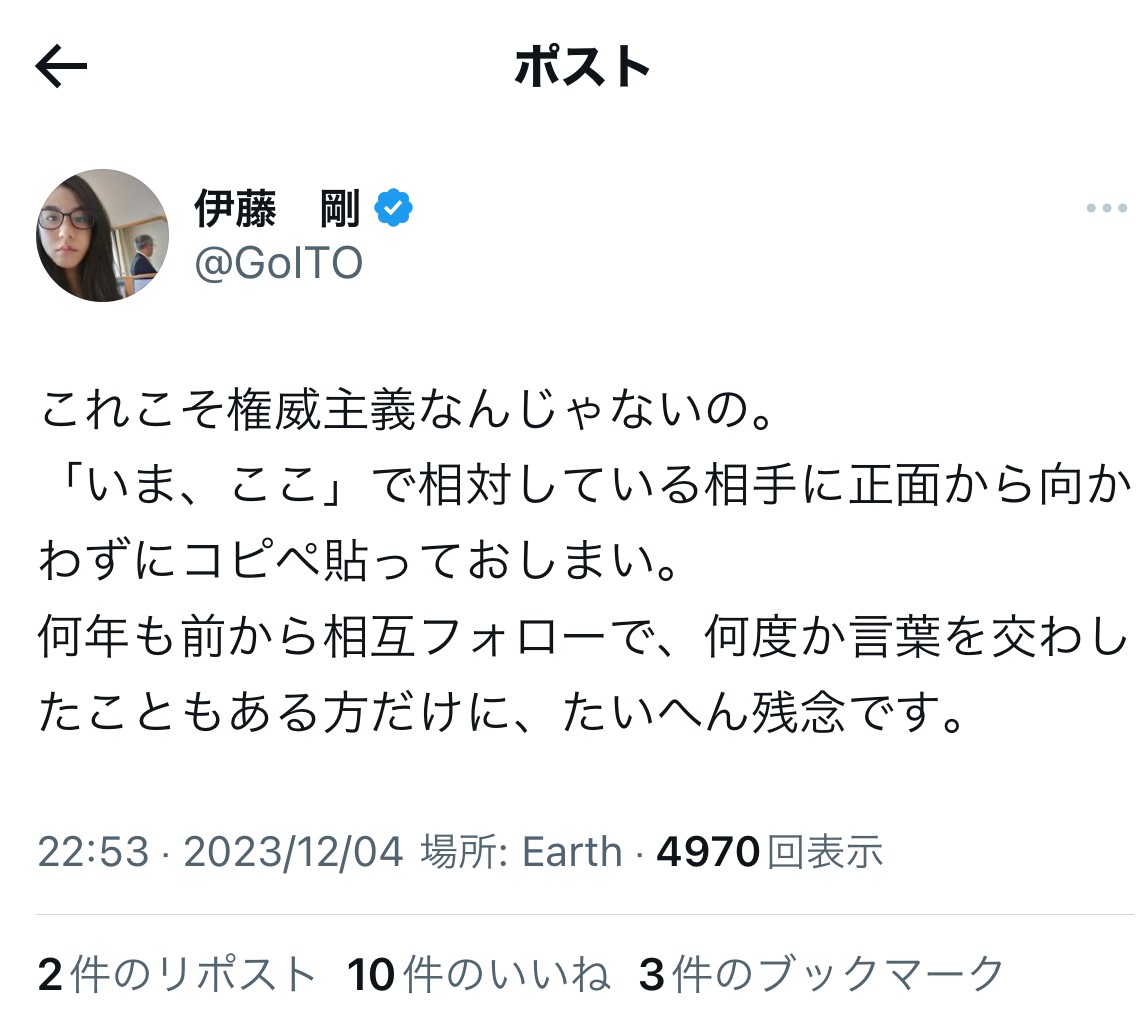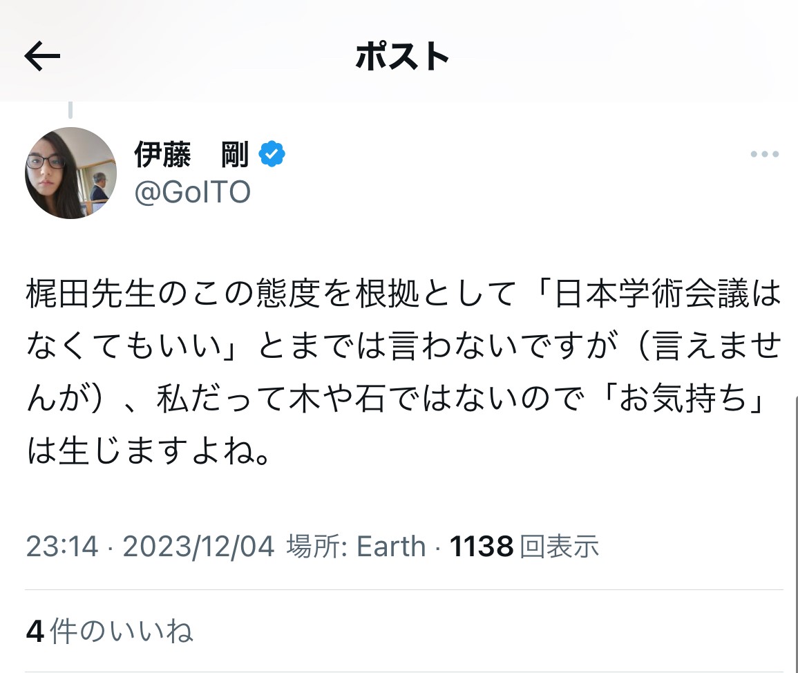 反トランス本の出版中止騒動に便乗してなのかは不明ですが……またもやオープンレター関係者の隠岐さや香氏に対し、ド派手な「武勇伝」をご披露していたらしい伊藤氏でした。