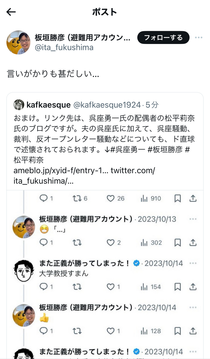 私事で恐縮ながら、下記で取り上げているように少し前、反オープンレターズ「呉座神聖十字軍」の「トリニティ」の板垣勝彦氏にXで引用ポストをしたところ、ちょっとした一悶着もありました。