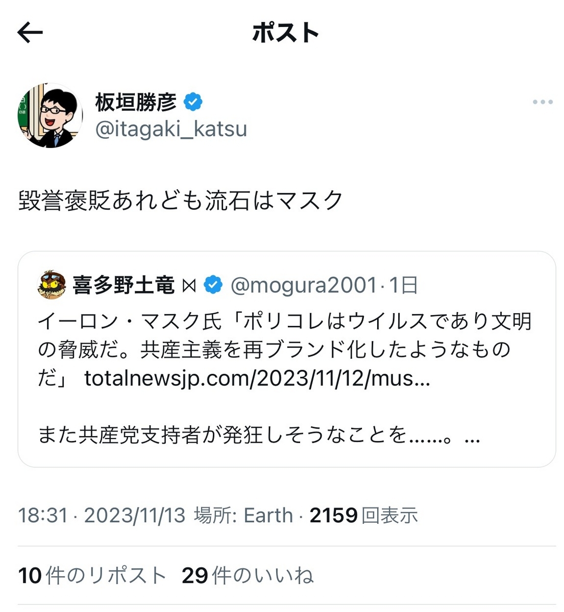 旧聞に属しますが、一時期、板垣氏らがジャニウヨ陰謀論(?)などで謎の盛り上がりをみせていたらしいのをXで指摘したところ、光の速さでブロックされました。