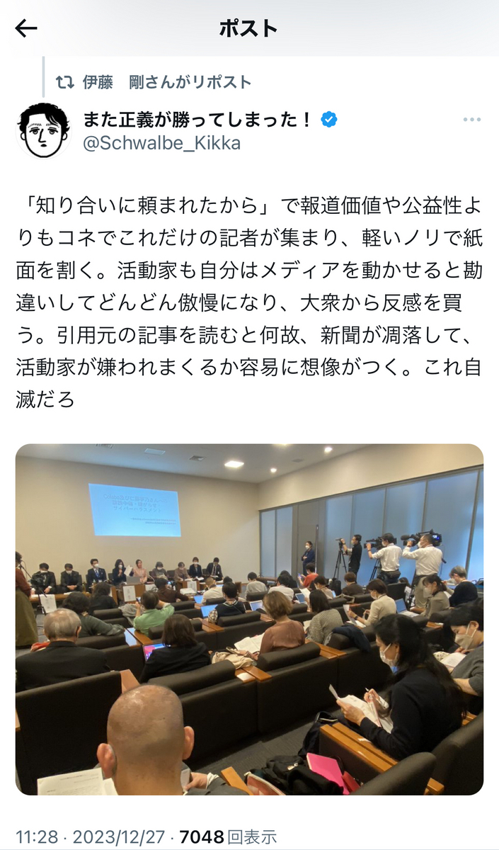 上記のジャニウヨ陰謀論(?)で謎の盛り上がりをしていた垢の、暇アノン界隈での陰謀論めいたポストの他、同様にマスゴミ憎し(?)を拗らせたような別垢のポストもリポストしている辺り、伊藤氏ご本人もまた……!?
