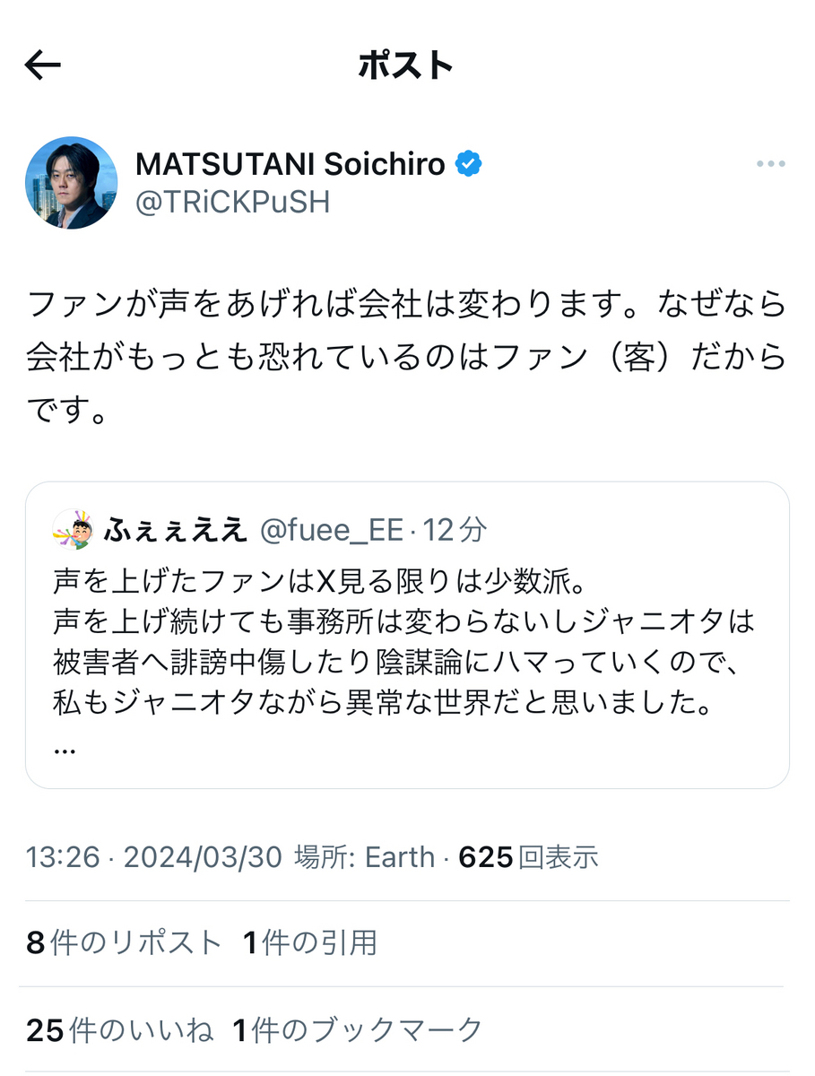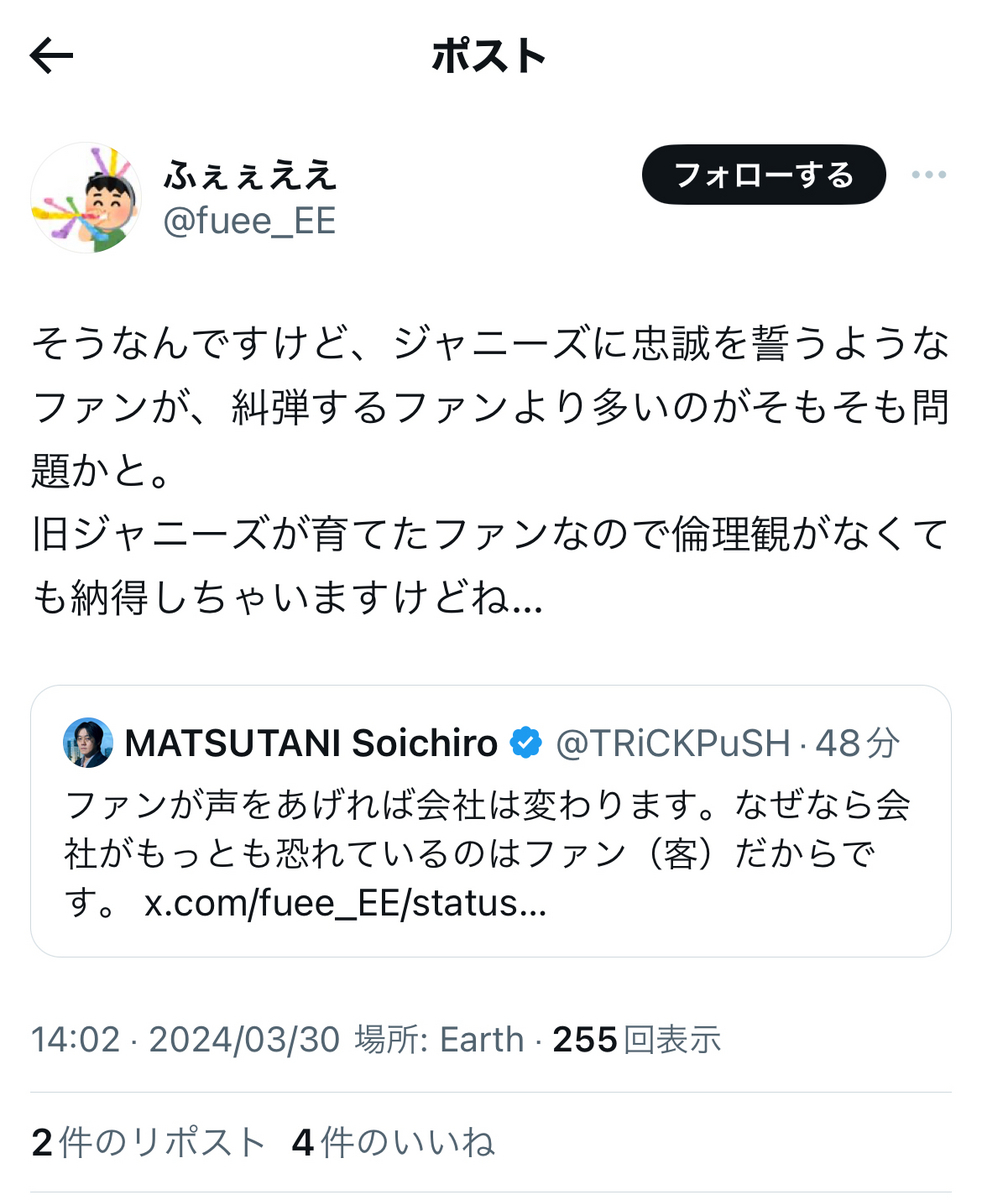 余談ながら、尚も被害者たちへの二次加害に血道を上げているセカンドレイパーたち……上記のジャニウヨ(?)界隈の反応等は次回以降に。