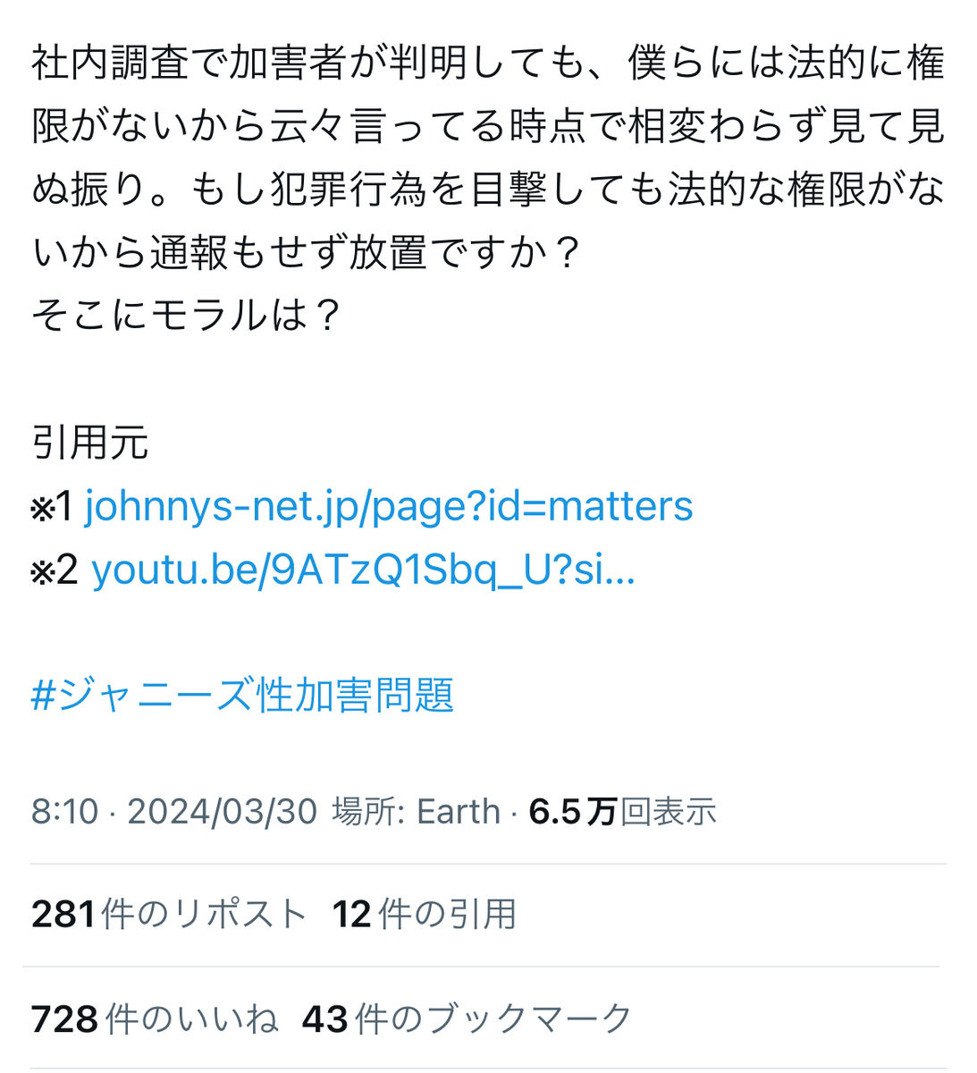まあ、昨年、BBCのドキュメンタリー第一弾「J-POPの捕食者 秘められたスキャンダル」の放映以来、ジャニウヨ界隈(?)をチラホラとヲチしていた自分からすると……怒るには値しますが、驚くには値しないグロテスクで醜悪な「現実」のオンパレードだったかと思いますが。