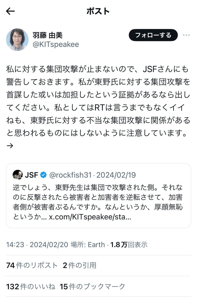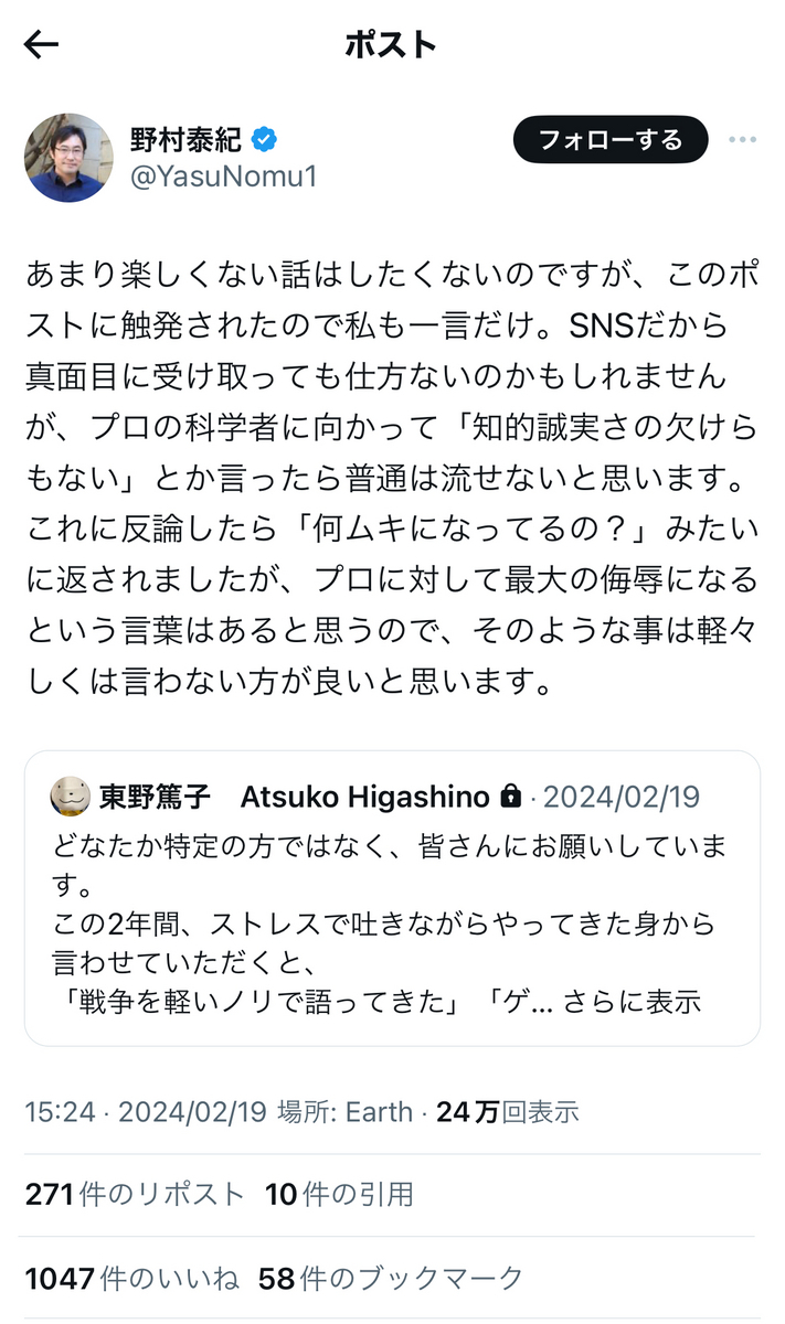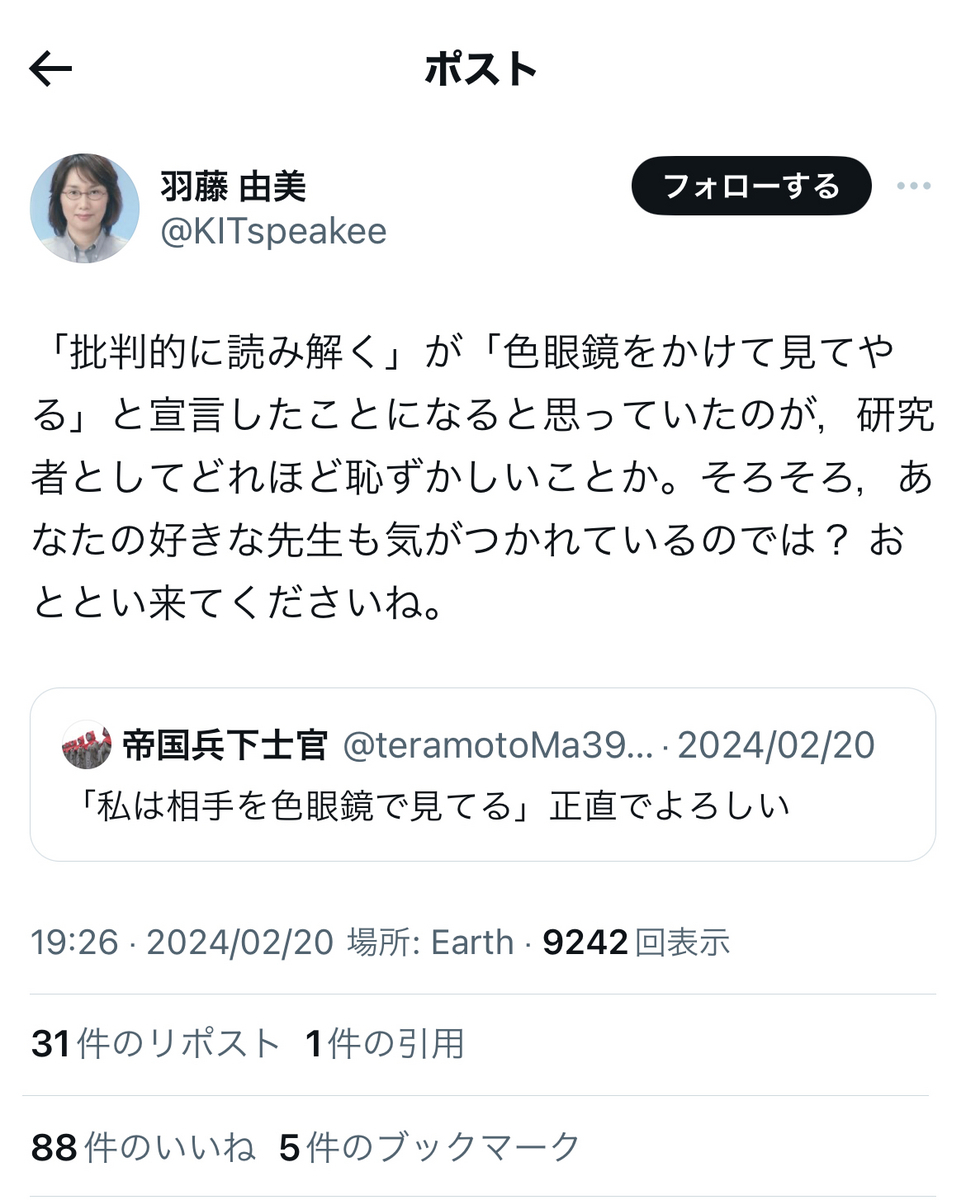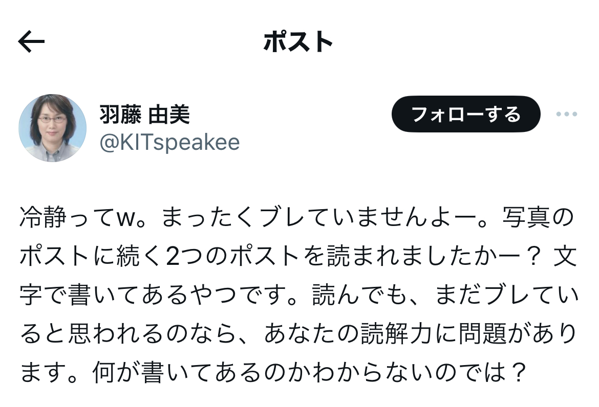 鶴見氏への批判の内容も多いけれど、一番の問題は、東大という日本の権威の象徴たる最高学府の教授が、自身が他人を貶すことにご熱心で、自身が貶されるとブロックしたりと、権威に対する品位のなさを嘆いた引用だと思う。