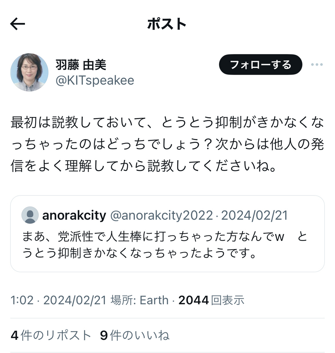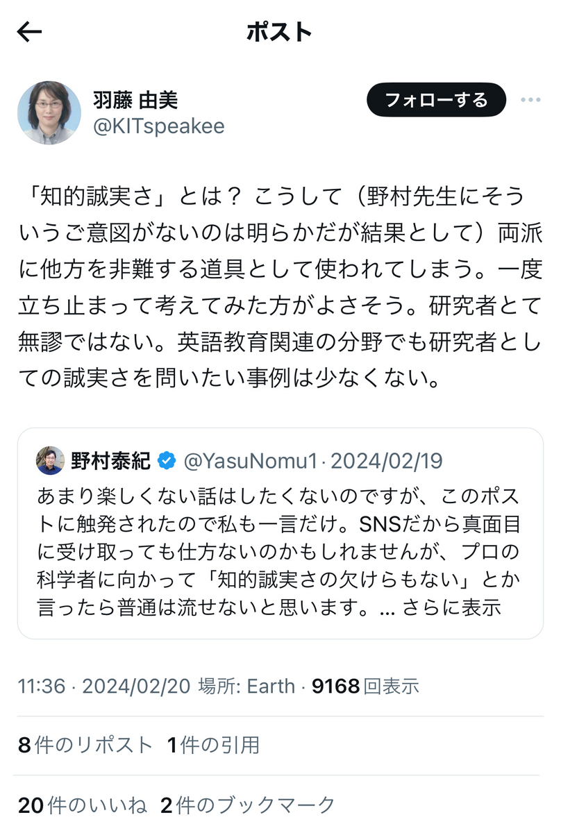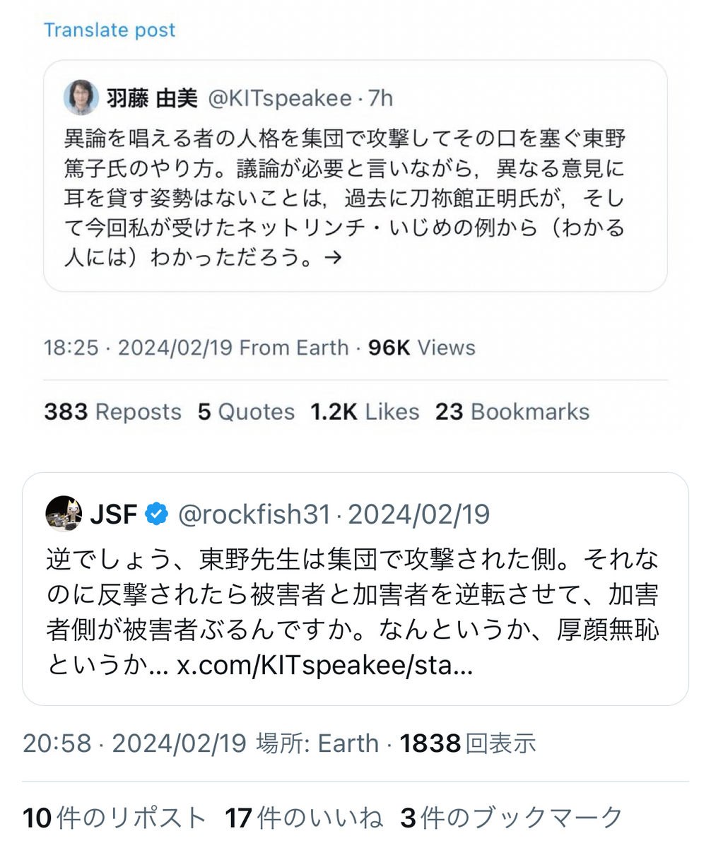 鶴見氏への批判の内容も多いけれど、一番の問題は、東大という日本の権威の象徴たる最高学府の教授が、自身が他人を貶すことにご熱心で、自身が貶されるとブロックしたりと、権威に対する品位のなさを嘆いた引用だと思う。