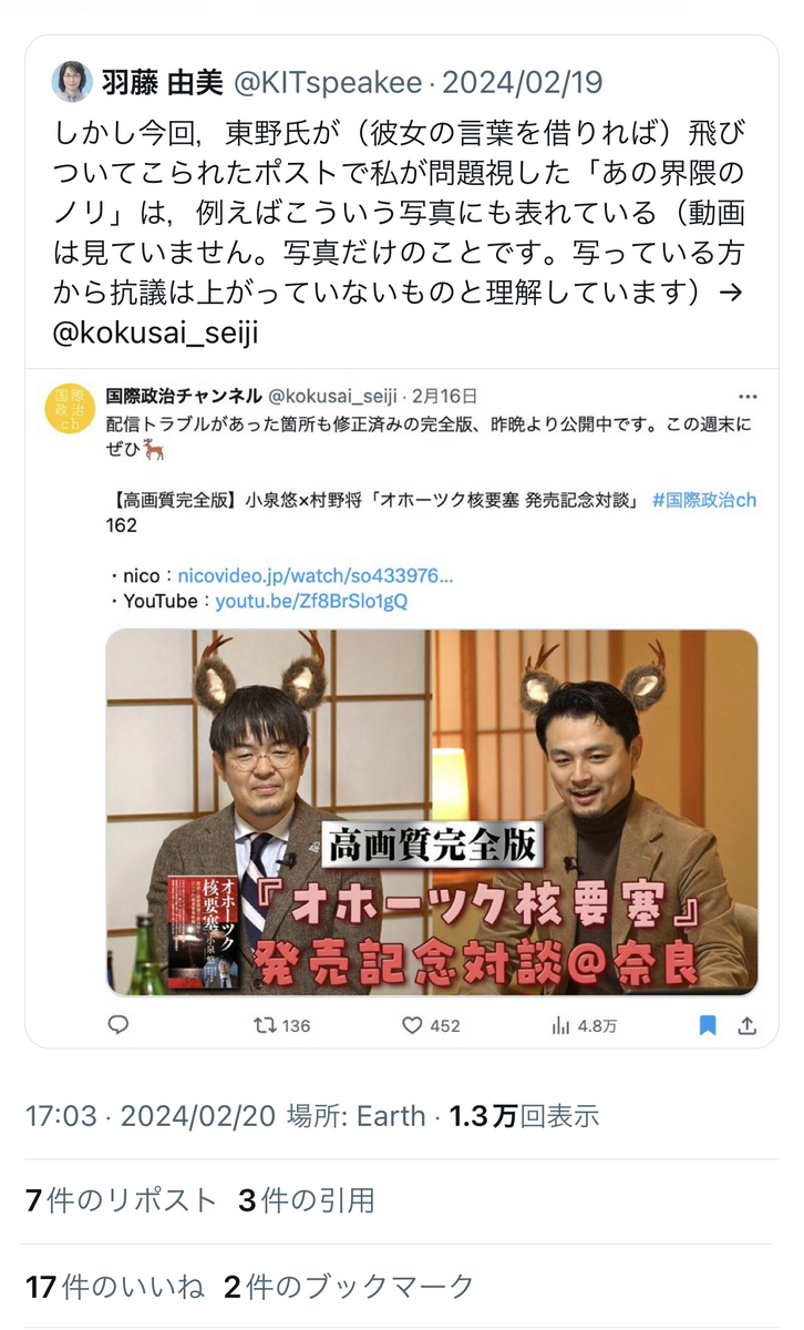 池内氏ご本人とも親しく、この騒動でも遠巻きに援護射撃をしていた河野氏も、この件については「沈黙」を守っておられる模様ですが……飯山陽氏に半ば「東大ブランド」の「お墨付き」「権威付け」のパッケージをして、世に送り出したことについては、池内氏だけでは無く、苅部氏ご本人にも責任の一端があるかと存じますが。