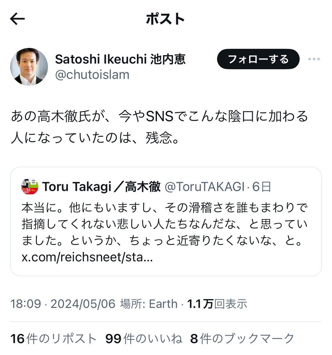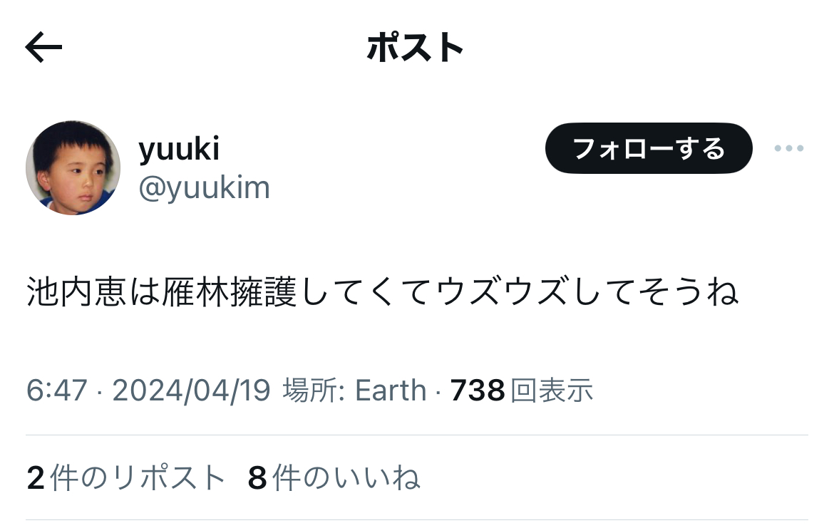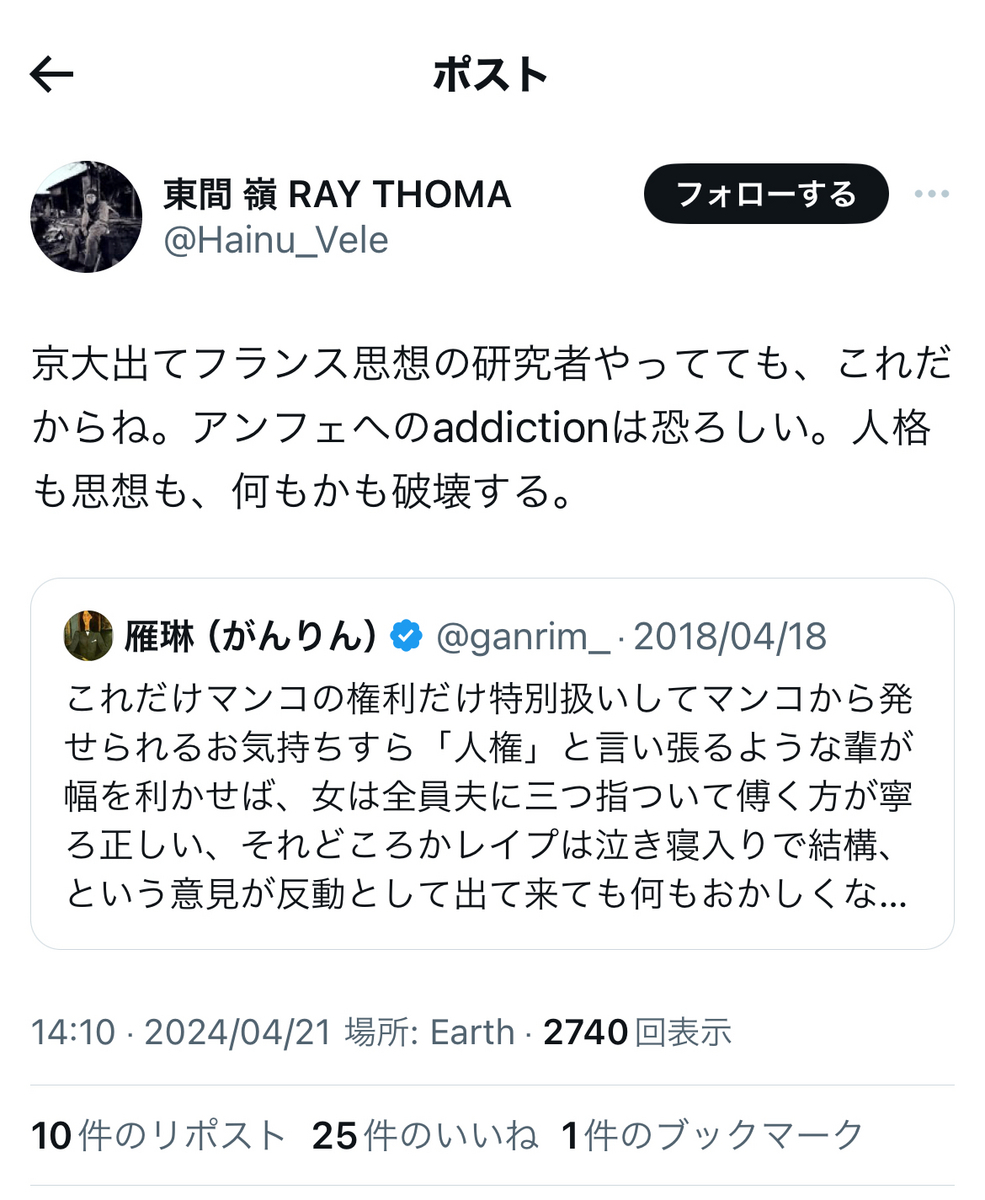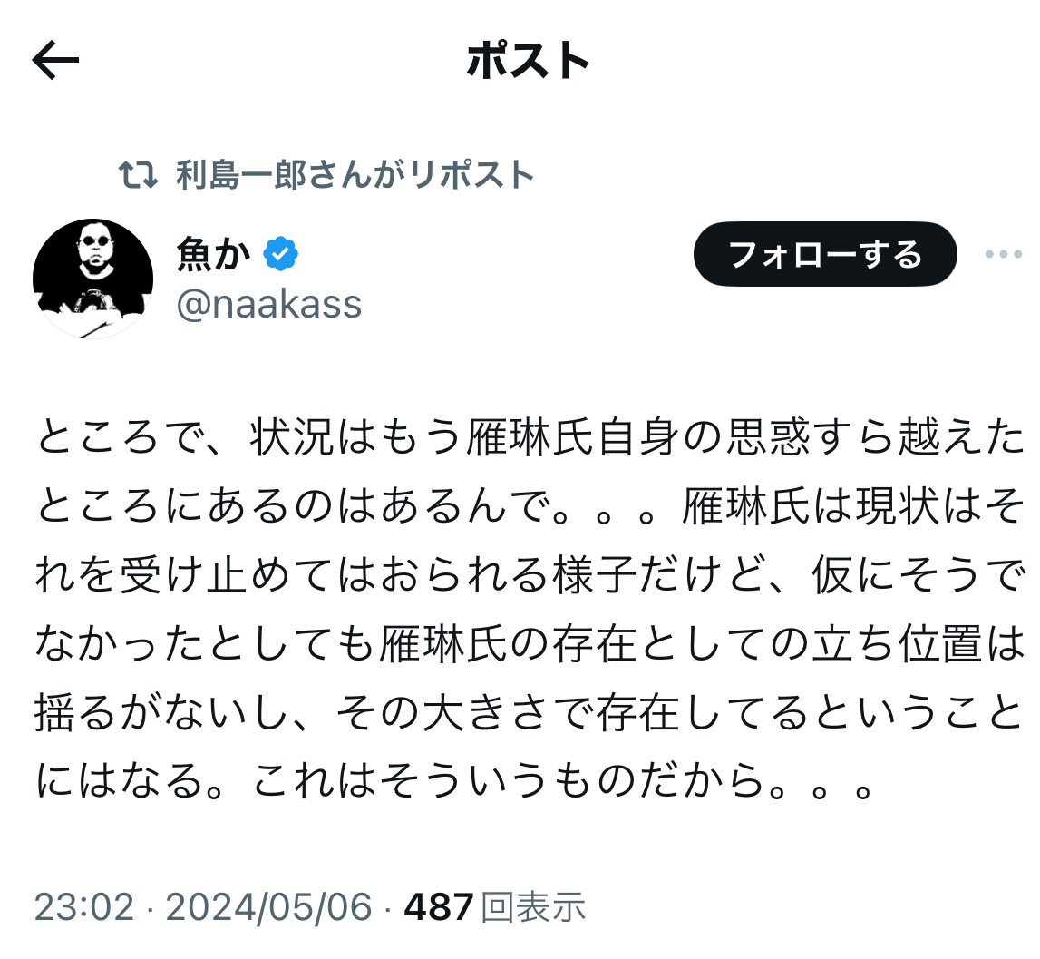 「池内恵は雁琳擁護してくて(原文ママ)ウズウズしてそうだね。」