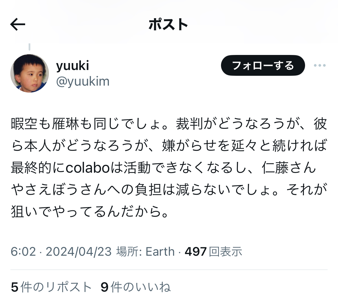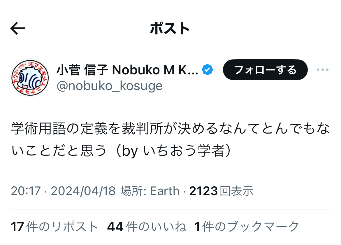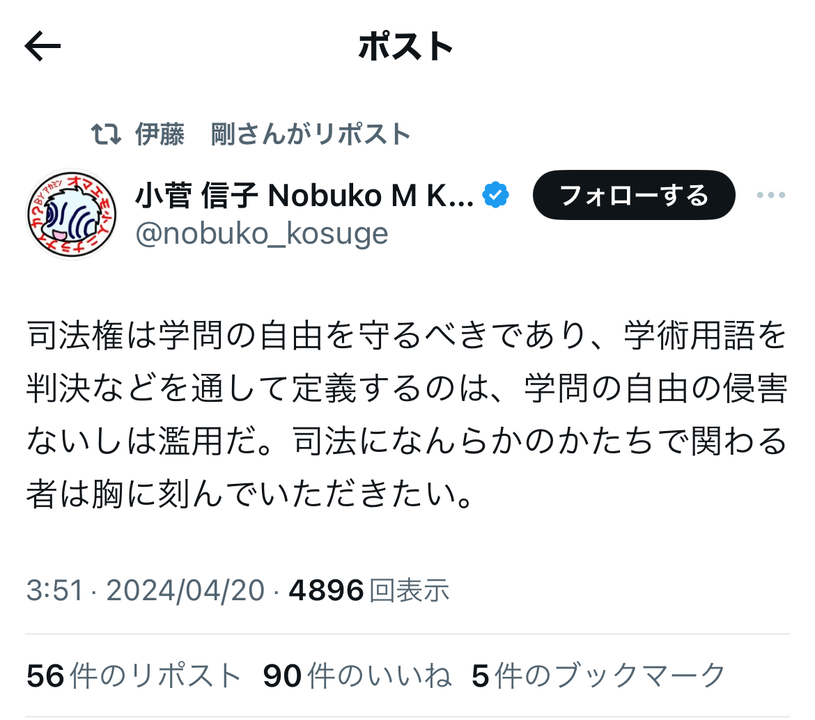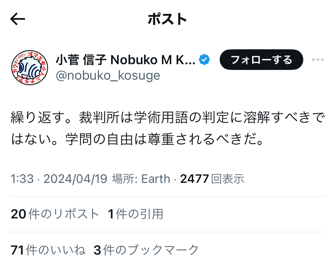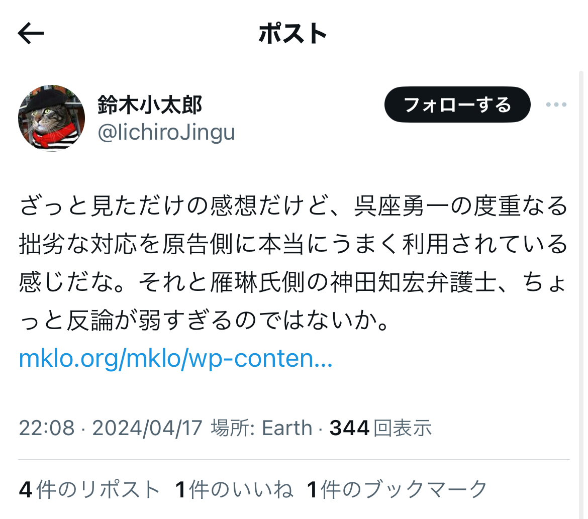 穿った見方をすれば、ある意味、小菅氏にとっては……遺憾ながら、対神原元弁護士では、ご自身が被告となった違法な懲戒請求を巡る訴訟(実質敗訴)、呉座勇一氏のオープンレター訴訟(同)、青識亜論氏の石川優実氏との訴訟(同)、そして今回の雁琳氏の一審での全面敗訴と、事実上の4連敗の可能性もあるかと存じ上げます。