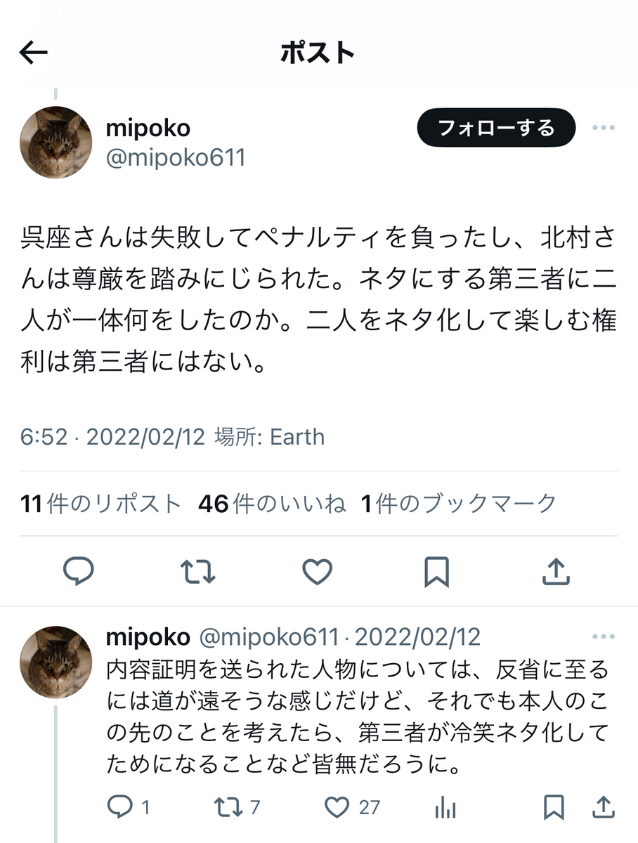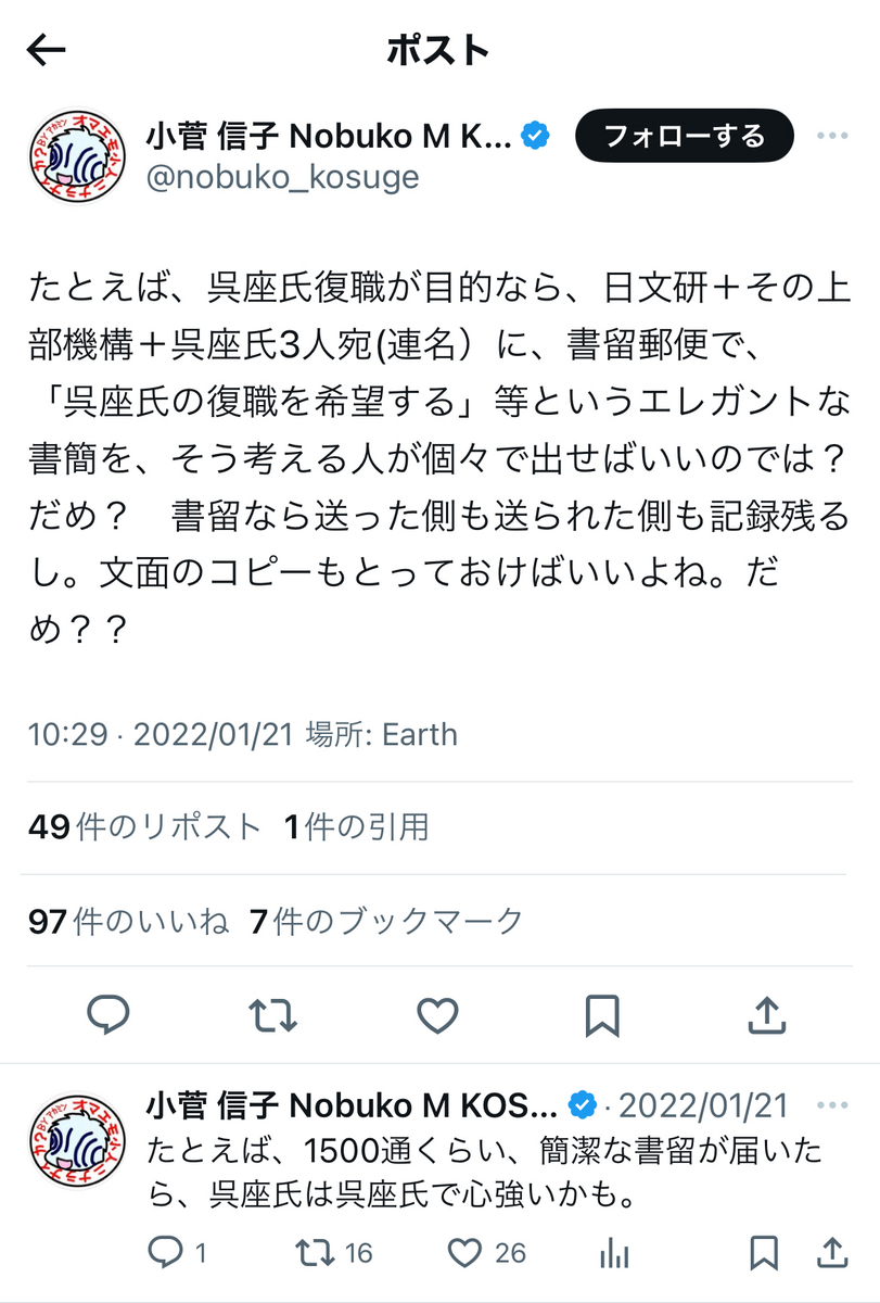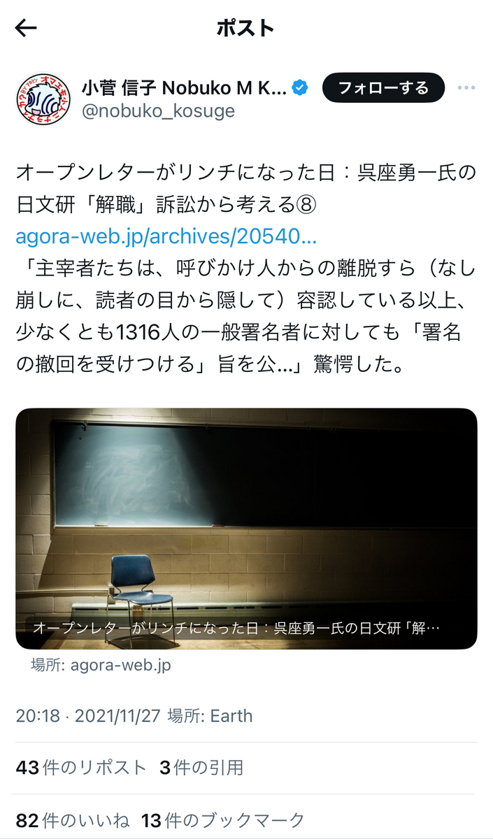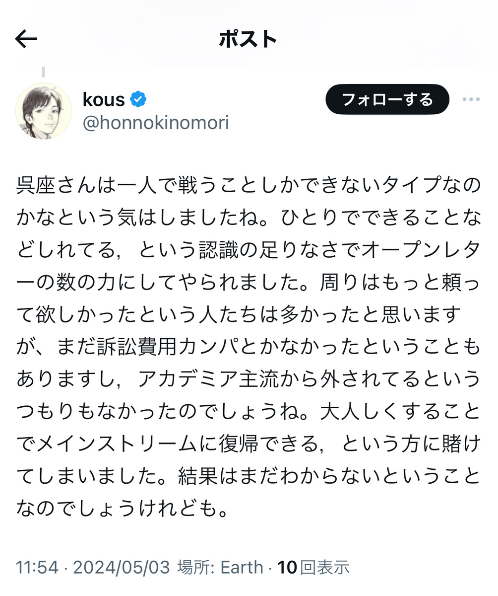 と、呉座勇一氏が起こした労働裁判、オープンレター訴訟がいずれも呉座氏サイドの「実質敗訴」、「実質二連敗」で終結し、「和解条項」にて上記の内容等が法的に確定したことについて、想うところが多々あるようです。