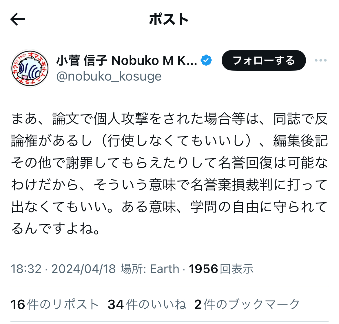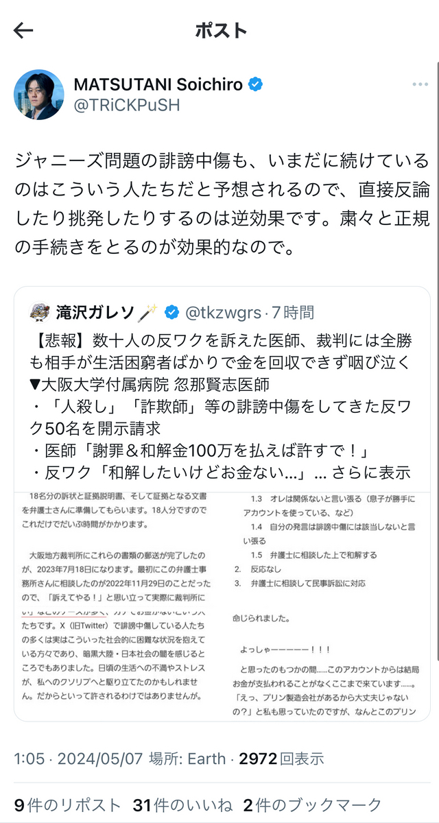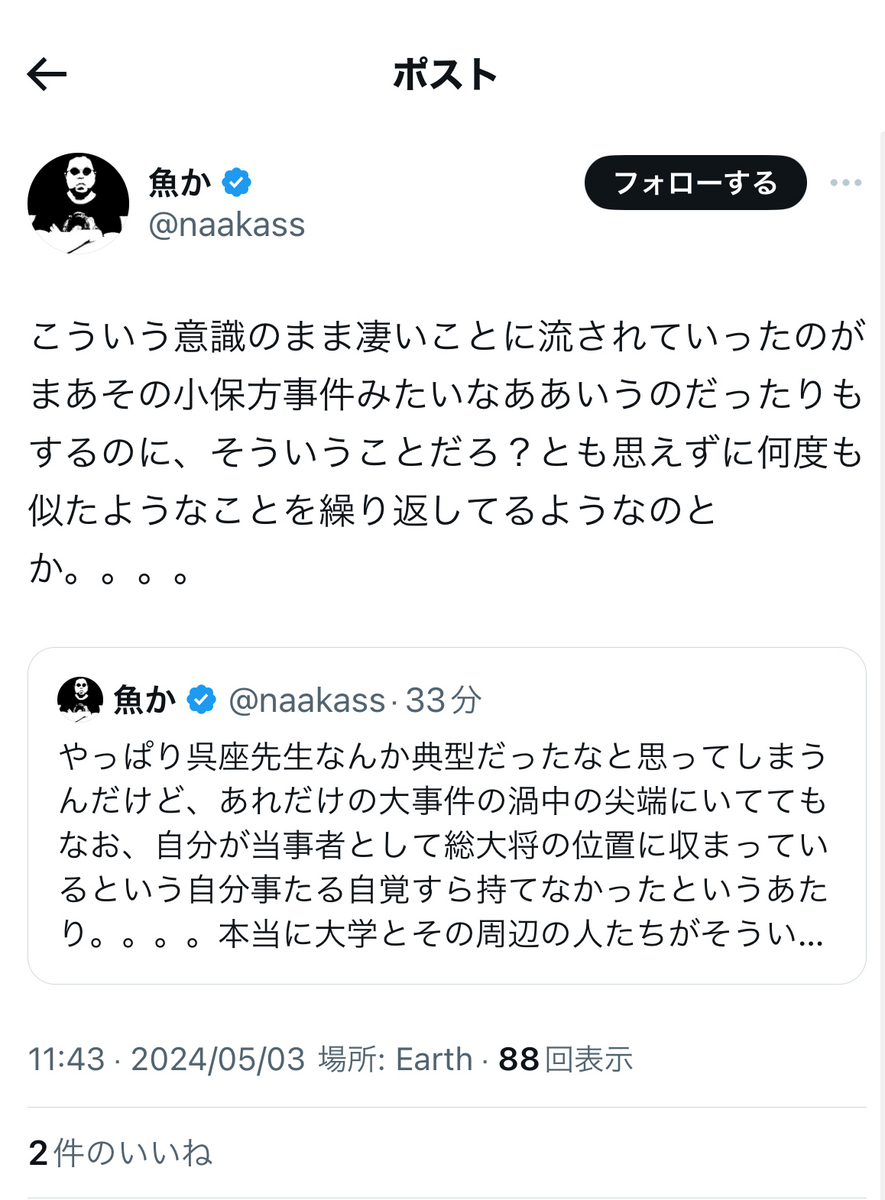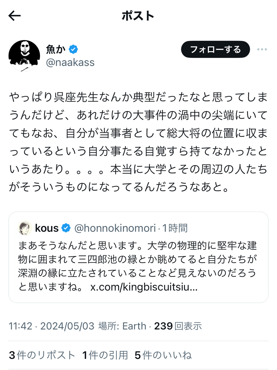 と、呉座勇一氏が起こした労働裁判、オープンレター訴訟がいずれも呉座氏サイドの「実質敗訴」、「実質二連敗」で終結し、「和解条項」にて上記の内容等が法的に確定したことについて、想うところが多々あるようです。