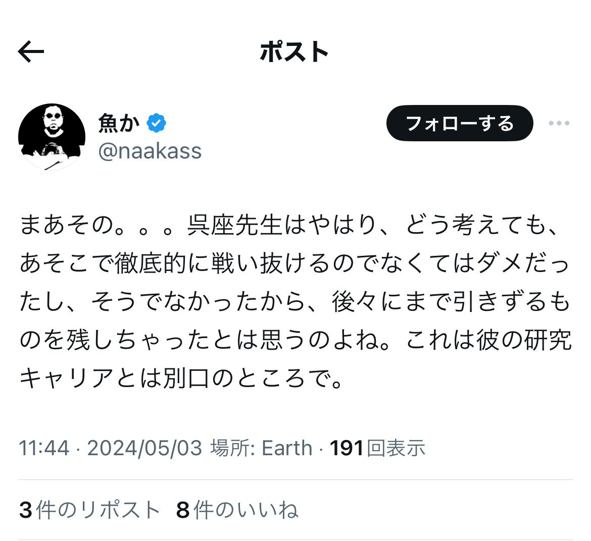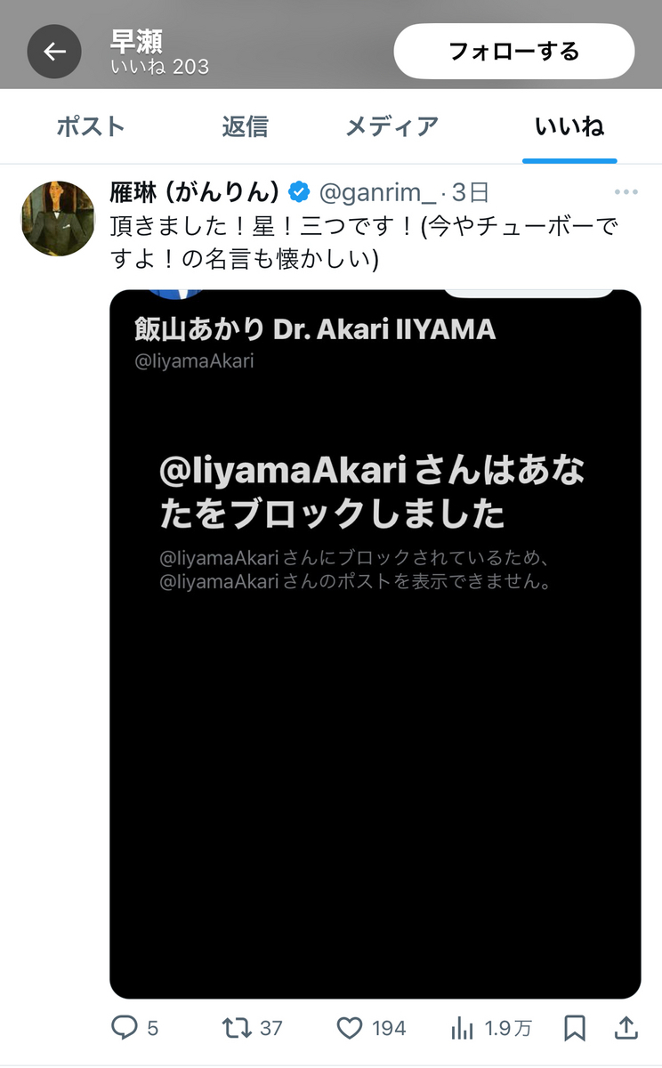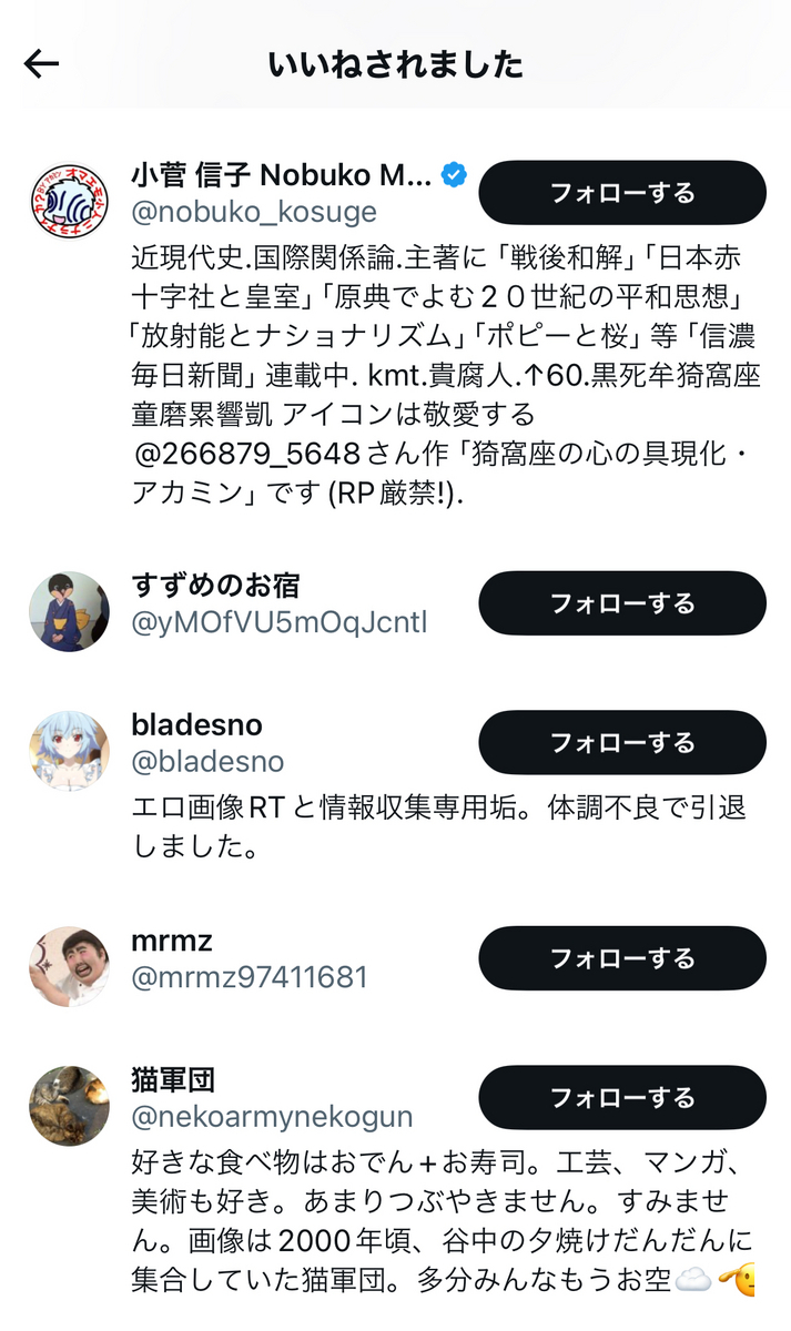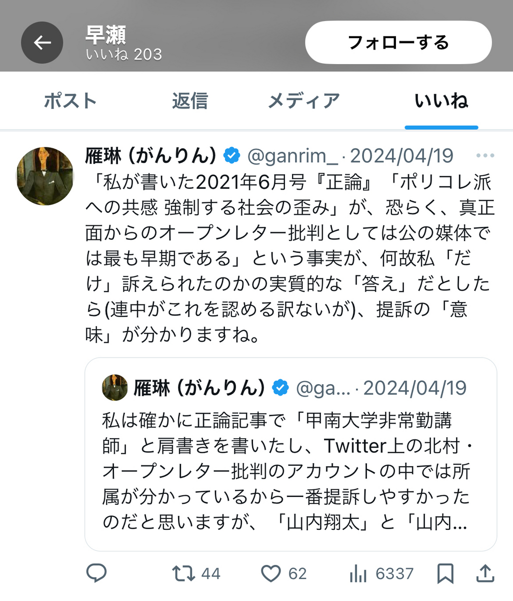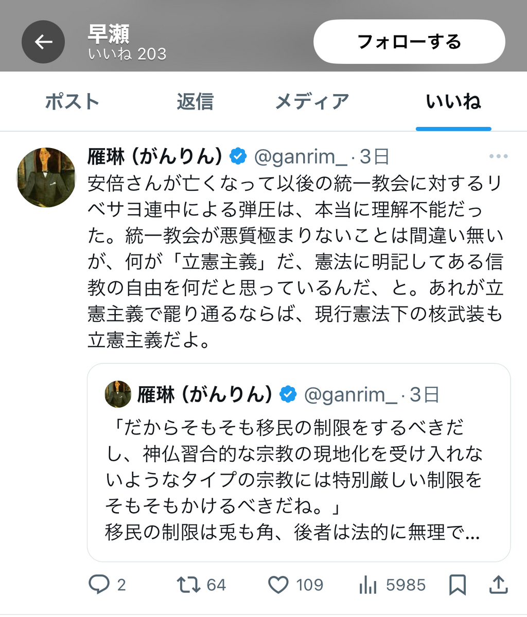 更に早瀬氏は、伊藤剛氏や「魚か」なる垢の逆張り現実主義のポストにも、欠かさず「いいね」をしており、ある意味、反オープンレターズ「呉座神聖十字軍」の入隊試験を「100点満点」で「合格」しているも同然かと存じます。