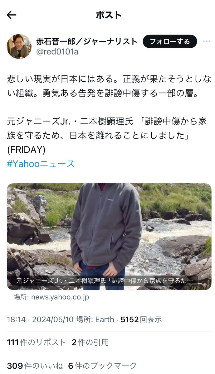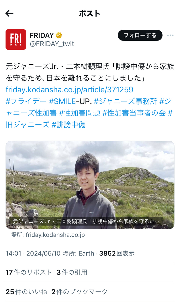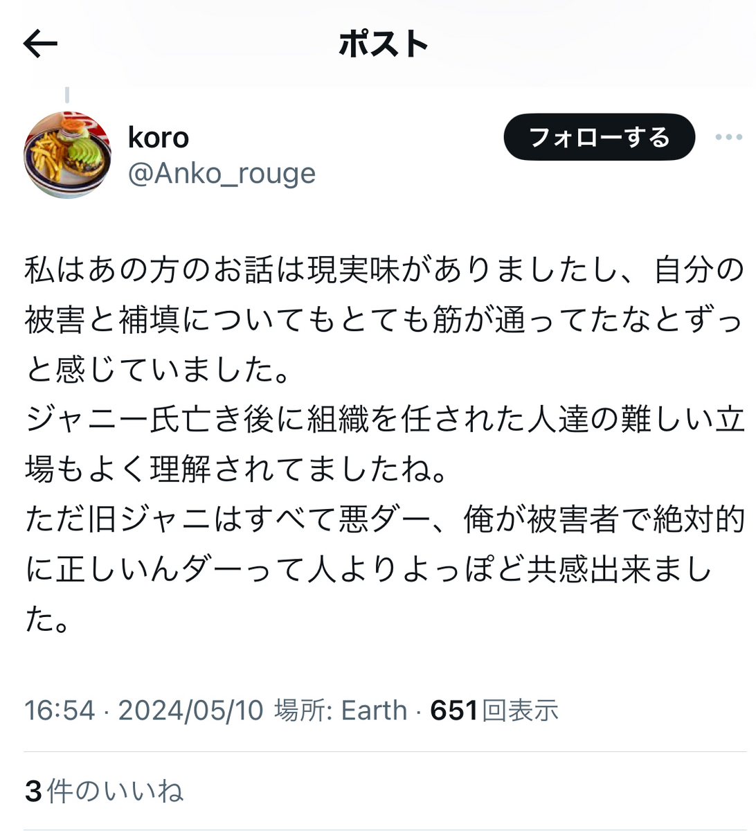 というか、炎上柱本人は……上記のように、「自称被害者」などと、ジャニウヨ(?)からの謂れの無い誹謗中傷を苦に、本邦を離れざるを得なくなった被害者の二本樹顕理さんや、自死を遂げた「ジャニーズ性加害問題当事者の会」メンバーのことなどは、やはり、ほぼ一貫して黙殺している模様です。