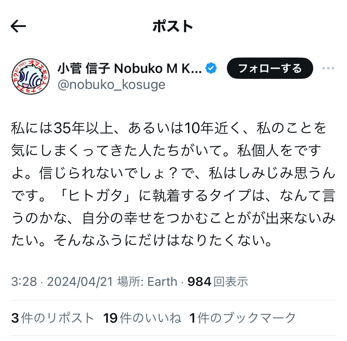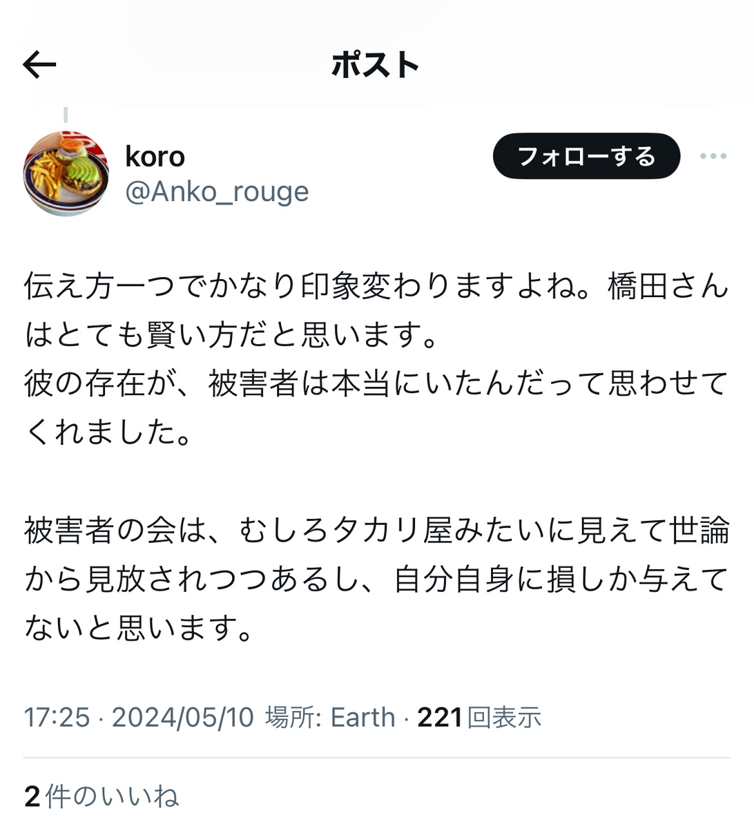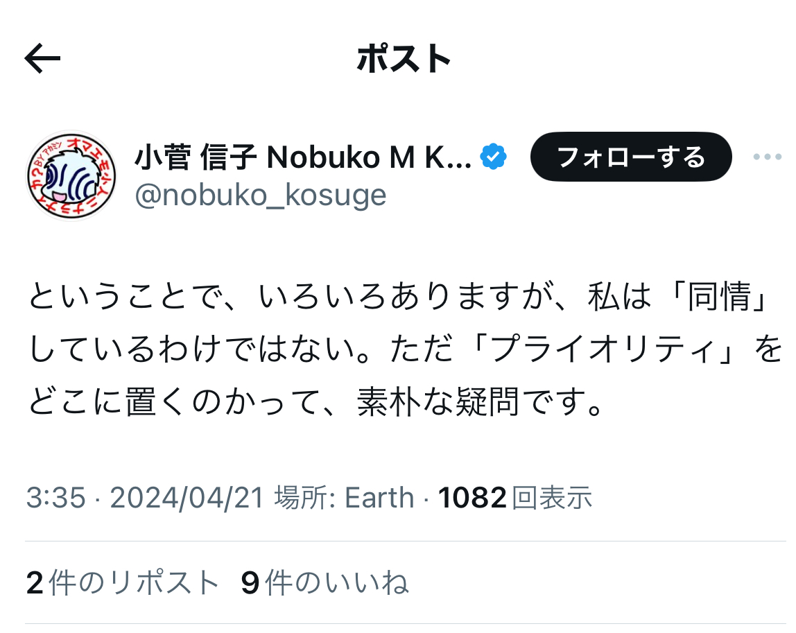 というか、炎上柱本人は……上記のように、「自称被害者」などと、ジャニウヨ(?)からの謂れの無い誹謗中傷を苦に、本邦を離れざるを得なくなった被害者の二本樹顕理さんや、自死を遂げた「ジャニーズ性加害問題当事者の会」メンバーのことなどは、やはり、ほぼ一貫して黙殺している模様です。