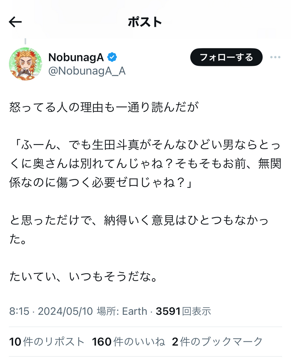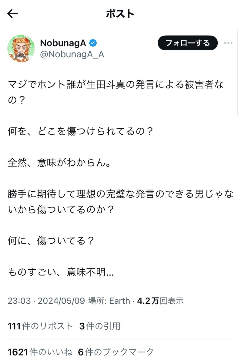 ジャニオタというか、ジャニウヨ(?)界隈への受けを狙ったのかは不明ですが……炎上柱は、ここぞとばかりに、揚げ足取りで被害者バッシングに明け暮れる一方、大失態を犯した生田氏ご本人には大甘の姿勢を鮮明にしているのですから、開いた口が塞がらない想いです。