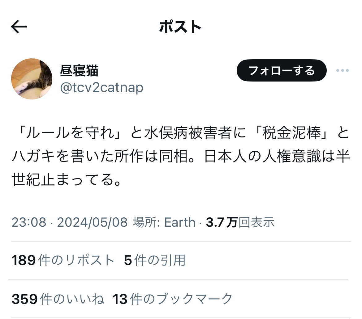 遺憾ながら、延々と何十年も続いている水俣病患者への誹謗中傷といい、「被害者非難」は……戦後の「右でも左でも無い、ごく普通の日本人」にとっても、やめられない悪しき伝統の一つのようですが。