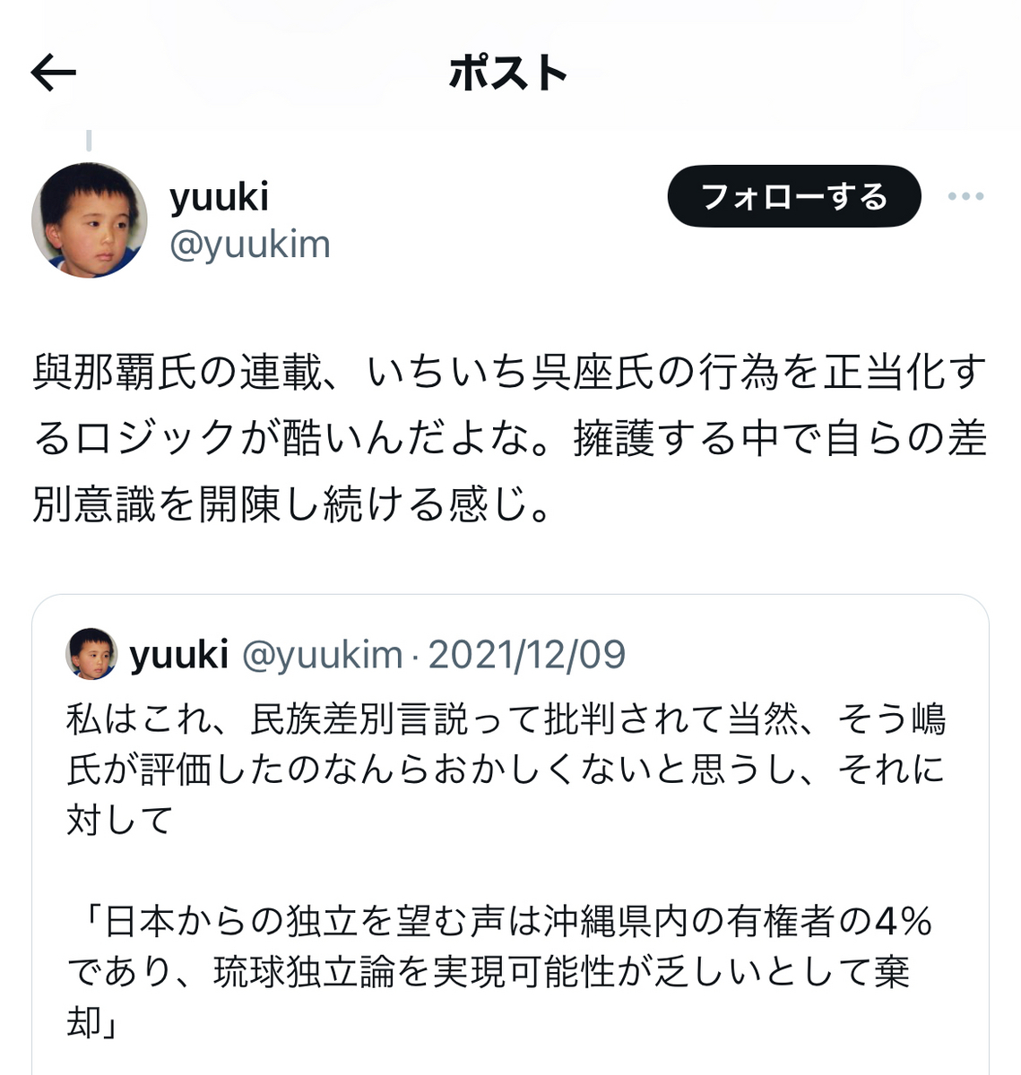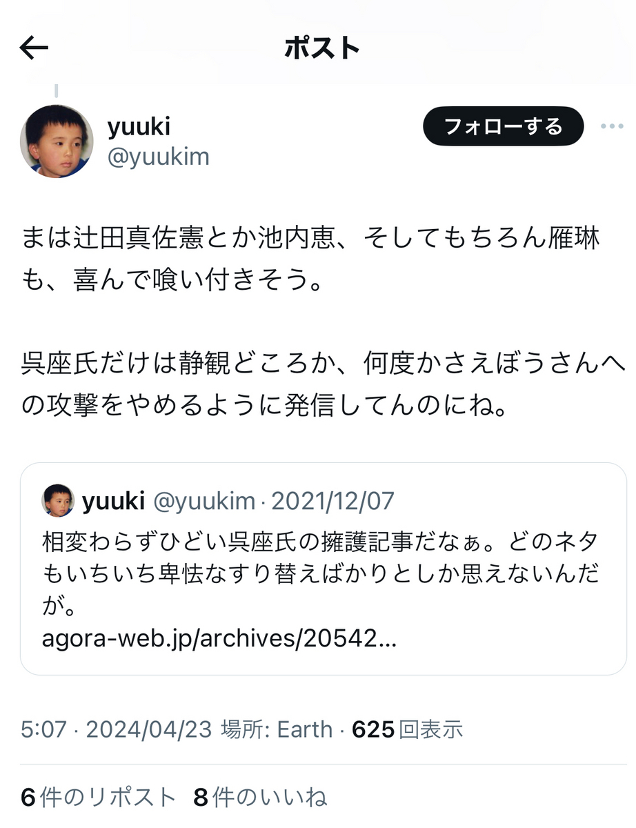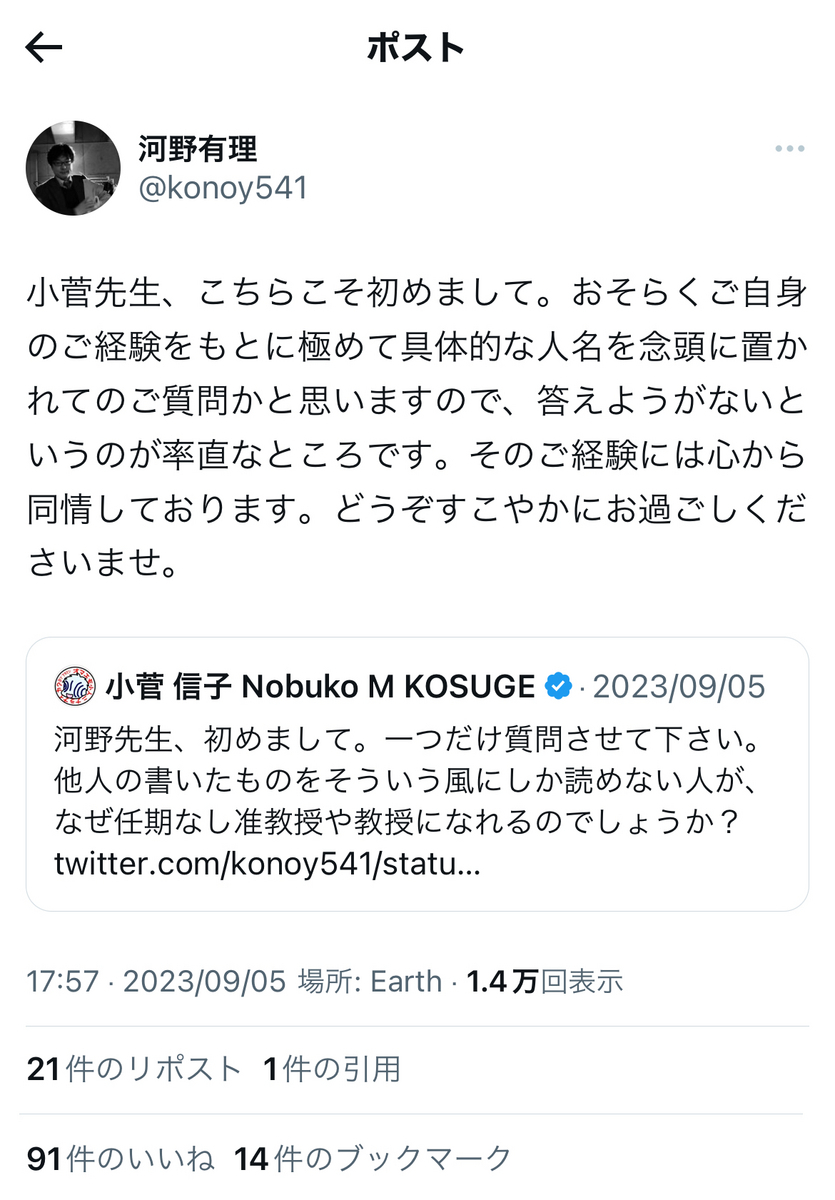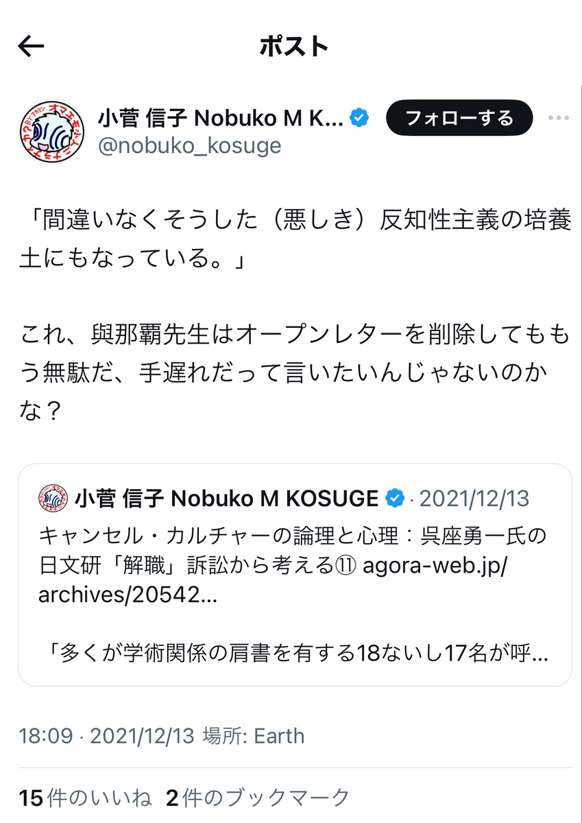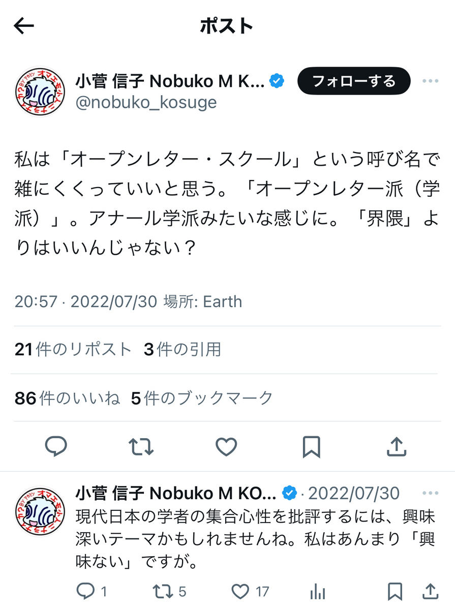 尚、小菅氏がご自身とは直接間接を問わず、無関係だった筈の反オープンレター騒動に首を突っ込んだきっかけの一つが……あの與那覇潤氏によるアゴラ記事を読んだことだったそうですが。
