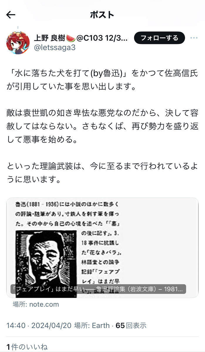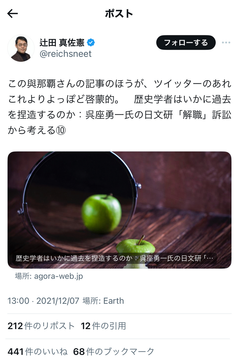 余談ながら、辻田真佐憲氏は、名指しを避けるためなのか、またもや固有名詞を出さないまま、池内氏ご本人に言及していたようで、ちょっとした物議を醸しておりました。