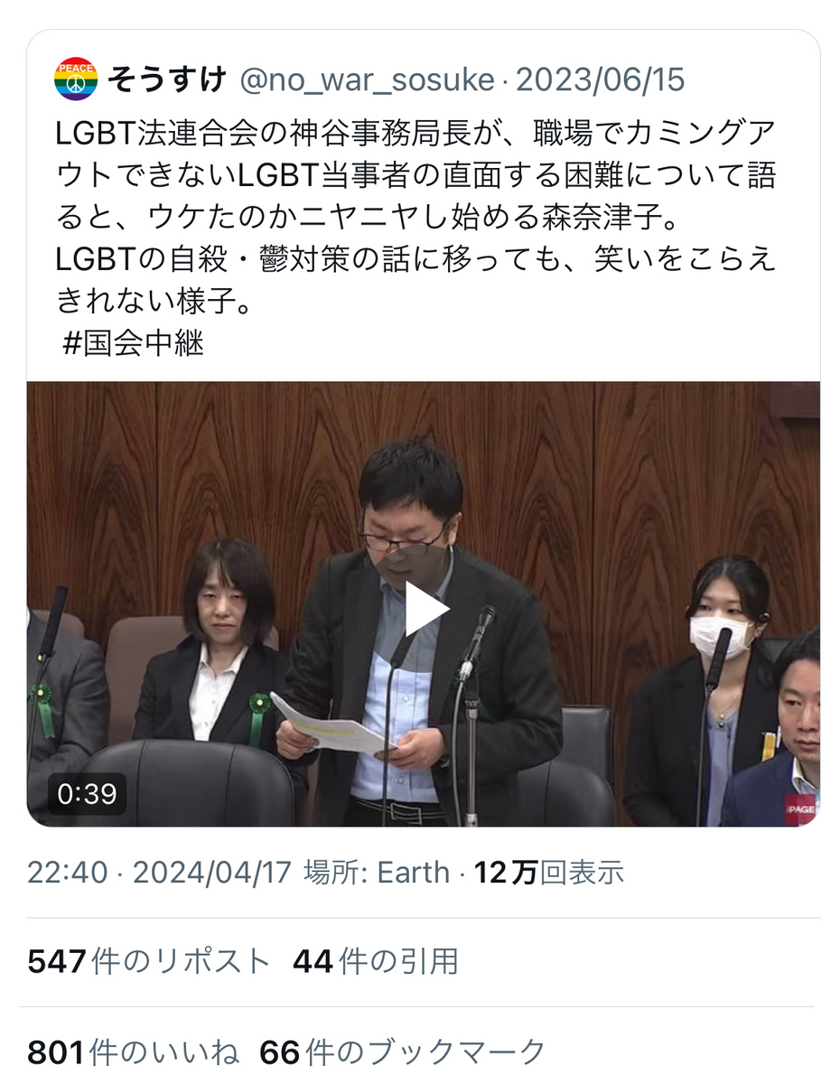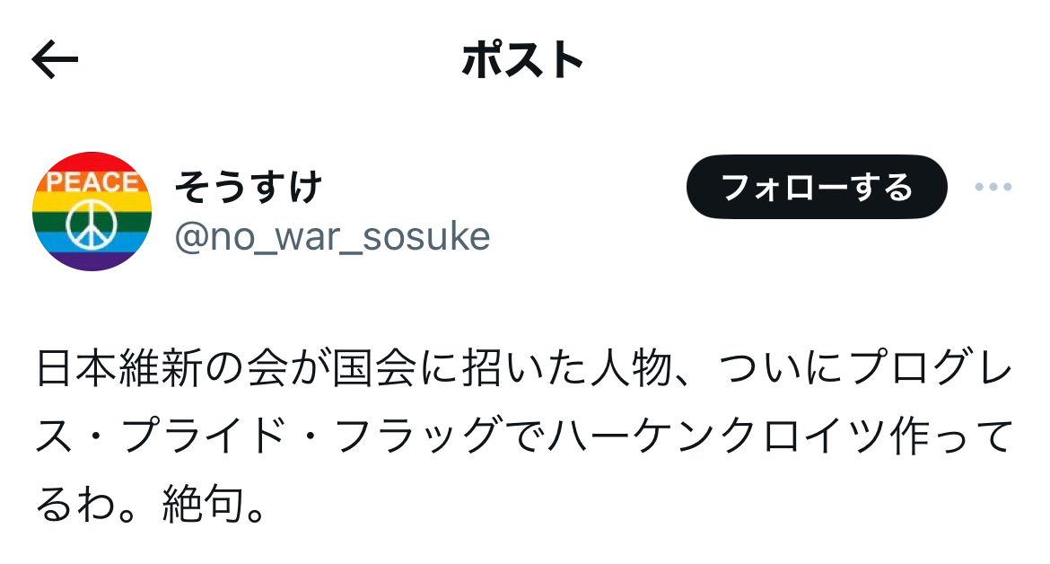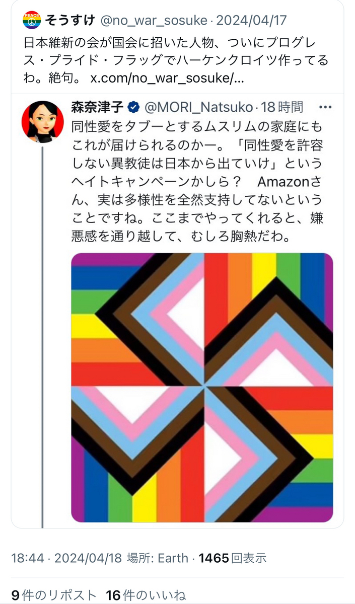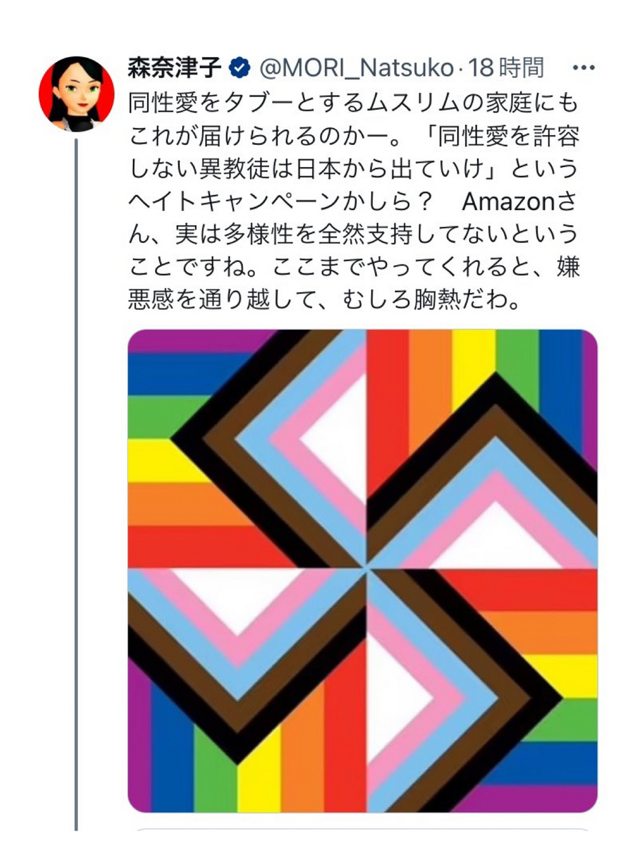 近年の森氏は……大変恐縮ながら、上記のように、LGBTの方々の象徴たるプログレス・プライド・フラッグで、よりにもよって同性愛者を組織的に弾圧しまくったナチスのハーケンクロイツを作成して愚弄するなど、一線を越えかかっているような言動が目立つようになっております。