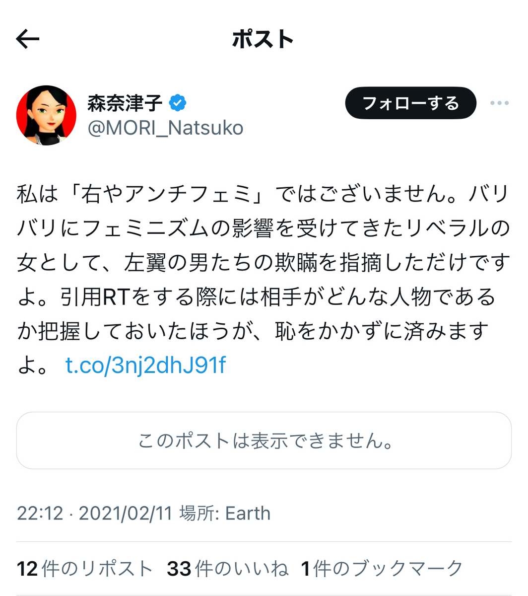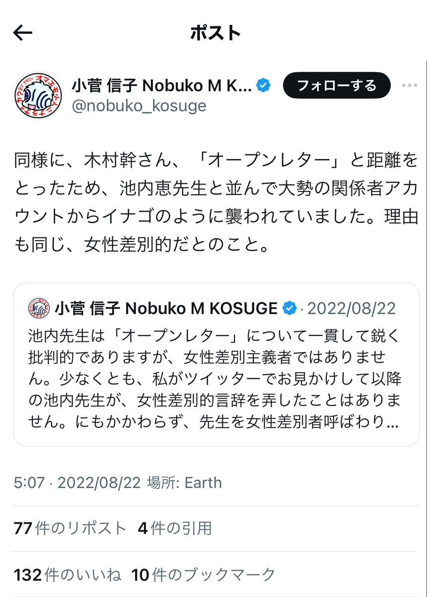 伊藤剛氏とほぼ同様に、フェミ・リベラルに少しでも瑕疵があると、大騒ぎするような傾向の小菅氏が、「リベラル」を自認しているらしい森氏を不問ないし黙認している可能性があるのは、如何なる理由なのか。