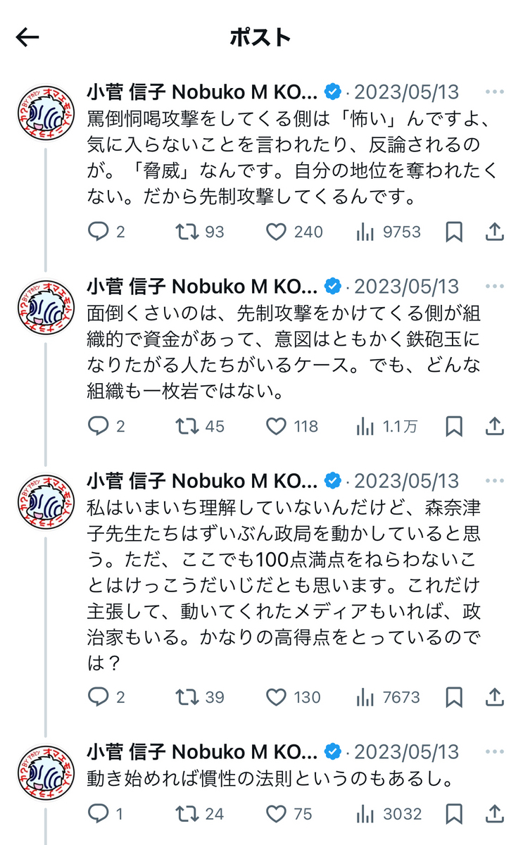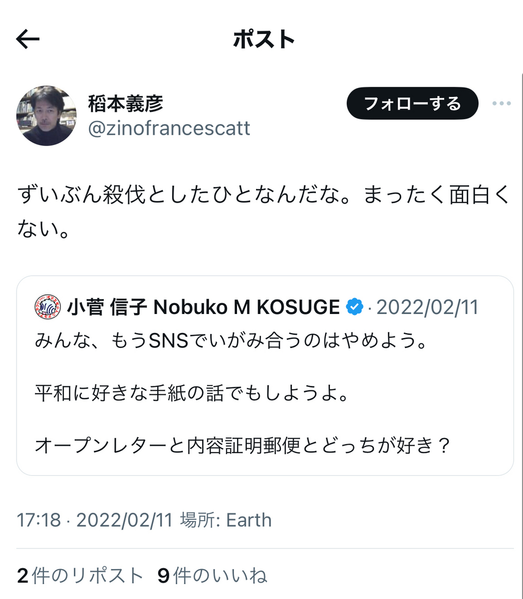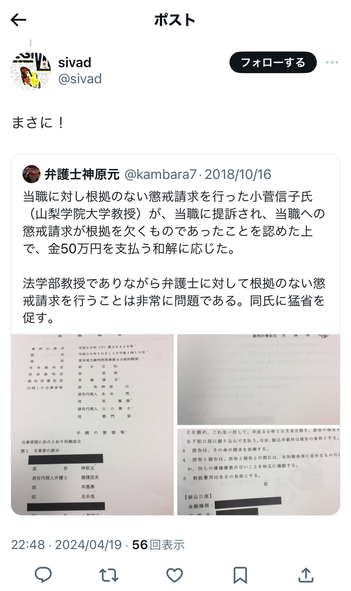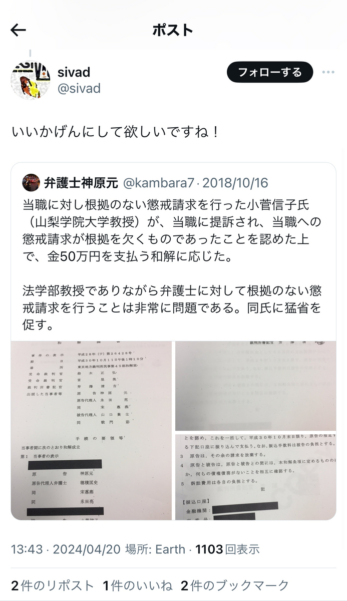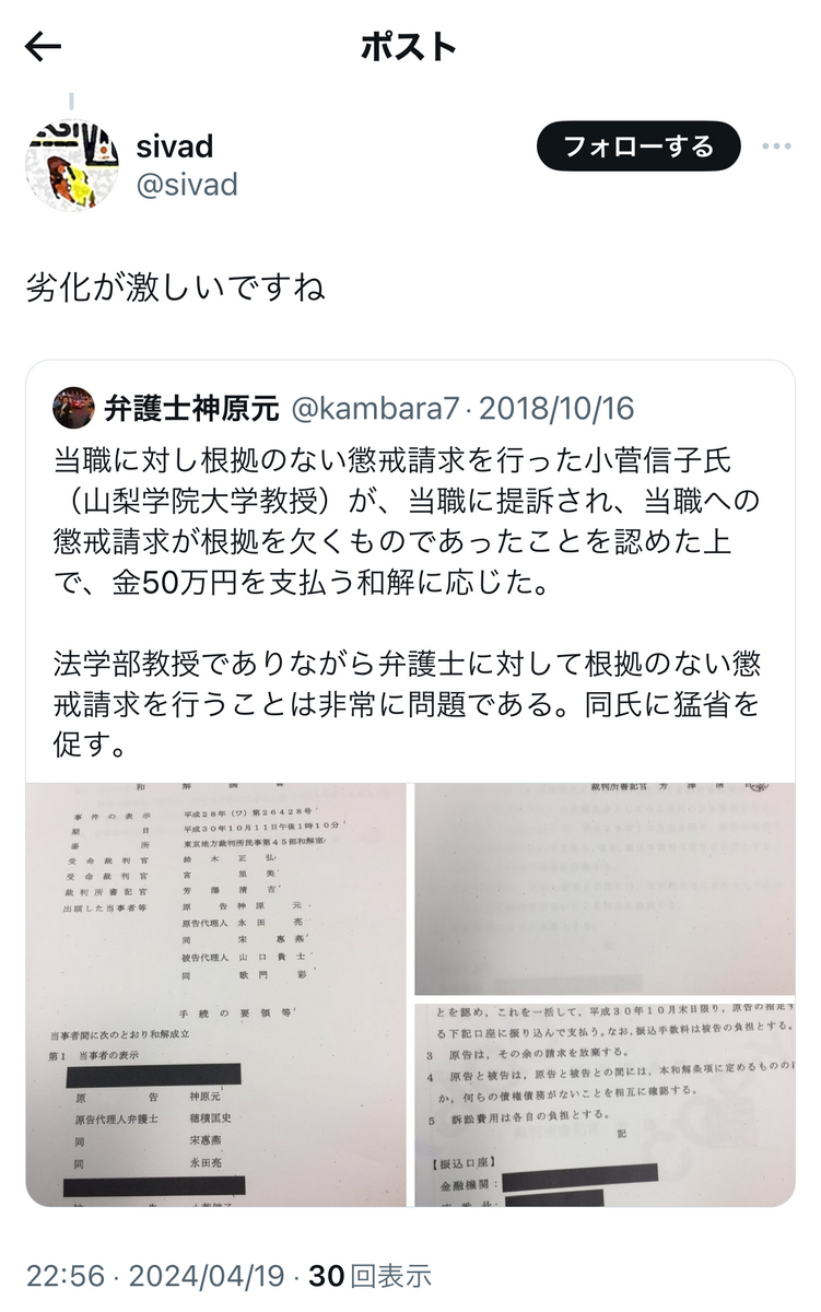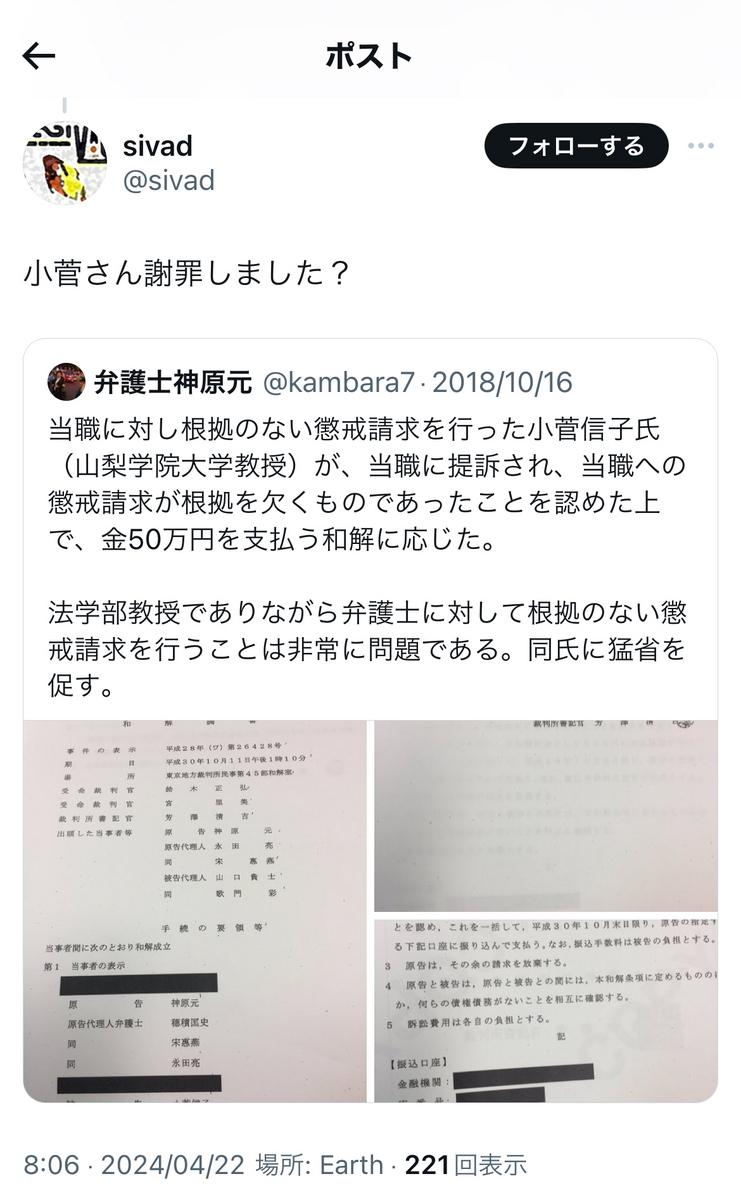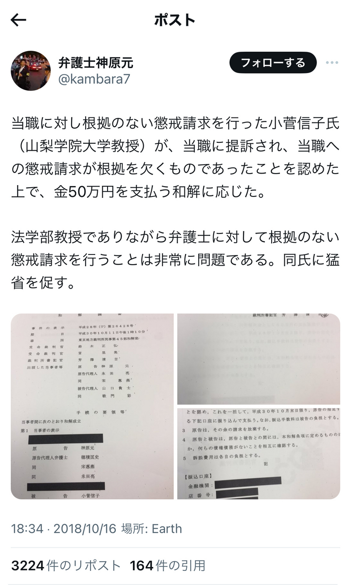 というか、上記でもリプライで、小菅氏は事あるごとに、「実質敗訴」の件を突っ込まれまくっていますが。