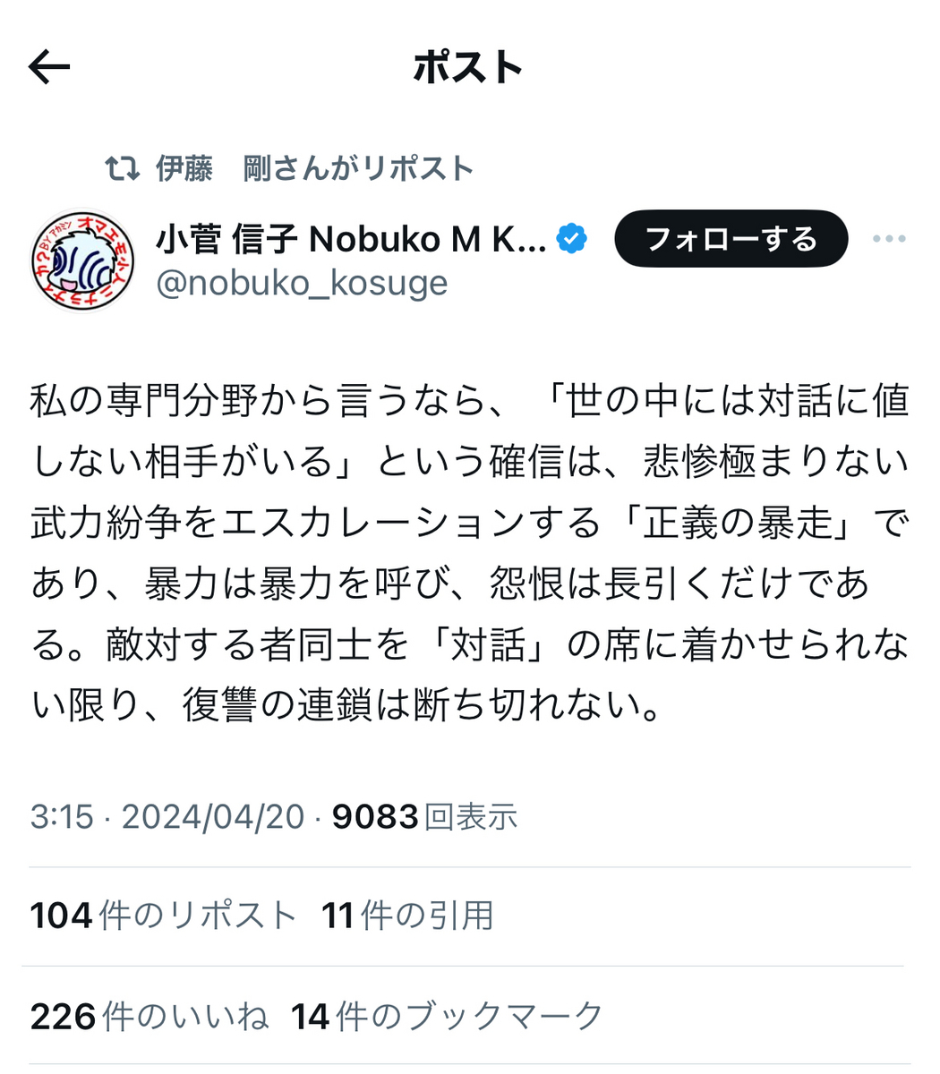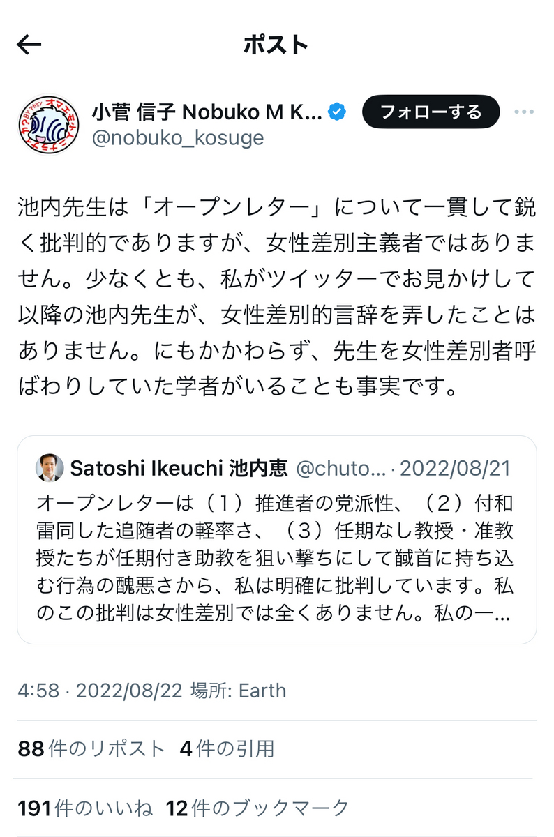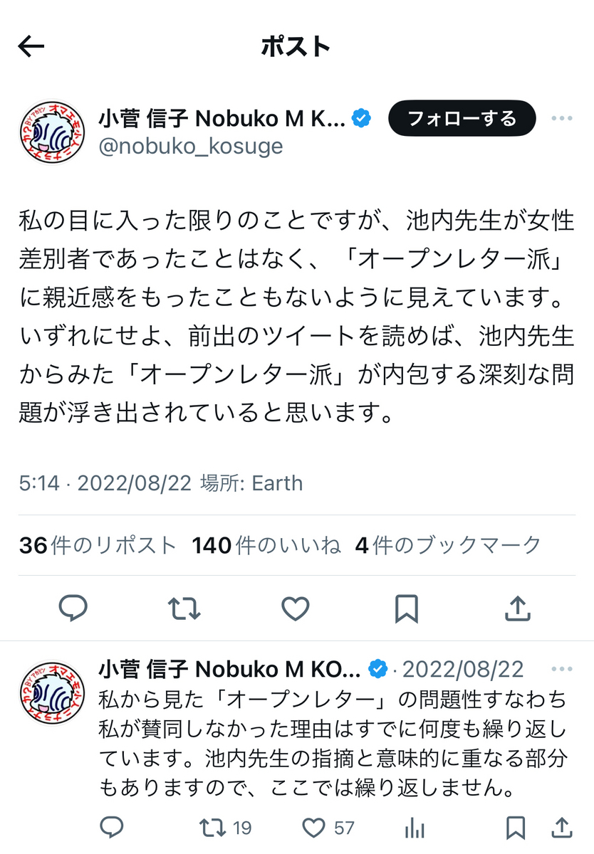 余談ながら、小菅信子氏と、池内恵氏ら反オープンレターズ「呉座神聖十字軍」のお歴々には、この場をお借りして、改めまして、
