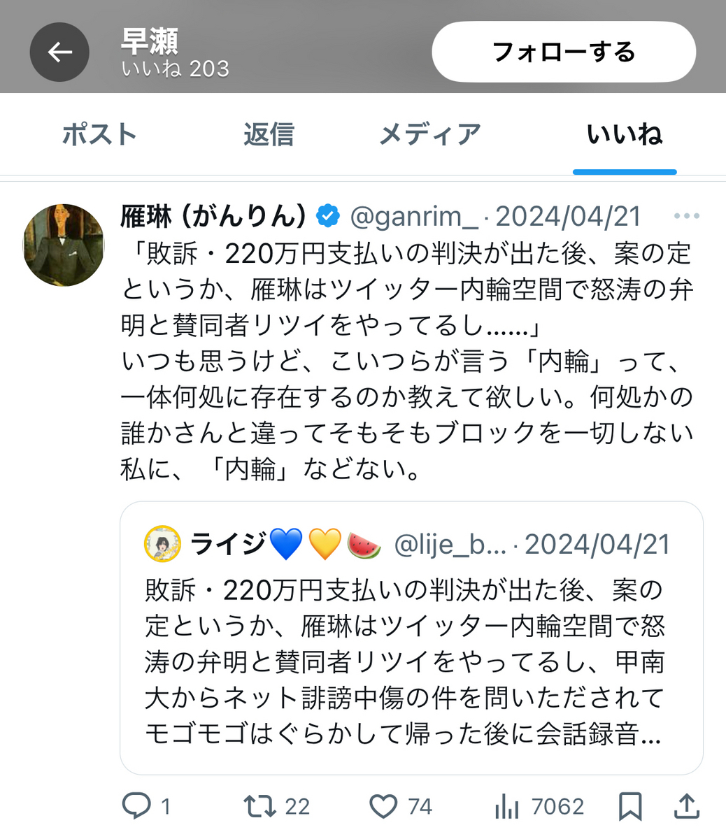 実際、約1ヶ月程前までは、上記のように、親しく遣り取りしていたお二人でしたが……雁琳氏の一審での全面敗訴後、池内氏ご本人との間には、微妙な距離感が生じつつあるようです。