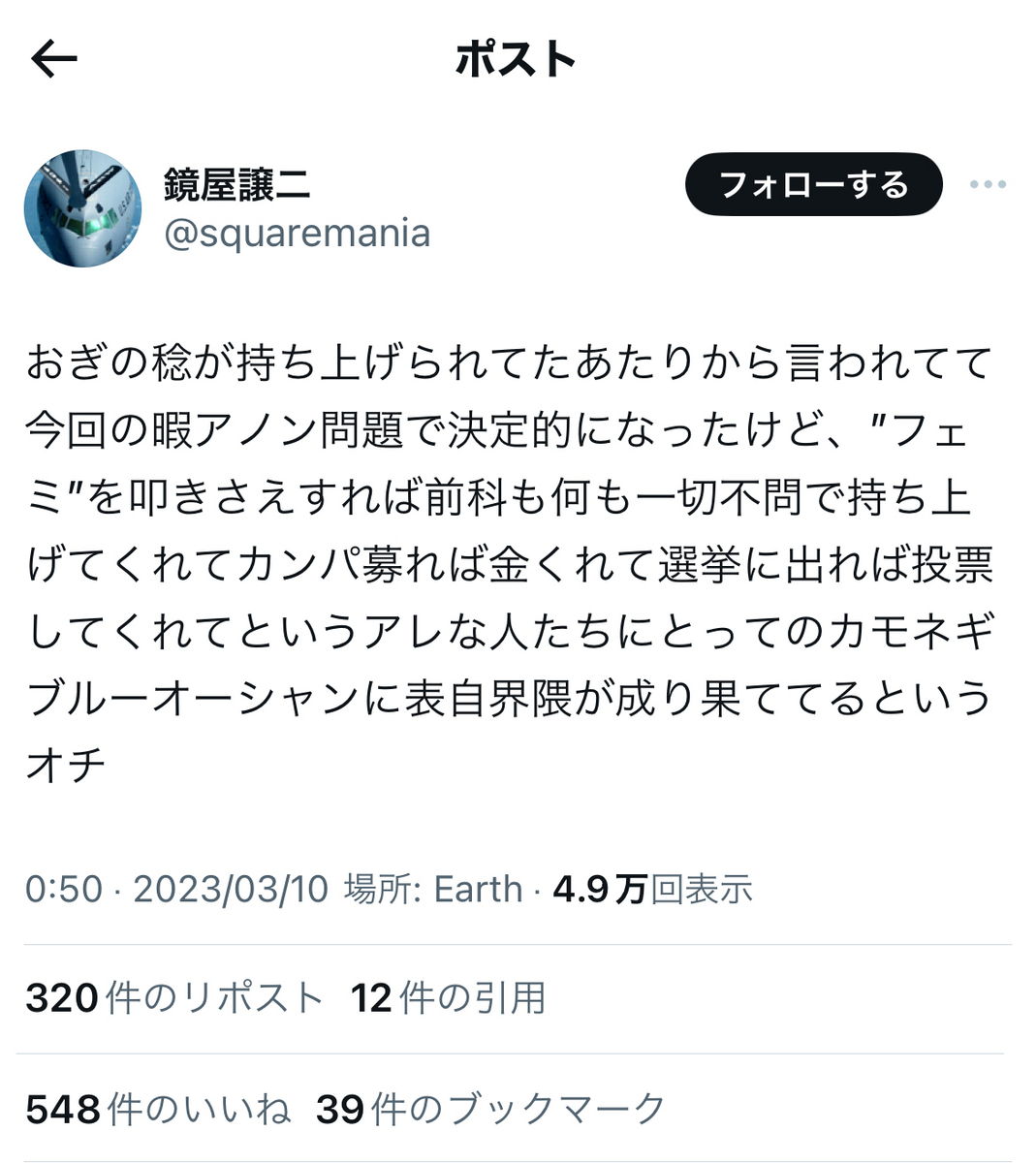 「私もおぎの稔を批判したら、信者らしき表現の自由戦士から沢山の嫌がらせが来ましたね」