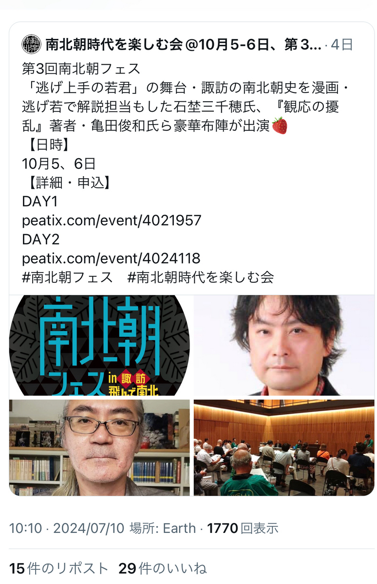 ・既にご存知の方もおられるでしょうが、「南北朝時代を楽しむ会」によると、10月5日(土)~6日(日)の予定で、現在放映中のTVアニメ『逃げ上手の若君』に因んだ第3回南北朝フェスを諏訪市で開催するようです。