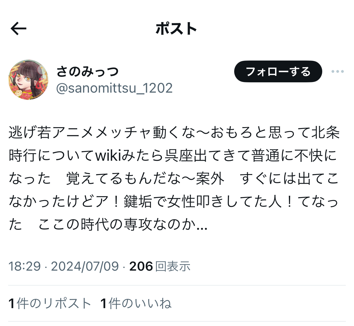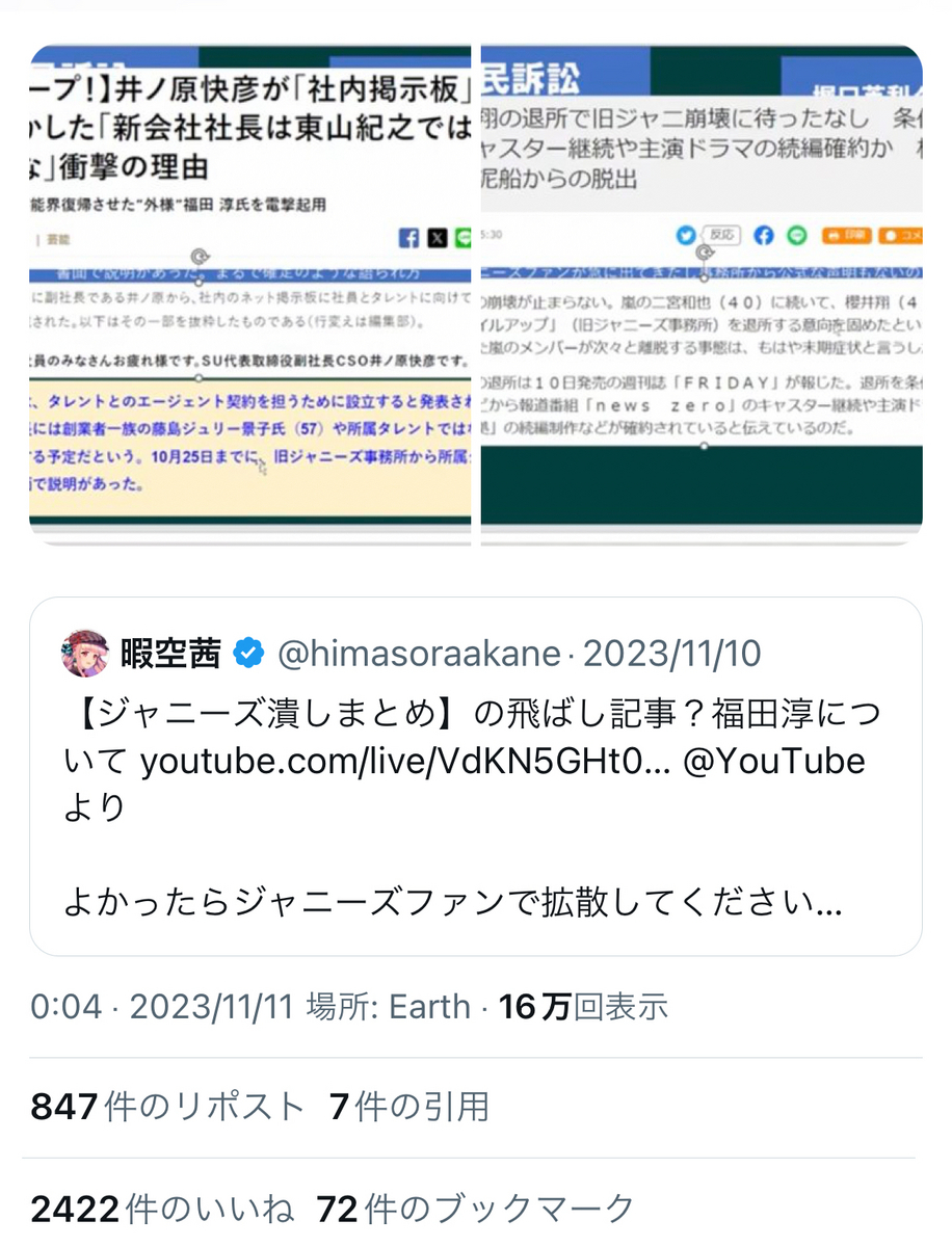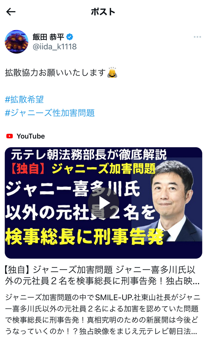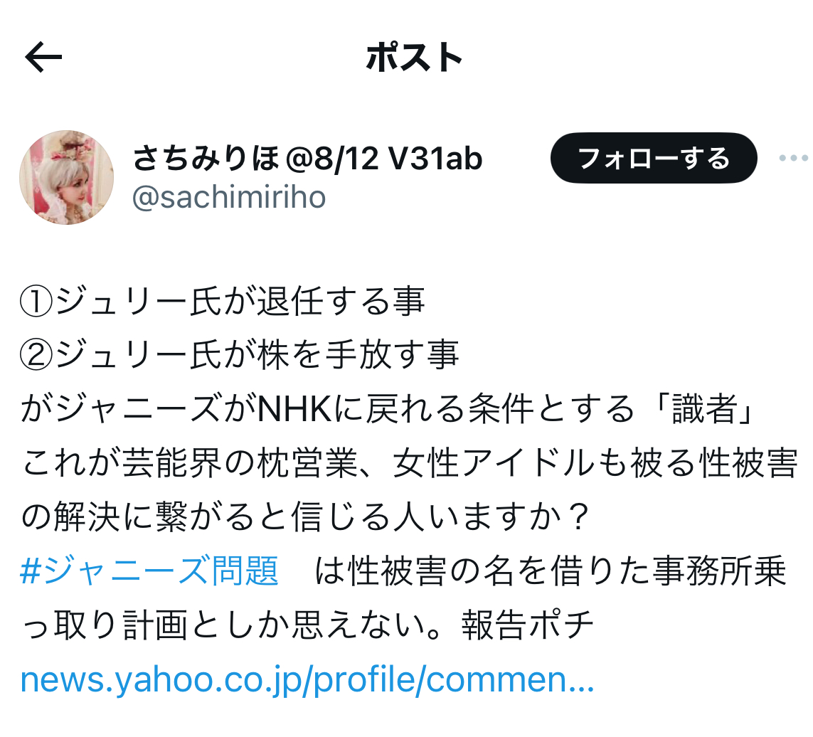 炎上柱に続いて、「戦う歴史学者」平山優氏からも一定の評価を受けているらしい漫画家のさちみりほ氏ですが……実は反・反ジャニーズの旗振り役のお一人のようで、目下、暇アノン界隈でも活躍中であり、尊師の覚えも目出度いご様子かと考えられます。