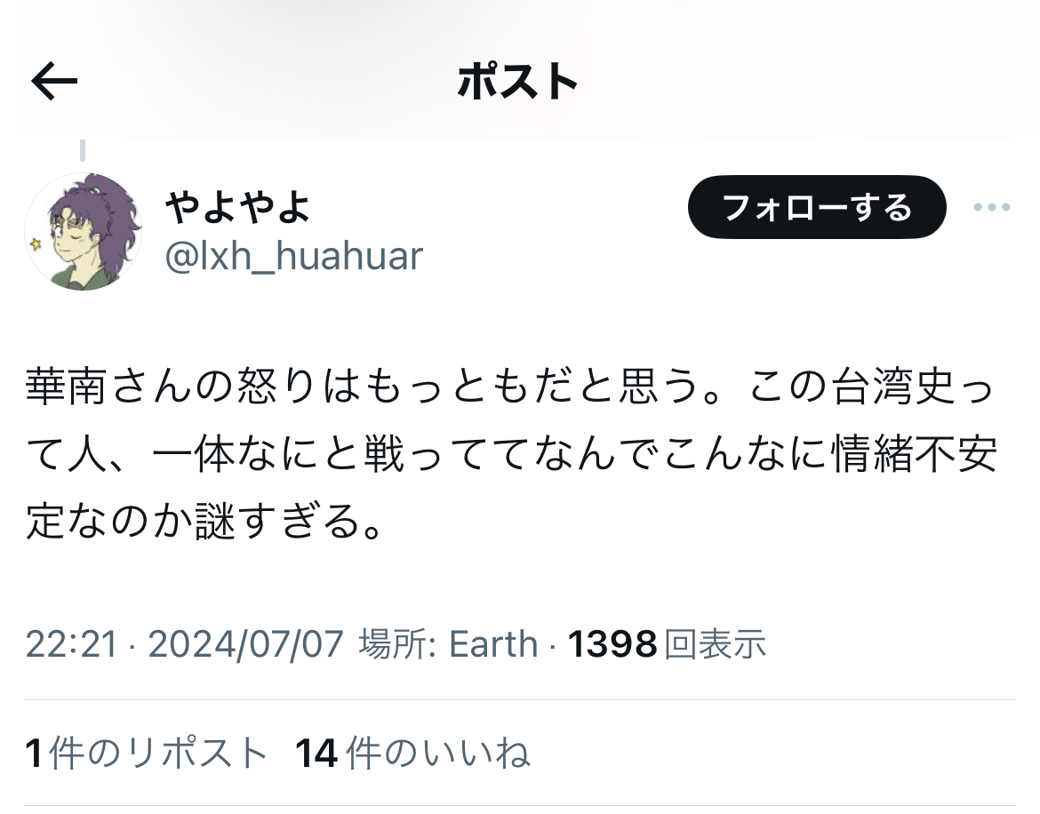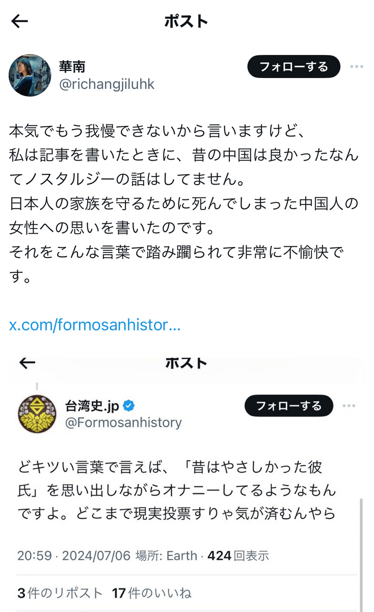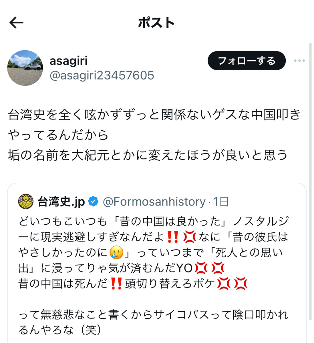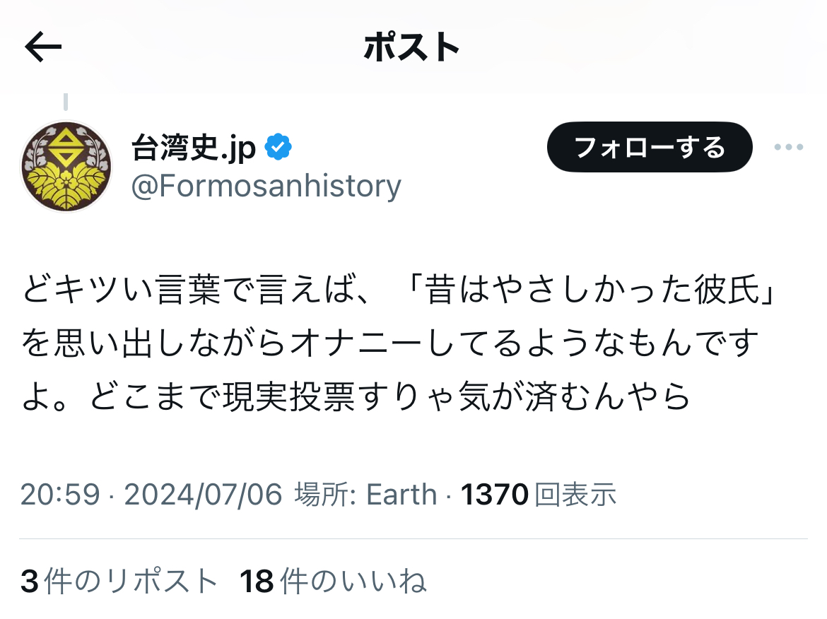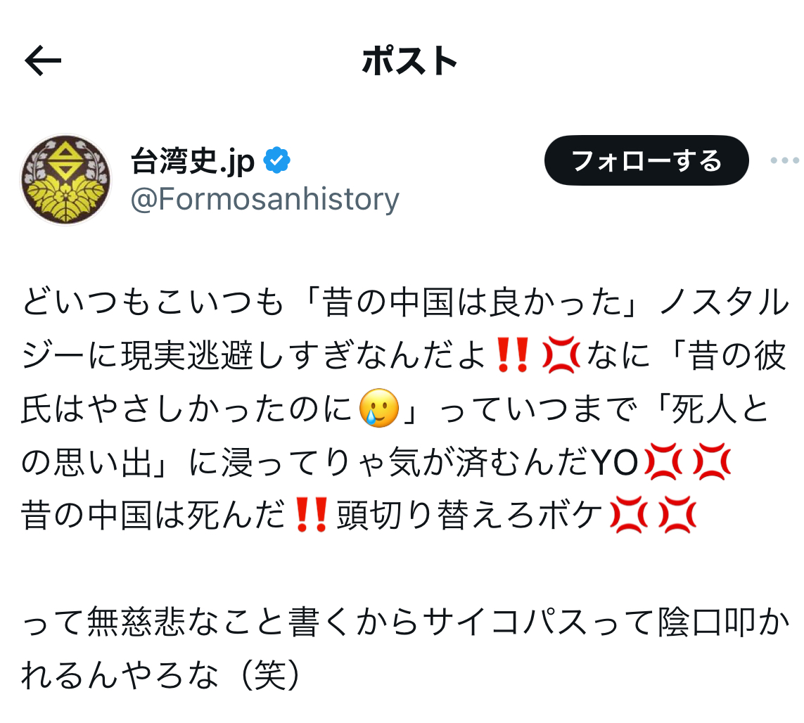 非礼を百も承知で、本邦の「中華クラスタ」の間でも悪名高い「台湾史.jp」なるネトウヨ垢には……作中ワースト級の「キング・オブ・クズ」にしてエリート中のエリートたる禪院直哉君のイカした台詞をご紹介致します。