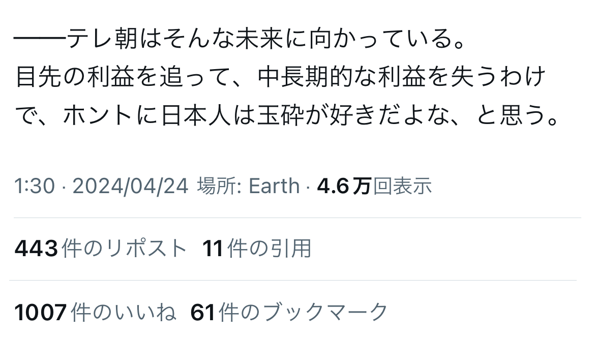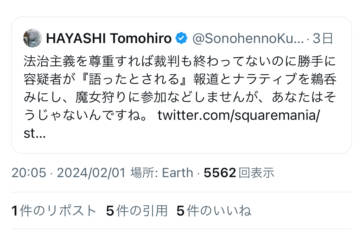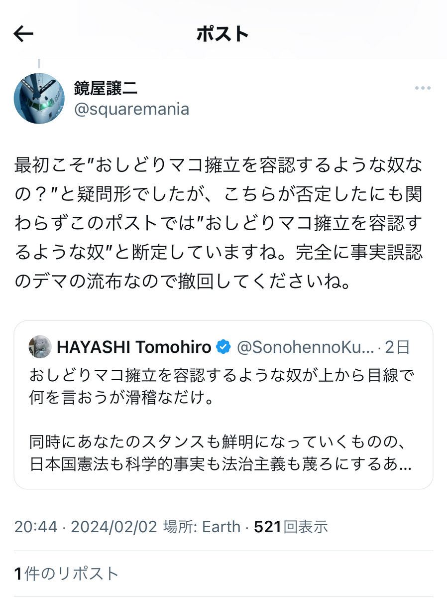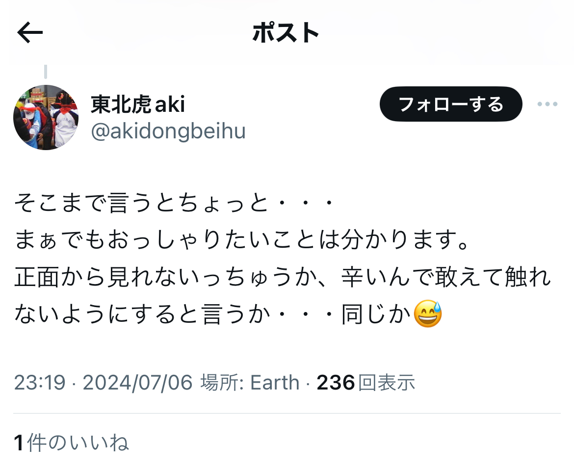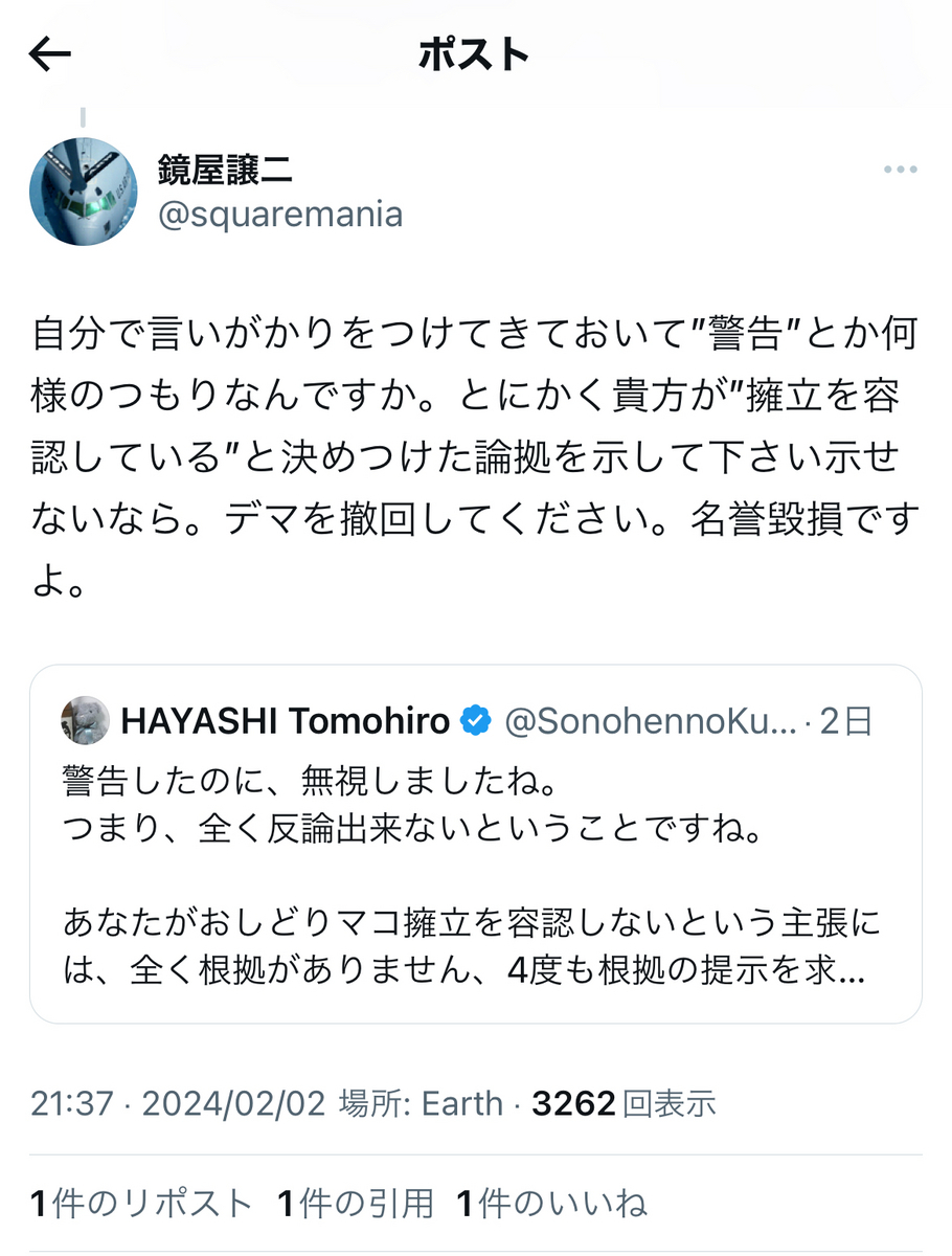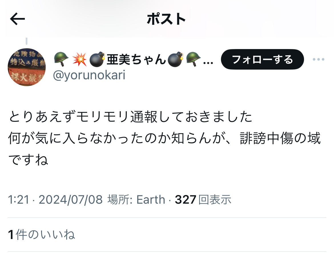 栄えある一回目は、あろうことか、青識亜論氏の物騒な投稿に対する引用リツイート(現リポスト)であり、お二方の常日頃の物言いといい、良くも悪くも桁外れの「行動力」等も鑑みると……非礼を百も承知で申し上げますが、冗談には聞こえないのが実情かと存じます。