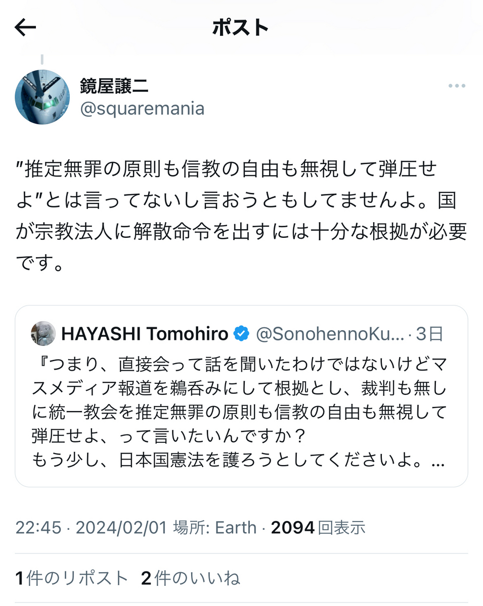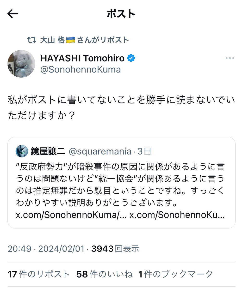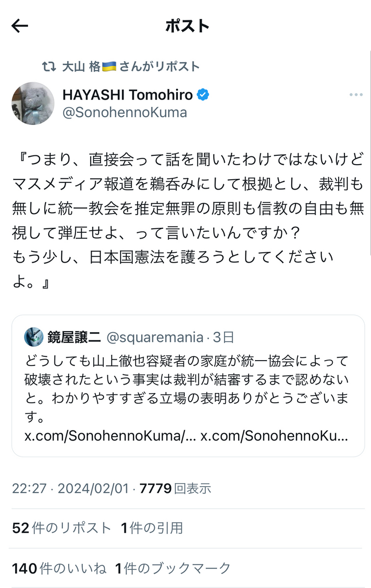 林氏もまた、伊藤剛・大山格両氏らとほぼ同様に、尊師への好意的なポスト(又はリポスト)をする一方、徹底した反・反統一協会のスタンスを貫いていることも一目瞭然かと考えられます。