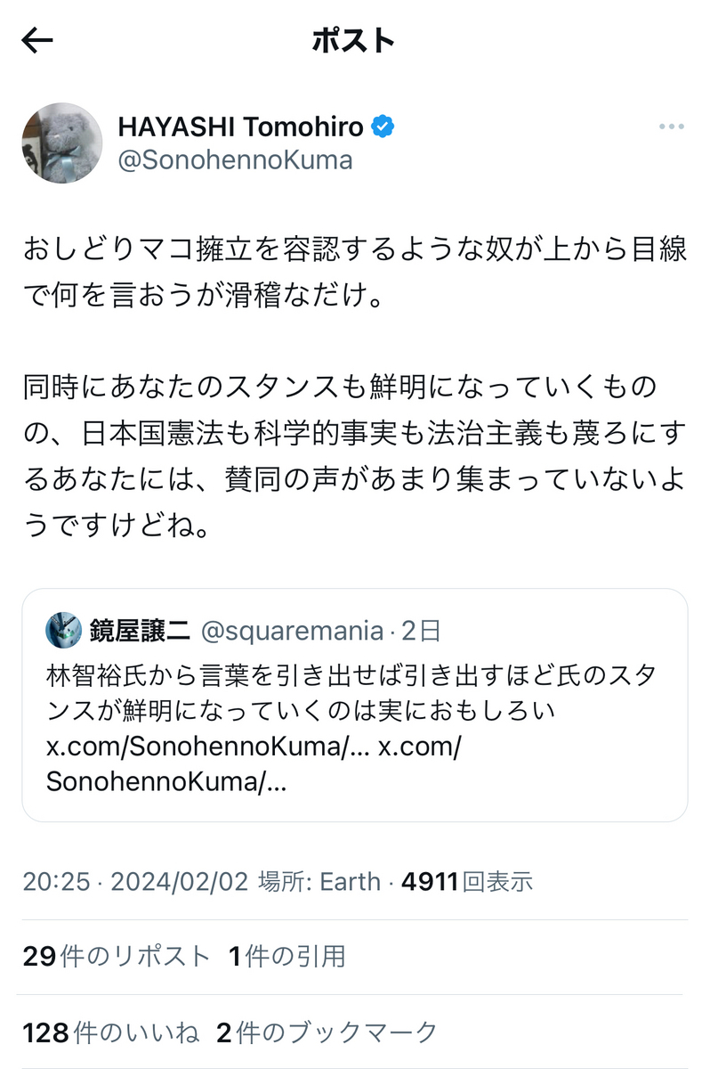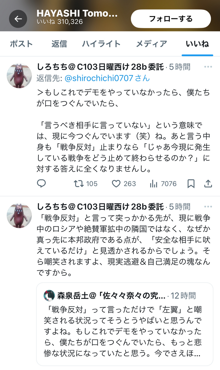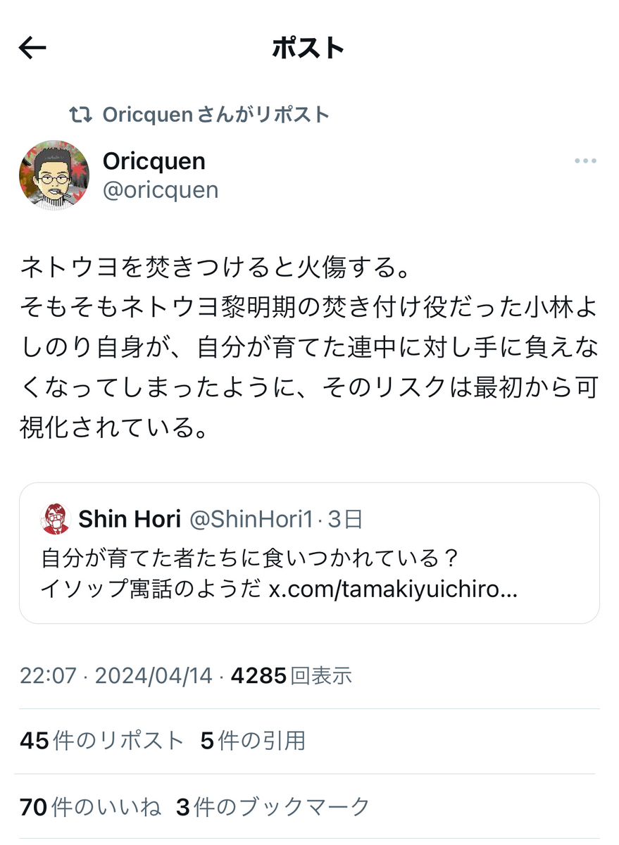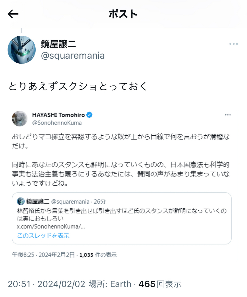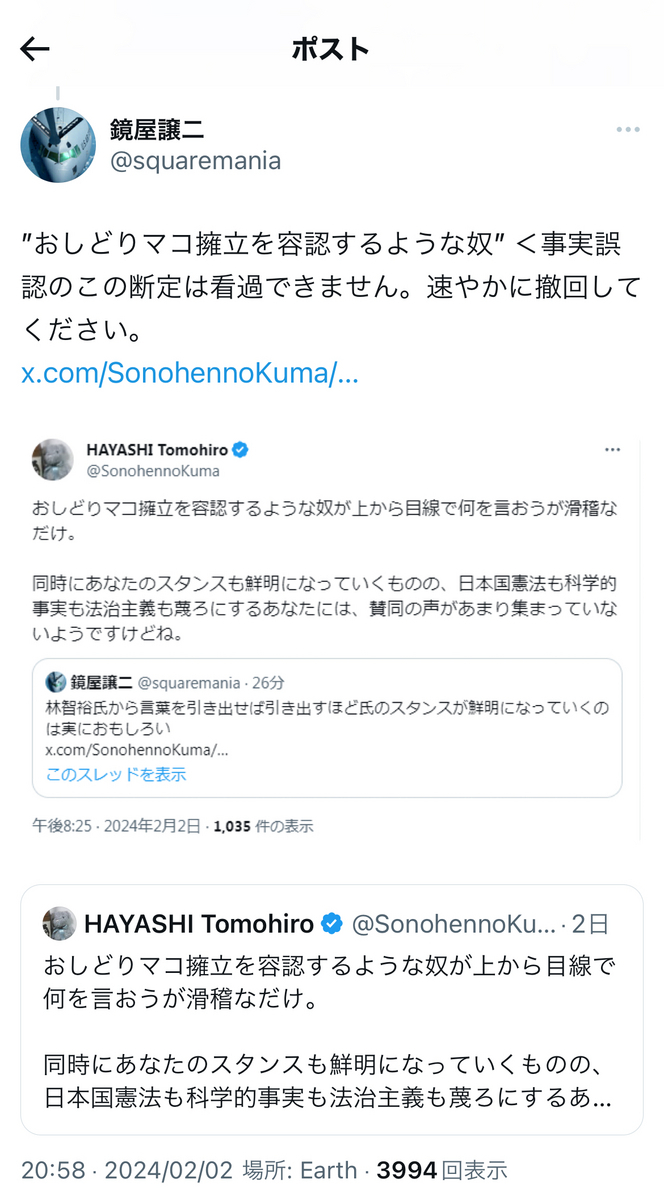 というか、林氏の論調は……基本的にシーライオニングめいた話法と、ポジショントークになりがちな傾向があり、ある意味、炎上柱とほぼ同様に会話のキャッチボールが続かないようですが。