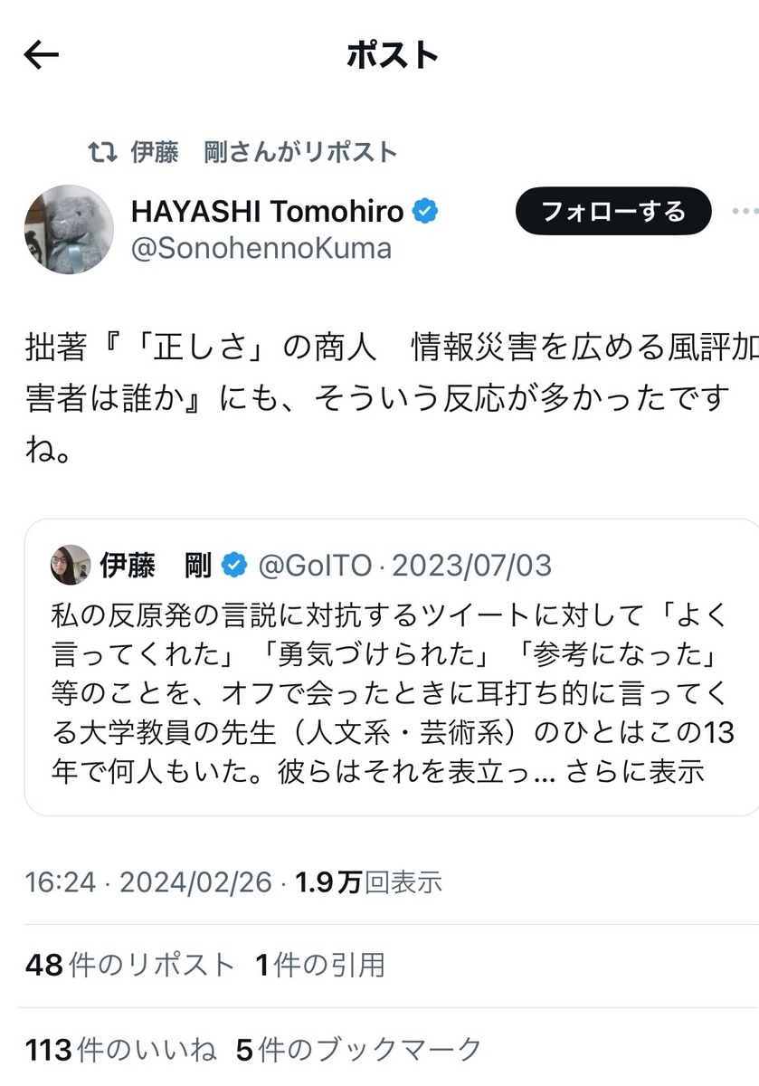 いやはや、恐縮ながら……百億歩譲って、フェミ・リベラル、とりわけ北村紗衣・隠岐さや香両氏らオープンレター関係者が、同じようなことをしたと仮定した場合、恐らく、伊藤剛氏のご反応は(以下略。