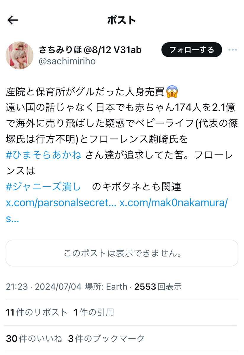 例の根拠不明なフローレンス陰謀論も振りかざしており、さちみ氏の発言等を何の検証もしないまま、リポストなどで拡散するのは……如何なる理由であれ、くれぐれもご注意下さい。