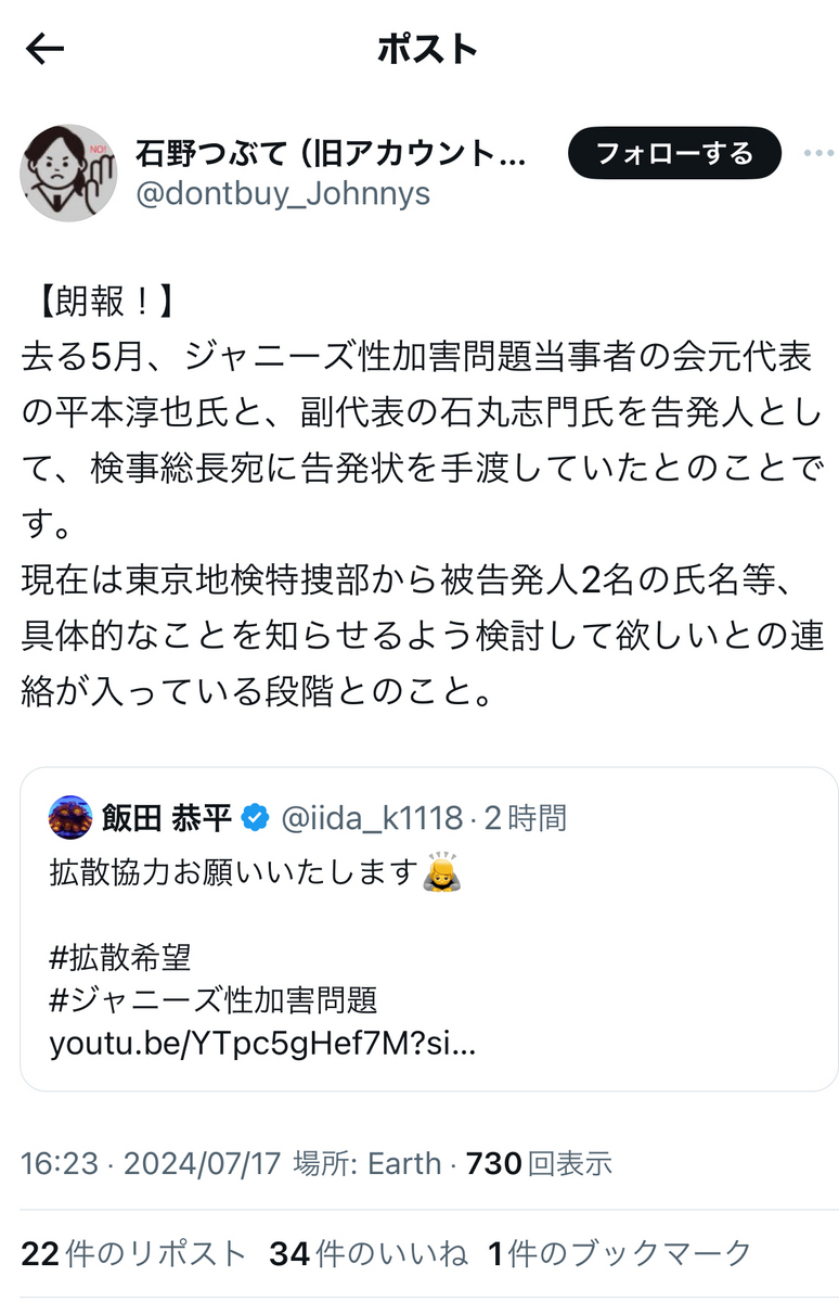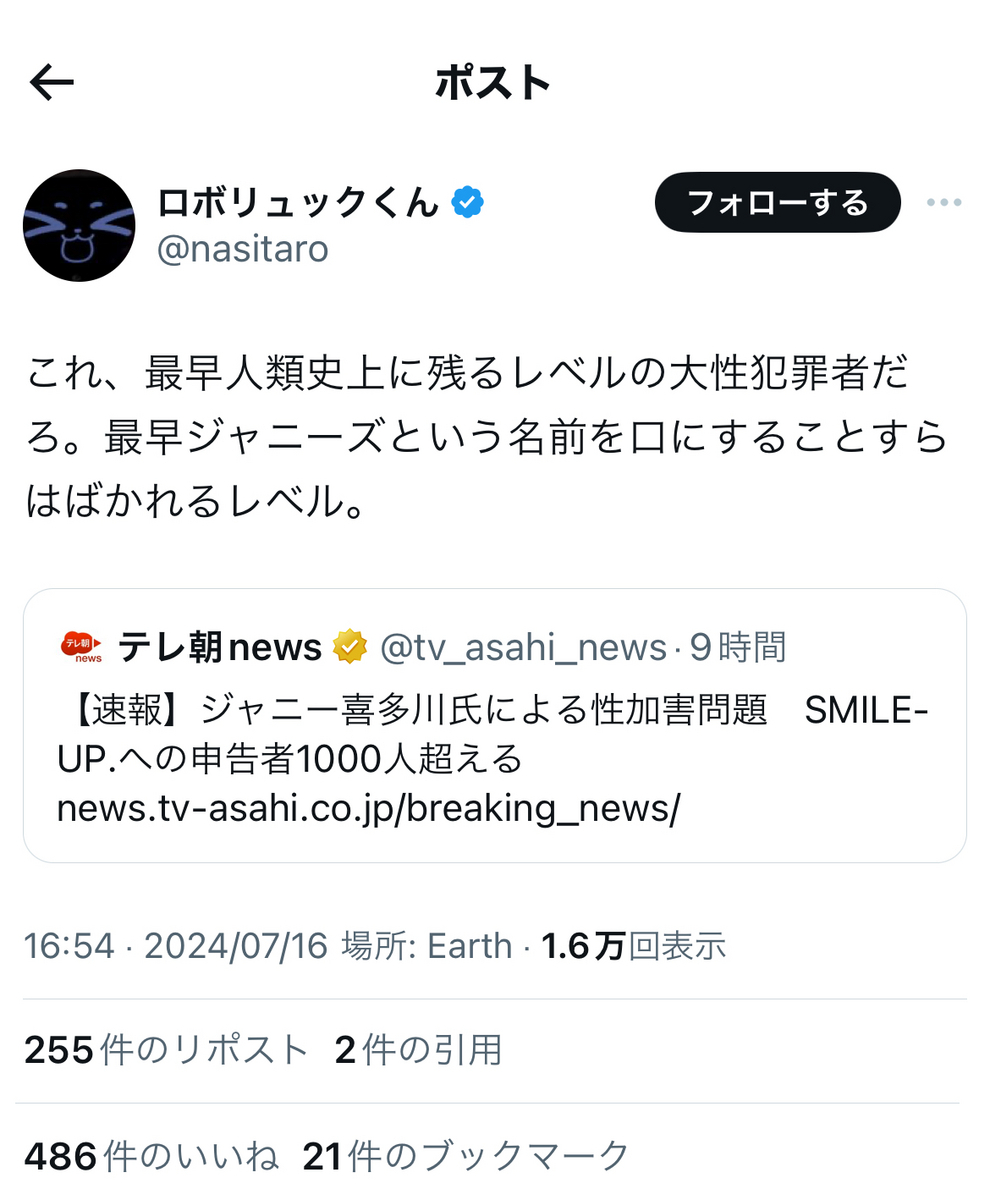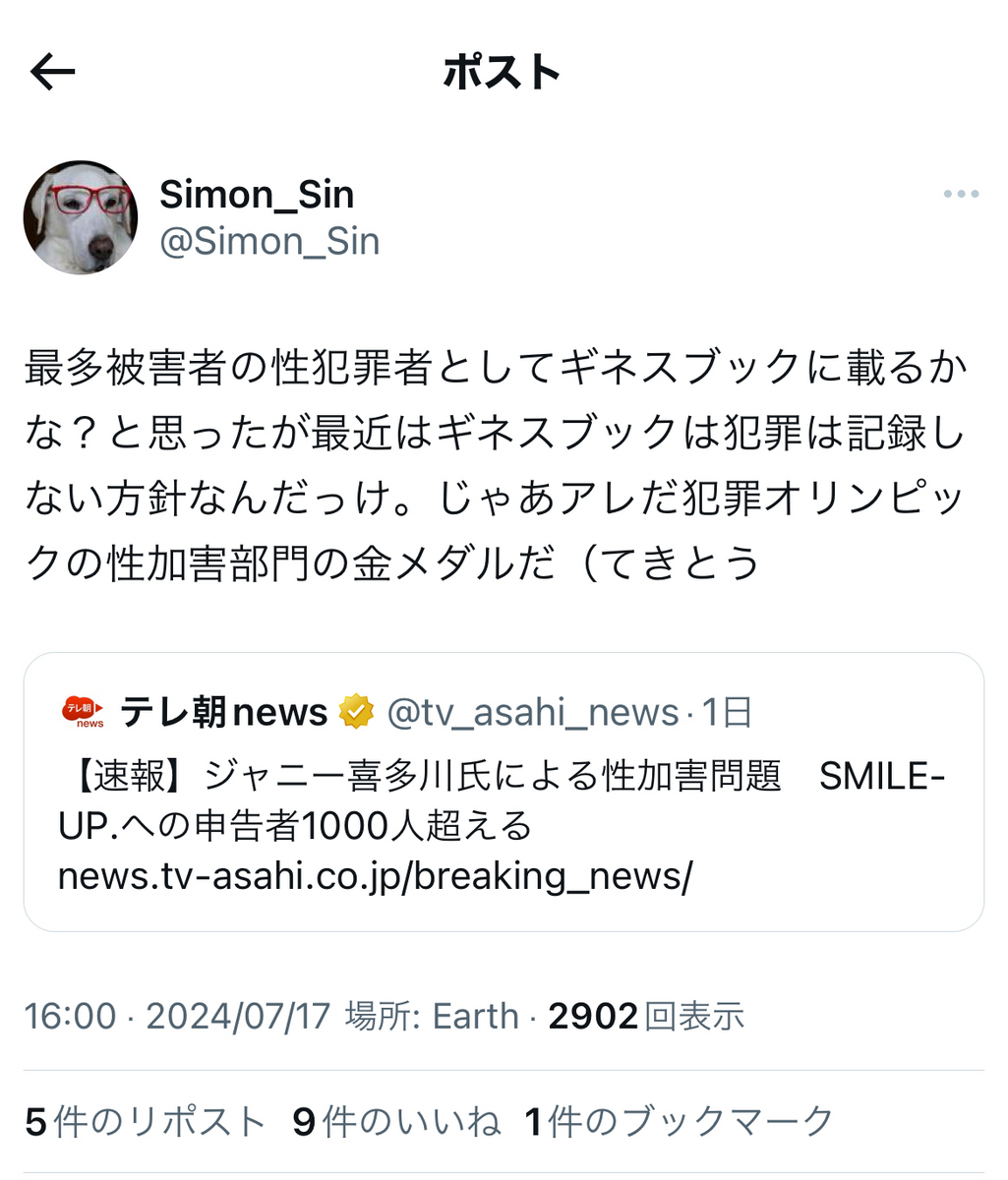 ジャニーズ擁護、ジャニー喜多川の性加害事件の被害者たちへの「被害者非難」等で、ジャニウヨ(?)界隈でも人気沸騰中らしい炎上柱ですが……同事件の被害者の総数が、遂に1千人を突破したというニュースには、意外にも少しだけショックを受けているようでした。