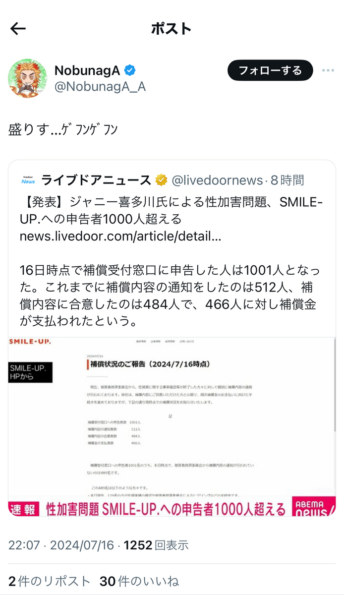 ・ジャニー喜多川の性加害事件を巡って、16日、旧ジャニーズ事務所こと『SMILE―UP.』社は、補償受付窓口への被害申告者数が1,001人と、名乗り出た被害者の総数が3桁の大台を突破してしまったことを発表しておりました。