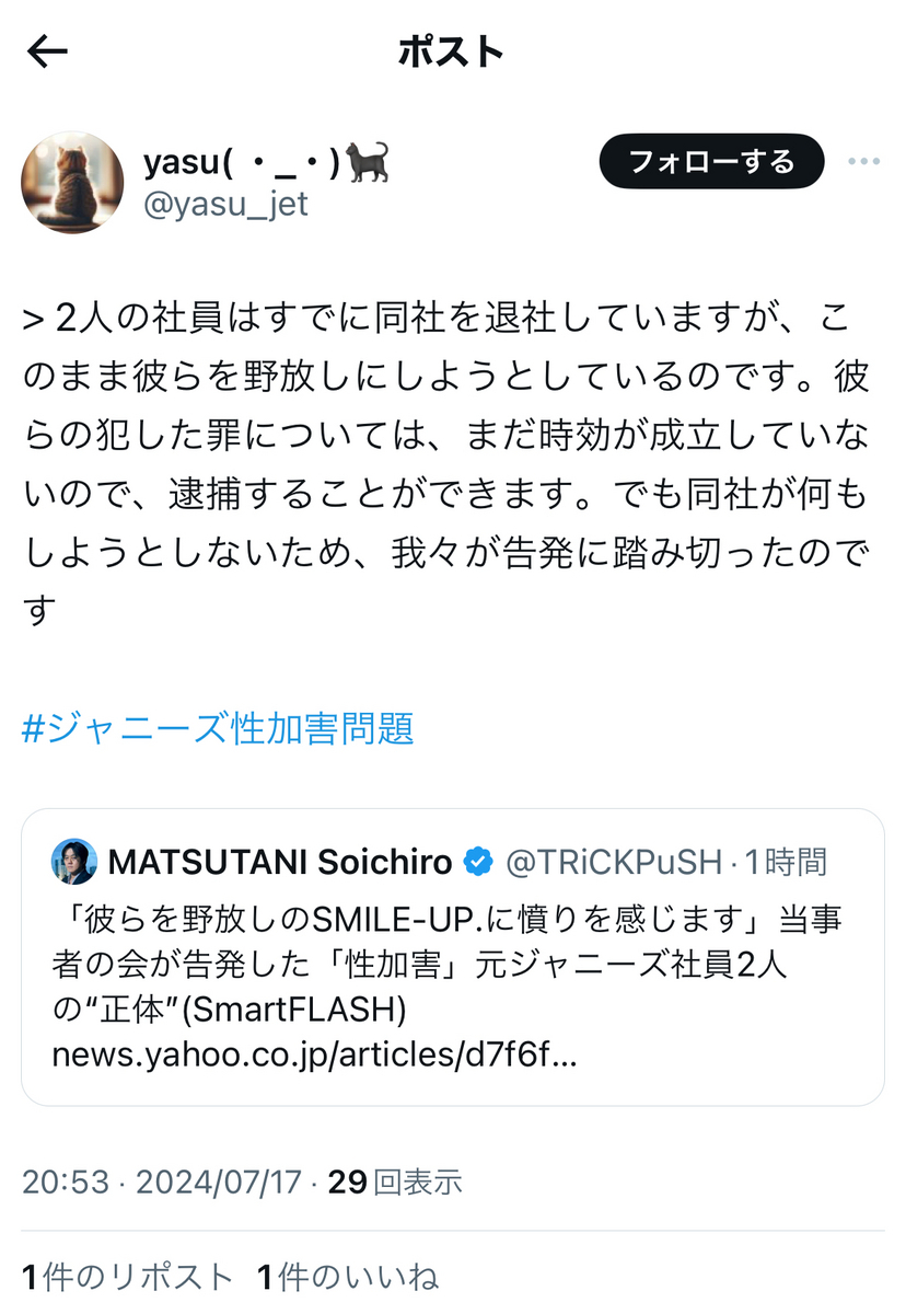 他方、ジャニー喜多川以外の加害者……元ジャニーズ事務所社員2名による性加害については、新展開があった模様ですが。