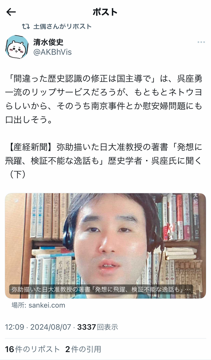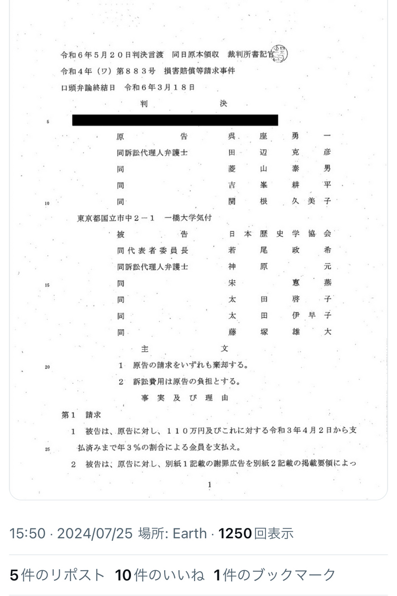 上記の日本歴史学協会を相手取った名誉毀損訴訟に於ける、呉座氏サイドの全面敗訴(一審)については……少し違うようですが。