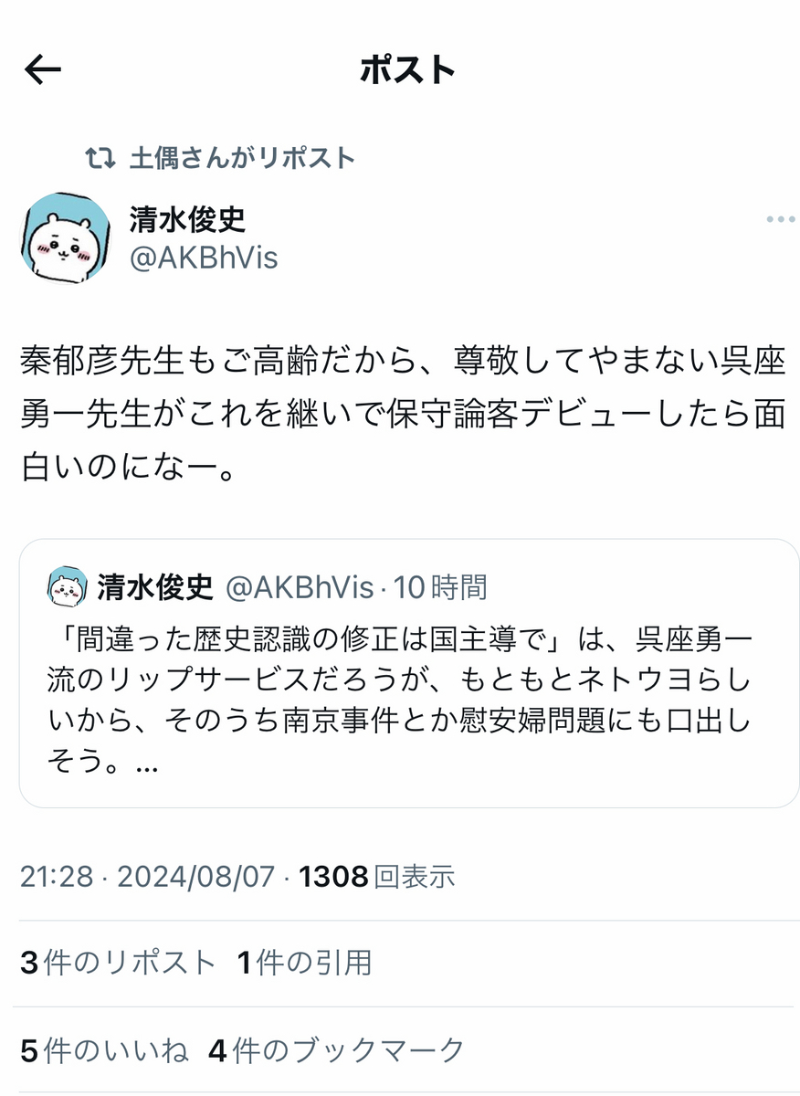 別件で恐縮ながら、実のところ、呉座氏の「国語力」については……呉座騒動以前から、山本五十六の書簡の解釈などを巡って、一部で疑義が呈されていたことも記憶に新しいですが。
