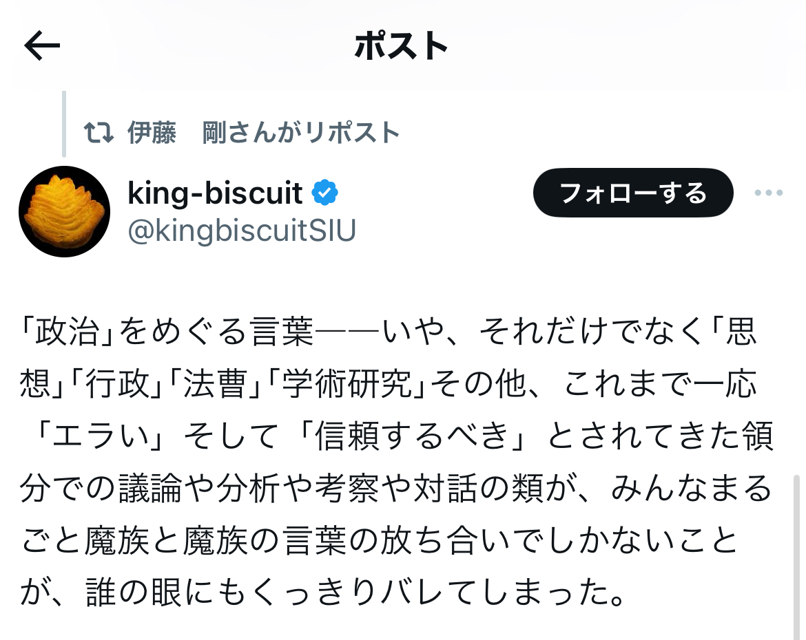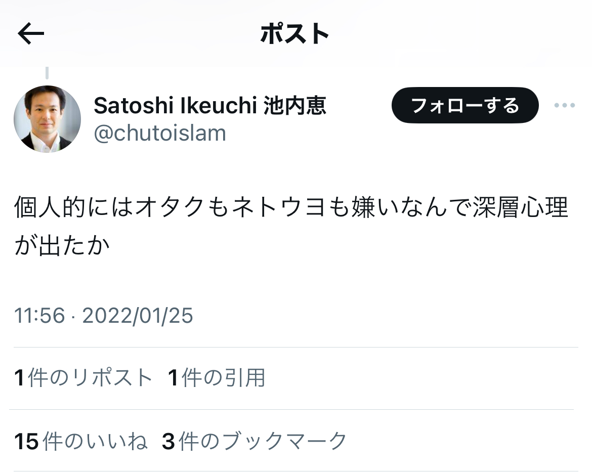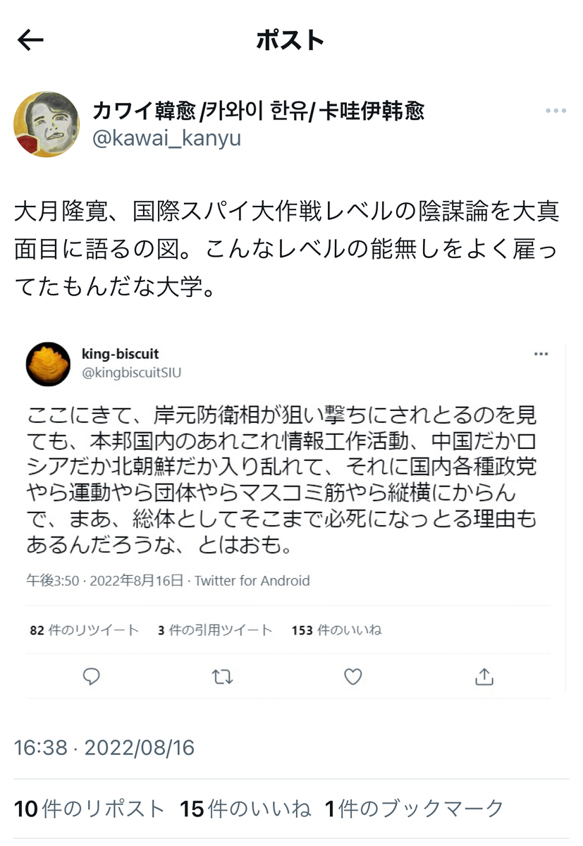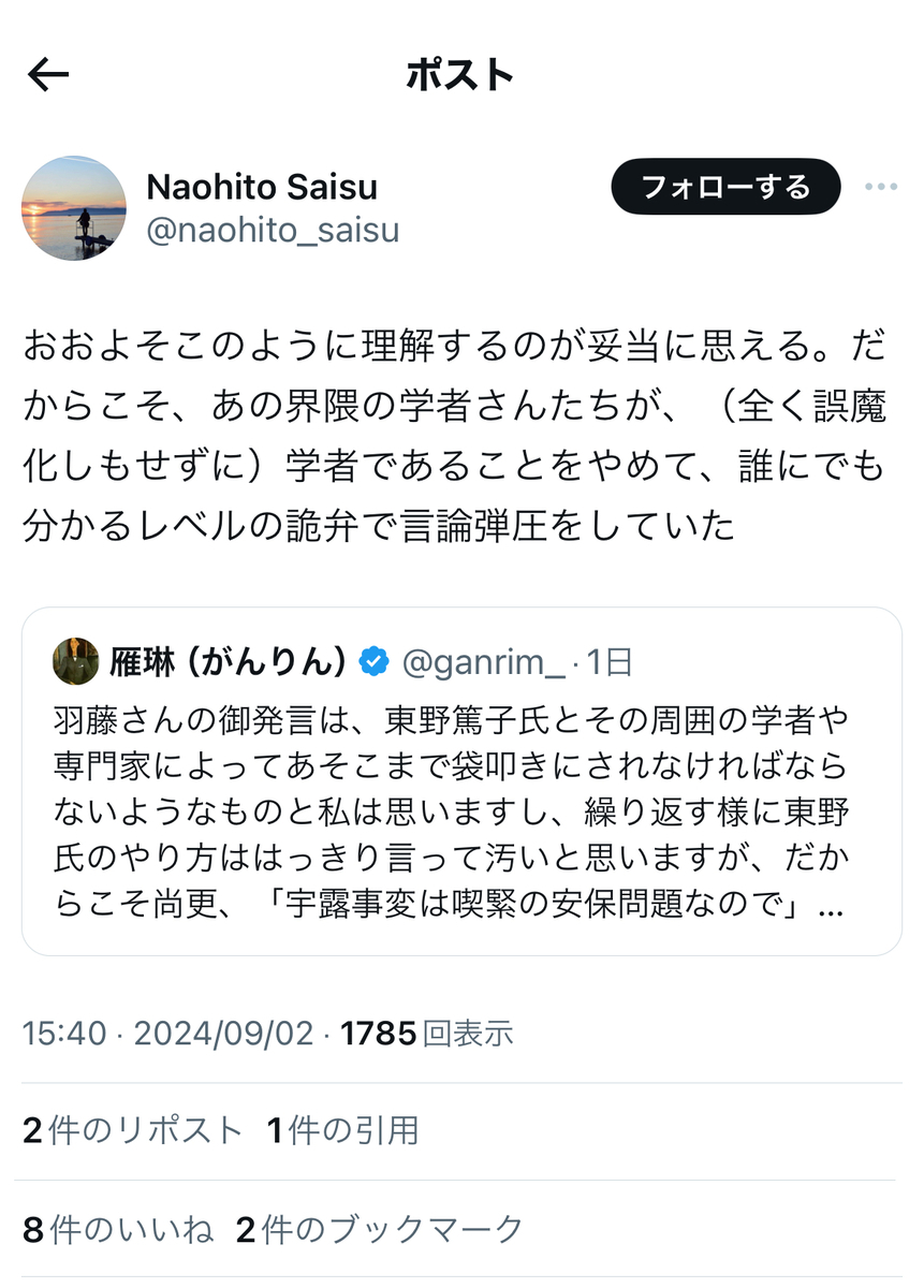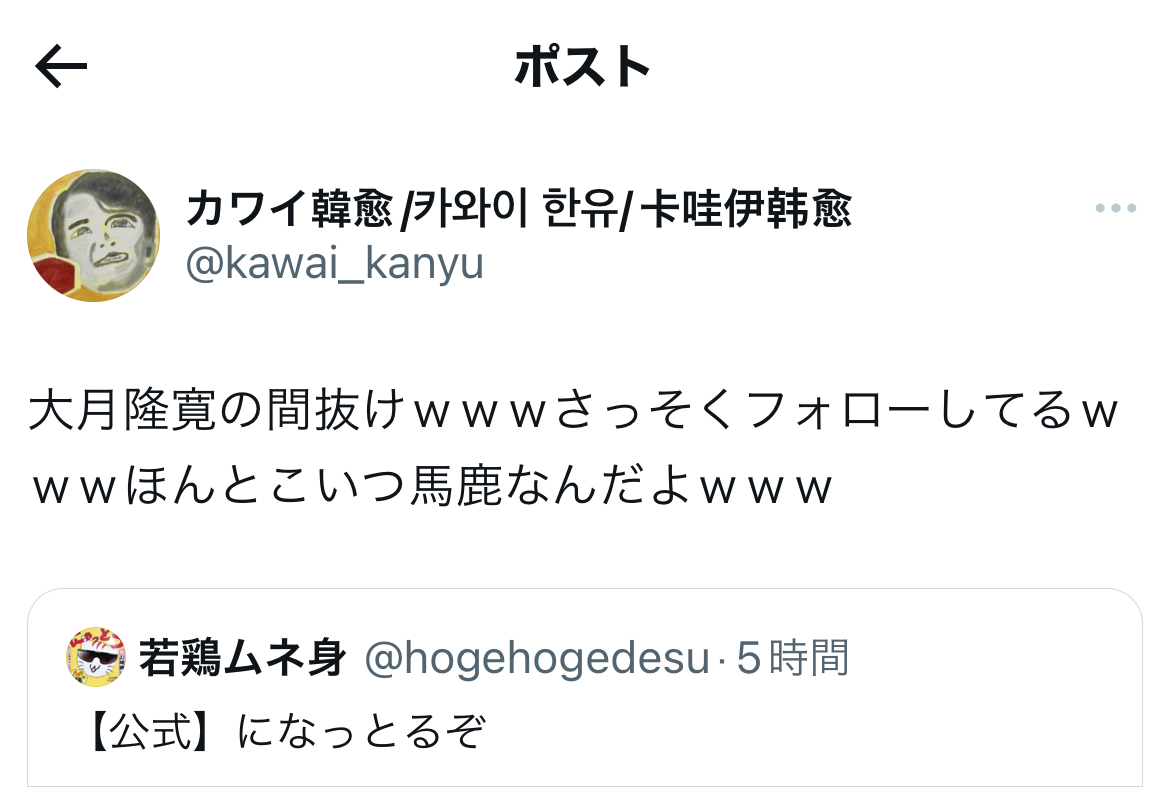 という指摘もありますが、事実、亀田センセイ=自称「ネット保守」「新保守主義者」「ネット右翼の代表格」のネット論客・HN【はむはむ】時代の師匠筋でもあったJSF氏を始めとして、池内恵氏による羽藤氏ご本人へのド派手な「武勇伝」に便乗していた感もあるkous、かずや18歳らセンセイご本人の「御伽衆」も……東野氏ご本人が鍵垢モードになった途端、風向きの変化を察したのかは不明ですが、東野氏のファンネルとしての機能を停止した模様です。