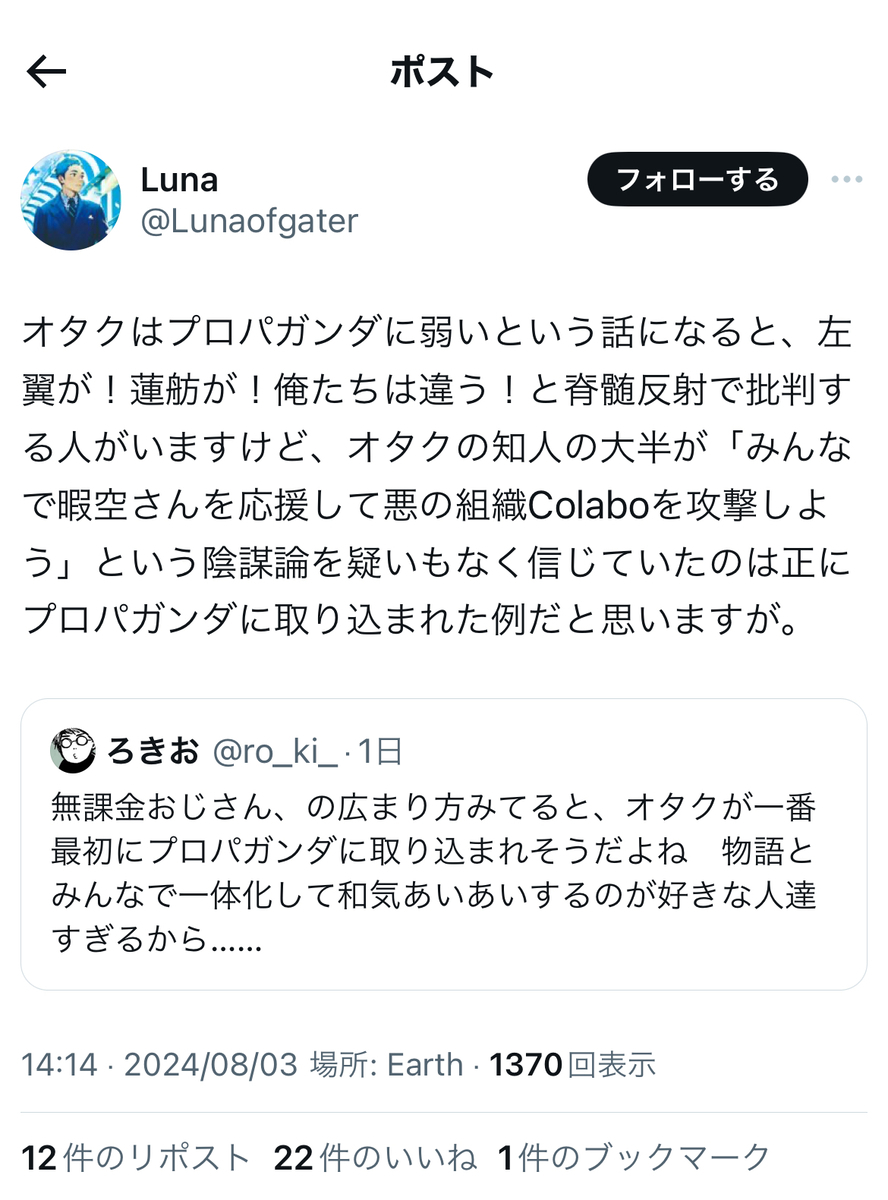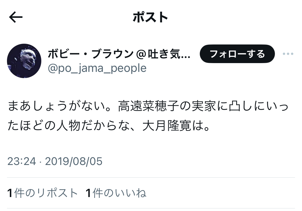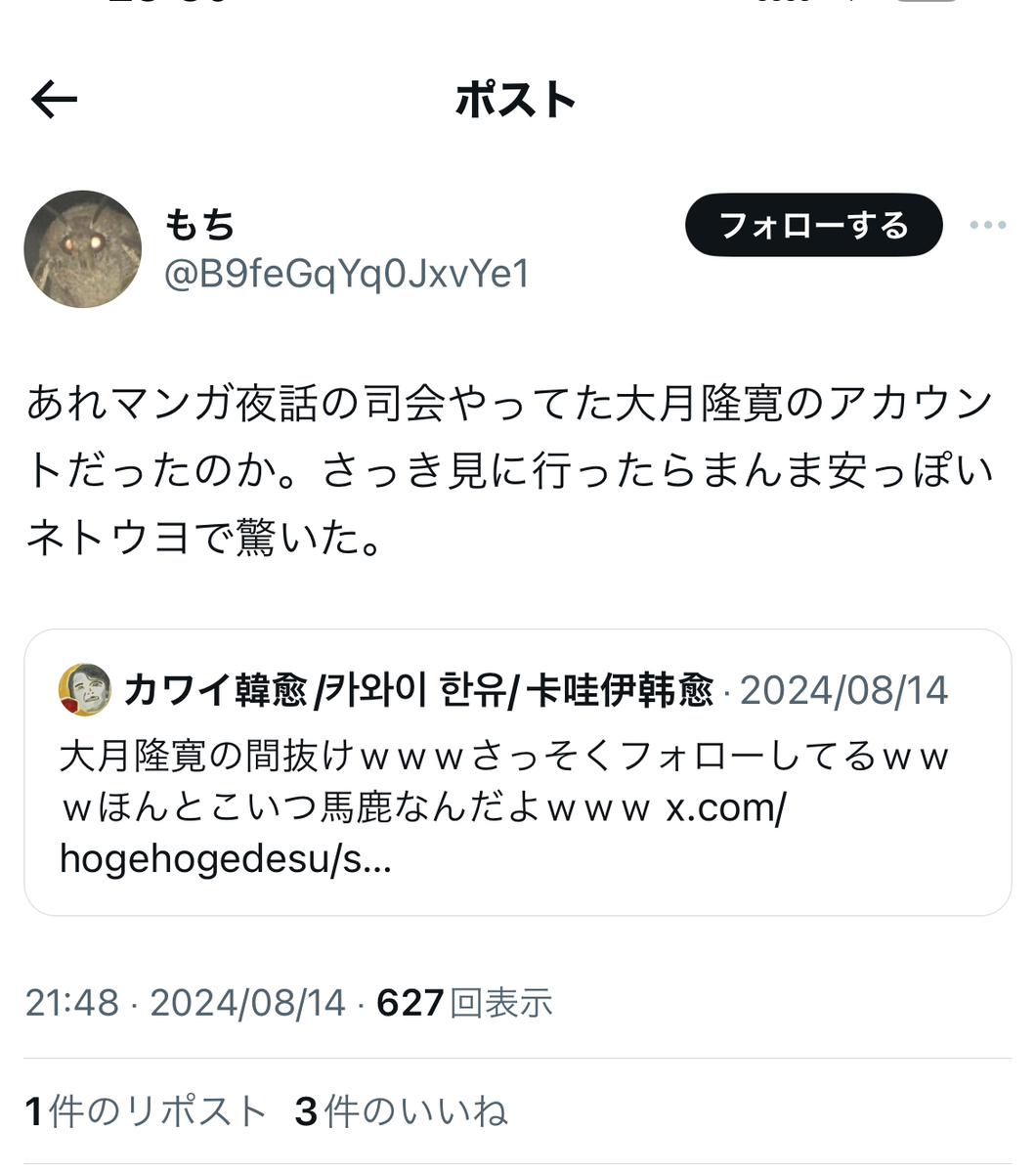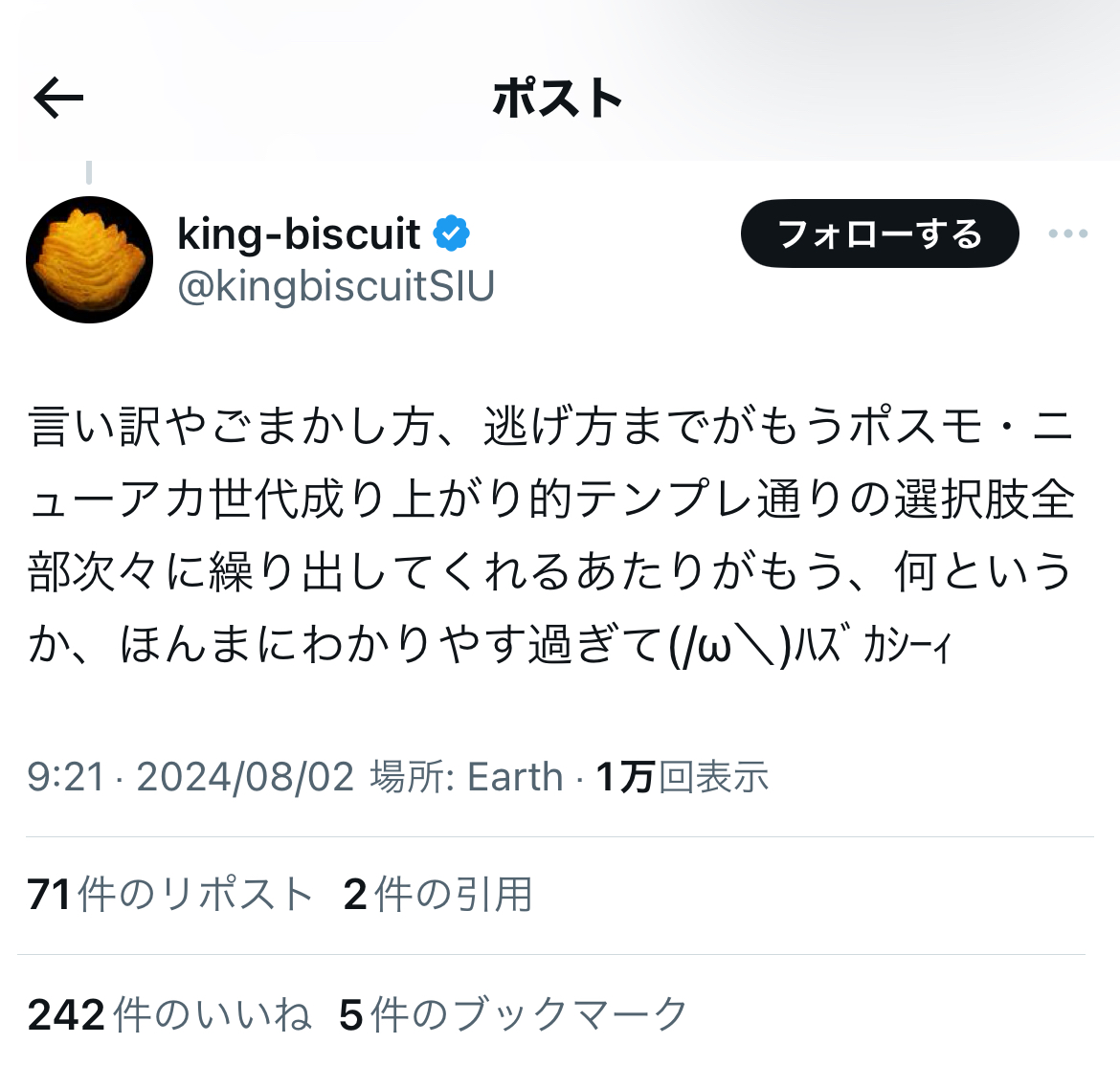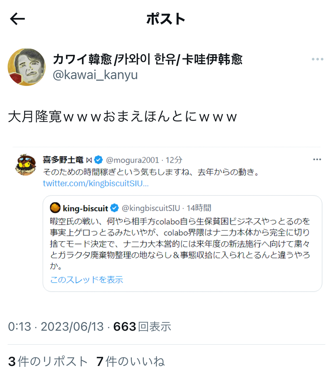 という指摘もありますが、事実、亀田センセイ=自称「ネット保守」「新保守主義者」「ネット右翼の代表格」のネット論客・HN【はむはむ】時代の師匠筋でもあったJSF氏を始めとして、池内恵氏による羽藤氏ご本人へのド派手な「武勇伝」に便乗していた感もあるkous、かずや18歳らセンセイご本人の「御伽衆」も……東野氏ご本人が鍵垢モードになった途端、風向きの変化を察したのかは不明ですが、東野氏のファンネルとしての機能を停止した模様です。