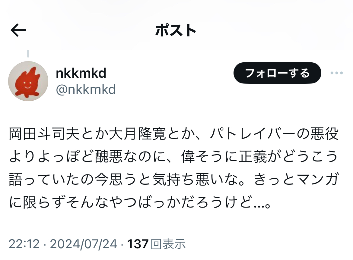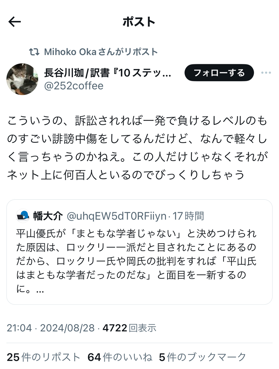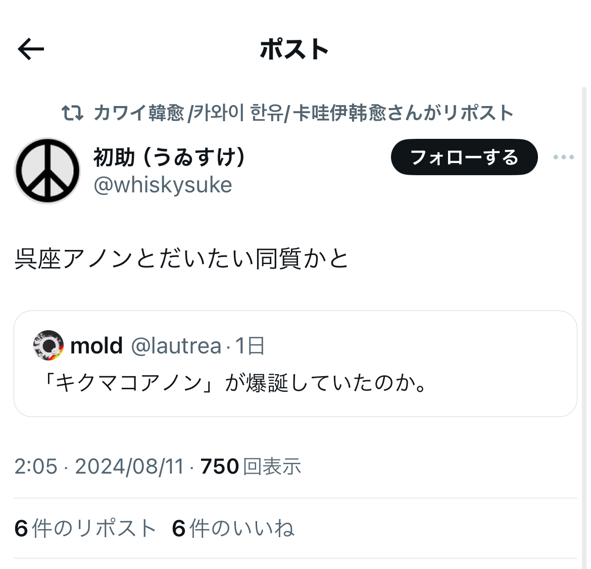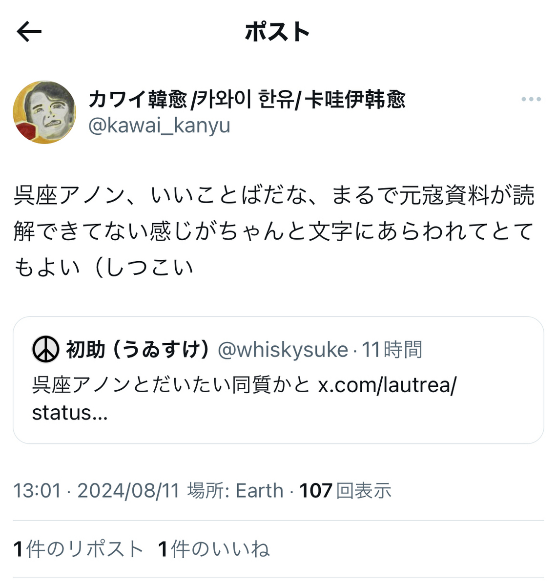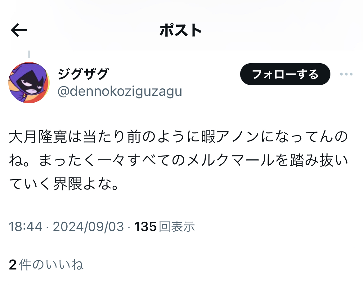 という指摘もありますが、事実、亀田センセイ=自称「ネット保守」「新保守主義者」「ネット右翼の代表格」のネット論客・HN【はむはむ】時代の師匠筋でもあったJSF氏を始めとして、池内恵氏による羽藤氏ご本人へのド派手な「武勇伝」に便乗していた感もあるkous、かずや18歳らセンセイご本人の「御伽衆」も……東野氏ご本人が鍵垢モードになった途端、風向きの変化を察したのかは不明ですが、東野氏のファンネルとしての機能を停止した模様です。