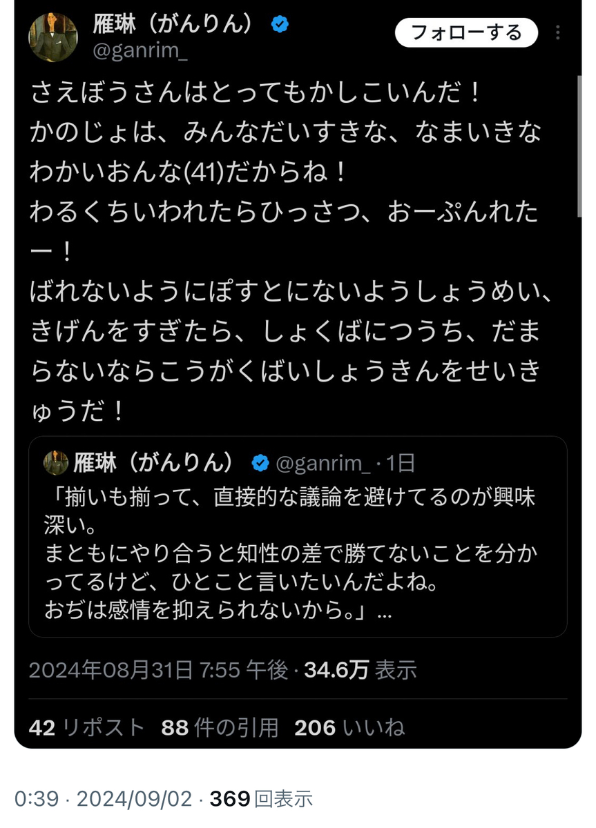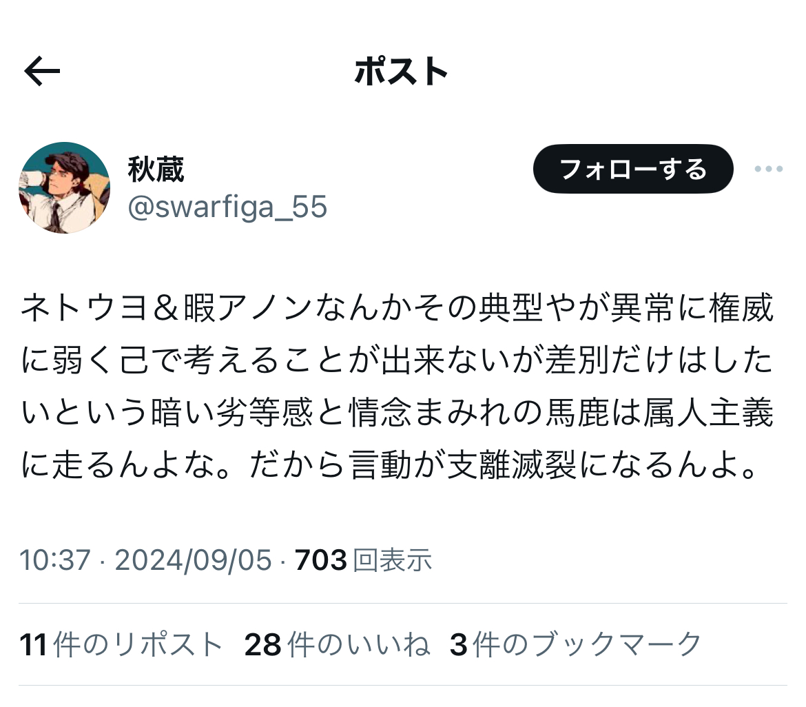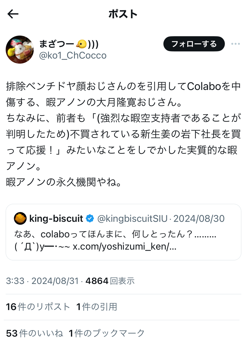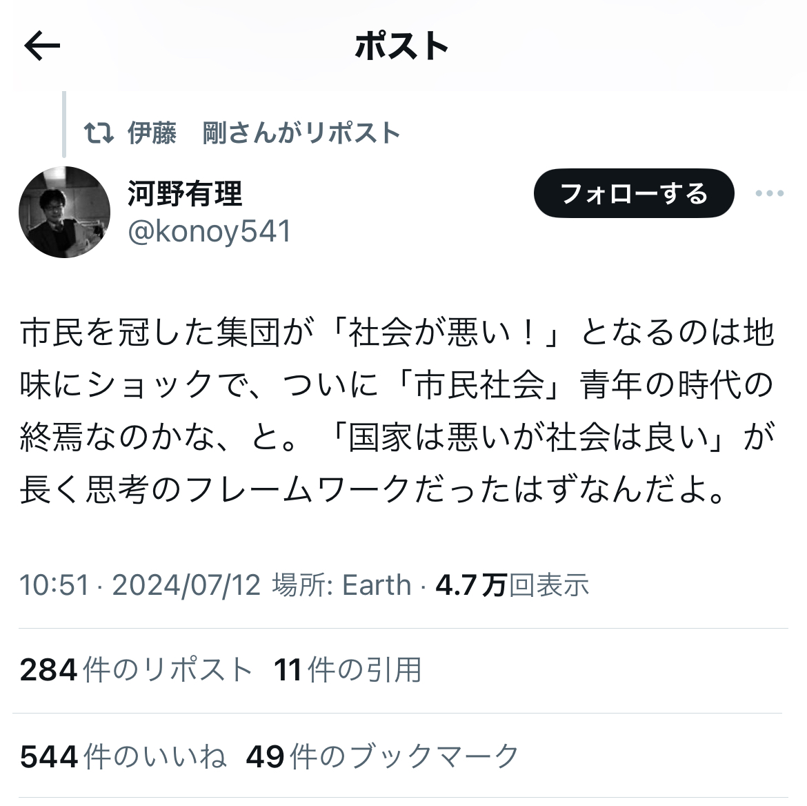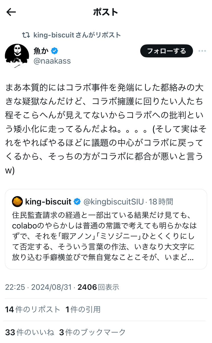 という指摘もありますが、事実、亀田センセイ=自称「ネット保守」「新保守主義者」「ネット右翼の代表格」のネット論客・HN【はむはむ】時代の師匠筋でもあったJSF氏を始めとして、池内恵氏による羽藤氏ご本人へのド派手な「武勇伝」に便乗していた感もあるkous、かずや18歳らセンセイご本人の「御伽衆」も……東野氏ご本人が鍵垢モードになった途端、風向きの変化を察したのかは不明ですが、東野氏のファンネルとしての機能を停止した模様です。