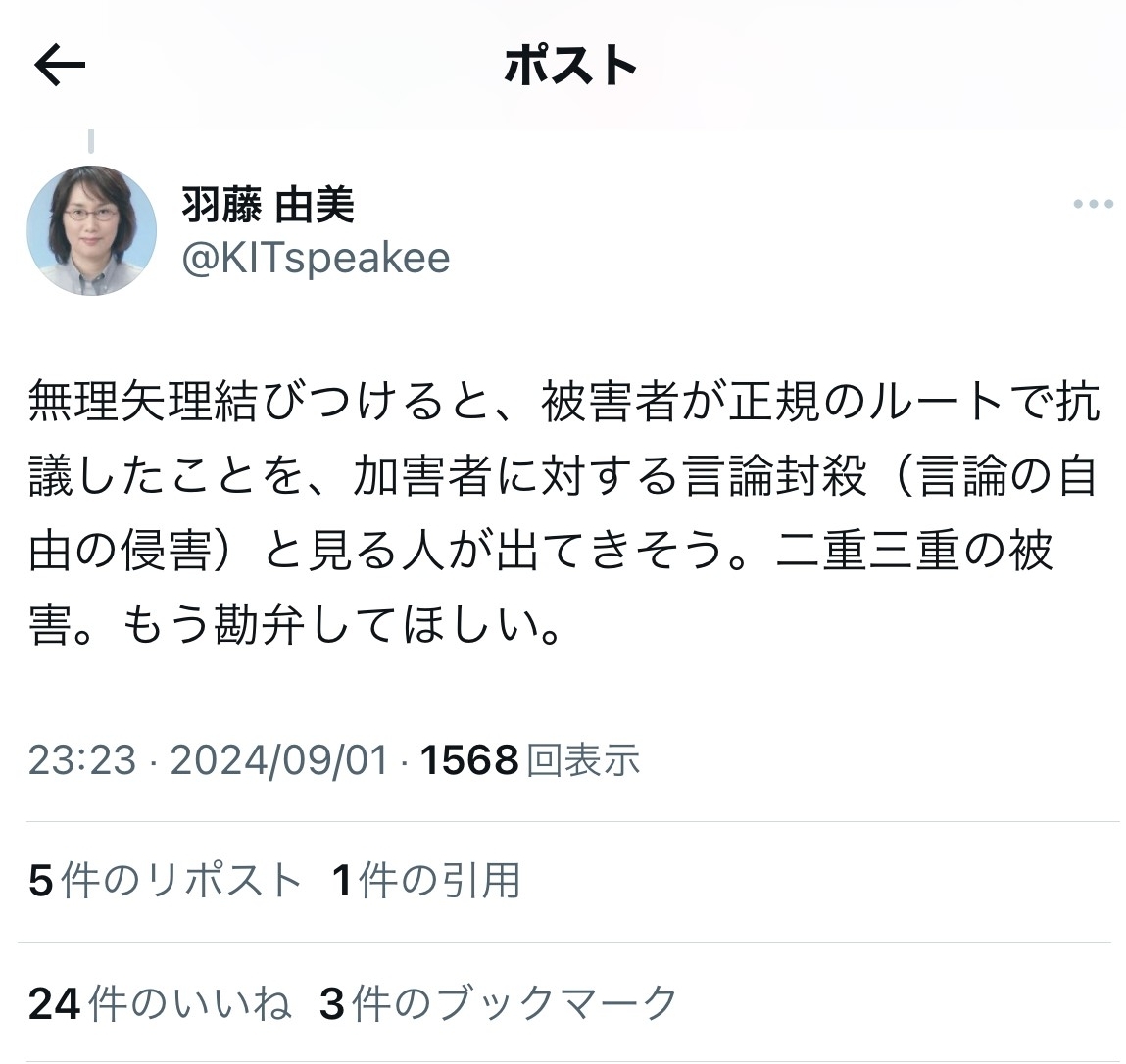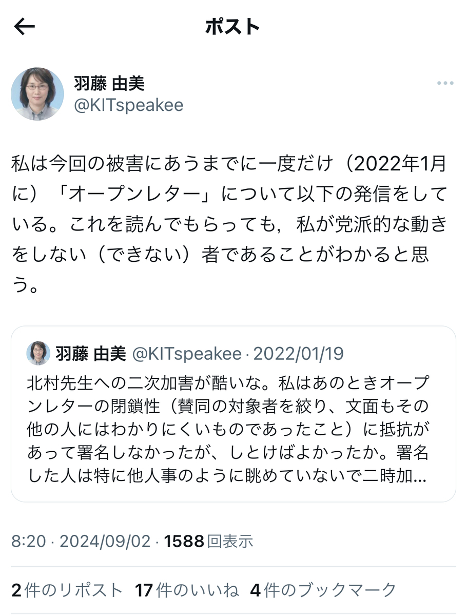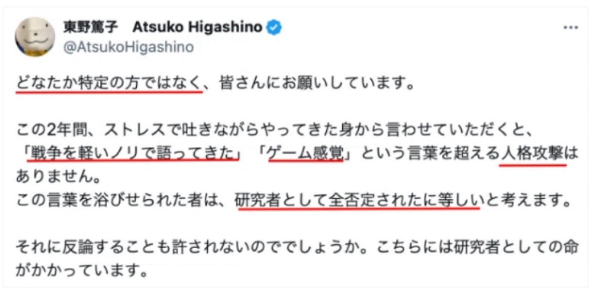 「羽藤さんが声を上げたことで、JSFなどの馬鹿げたツイートがピタリと止んだ。その後は東野篤子氏に関して、どのような分析・批判をしようと、嫌がらせツイートはやってこなくなった。このことは書いておく。」