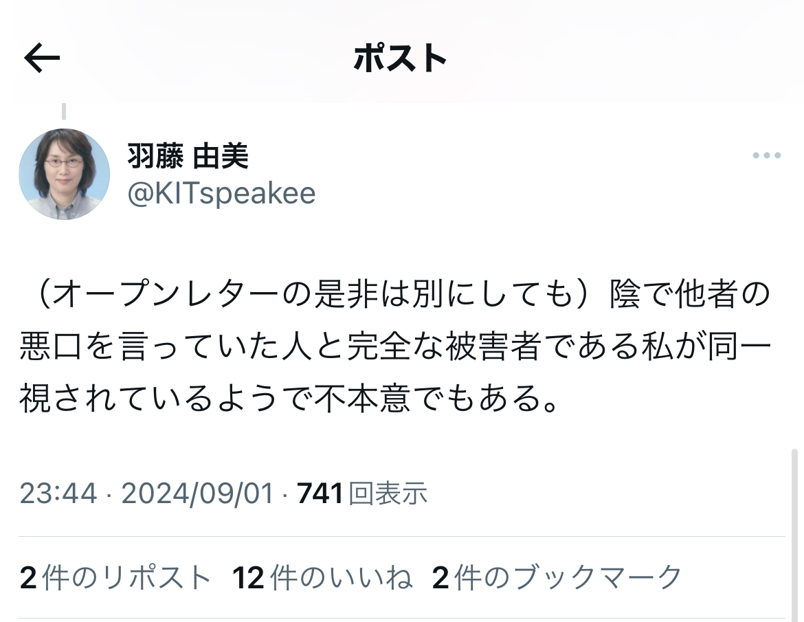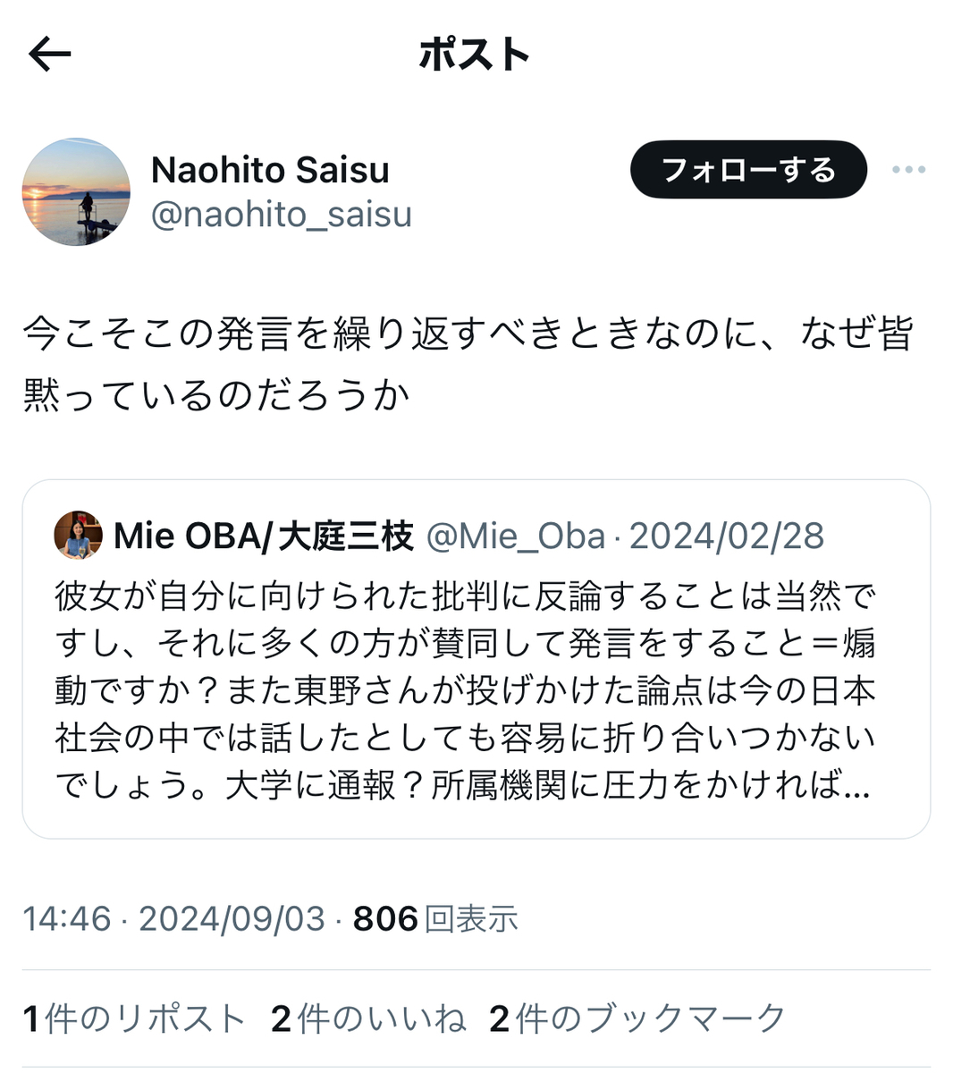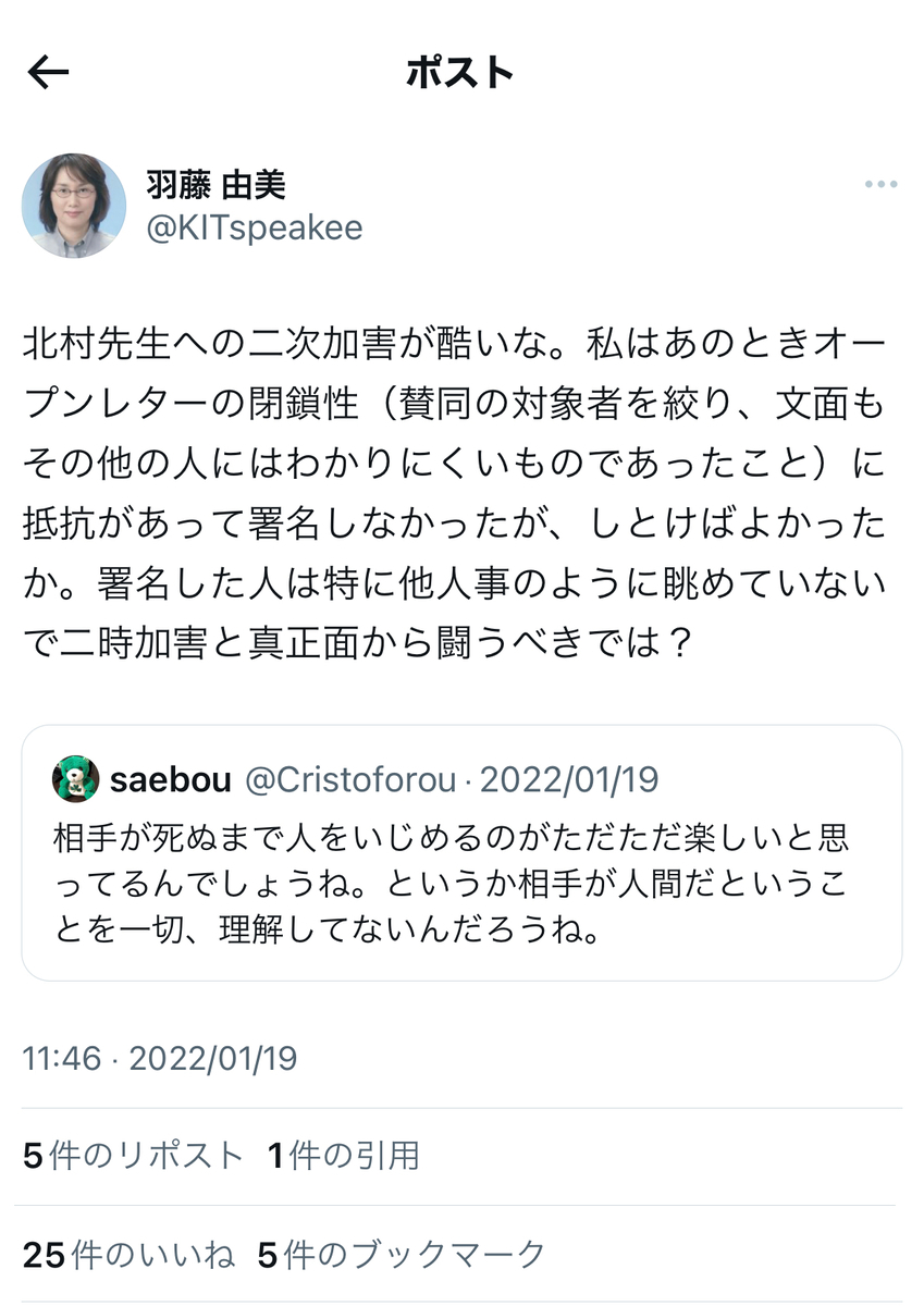 「羽藤さんが声を上げたことで、JSFなどの馬鹿げたツイートがピタリと止んだ。その後は東野篤子氏に関して、どのような分析・批判をしようと、嫌がらせツイートはやってこなくなった。このことは書いておく。」